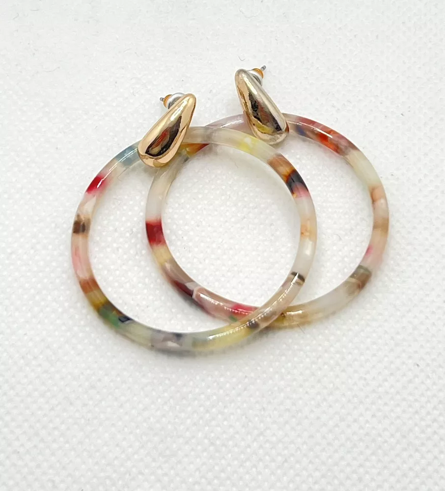 Add a touch of beauty and fashion to any occasion with these stunning resin hoop earrings. The earrings feature a push back closure and come in a multicolor design that is sure to catch the eye. Perfect for any fashion jewelry collection, these earrings are made from high-quality resin and are sure to last. Whether you're dressing up for a special occasion or just want to add a pop of color to your everyday look, these earrings are the perfect accessory. With their unique design and beautiful multicolor finish, they are sure to make a statement. Note: This pair of earrings are very lightweight in great condition! Worn only once! Thank you for stopping by!
