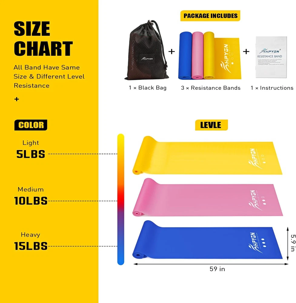 < ul >< li > therapy bands < li > Imported < li > 2024 Upgrade Exercise Band : Each Physical Therapy Bands measures 4 . 9 foot long X 6 Inch wide . A superior band product for resistance training and rehabilitation , provides both positive and negative force on muscles and joints , stretches tones and conditions all major muscle groups . Our bands are scent free and latex free without a sticky surface , is ideal for conditioning & rehabbing muscles . < li > Suitable for Many Exercises : People Love it Because it is exercise bands are ideal for assisting in Sports Athletes , Seniors , Physical Therapy , Rehabilitation , Wrestling , Bodybuilding , Pilates , Yoga , Kickboxing , Crossfit and so on . Simple yet effective workouts will increase strength & improve motion . < li > Easy to Use & Carry : The resistance band set comes with a storage bag , easy to carry anywhere , in , home , gym , etc . Simple & easy to use product for upper & lower body exercises that can be performed anywhere , is ideal for conditioning & rehabbing muscles . < li > Different Level of Resistance : The resistance bands for working out is divided into 3 different levels of resistance : Yellow band ( Light , 0 . 35mm ), Pink band ( Medium , 0 . 45mm ), Blue band ( Heavy , 0 . 55mm ). Never worry about the Physical Therapy Bands too hard , easily switch between the 3 levels to your preference anytime . < li > Suitable Users : This physical therapy band is suitable for a wide range of individuals , including athletes , regular exercisers , the elderly , rehabilitation trainers . It can be utilized in various activities such as physical therapy , rehabilitation , wrestling , bodybuilding , Pilates , yoga , and more . Simple yet highly effective exercises with it can help build strength and accelerate recovery . < br >< div > < div > < h2 > Product Description < div > < div > < div > < div > < p > Elevate Your Fitness Game with the Ultimate Resistance Band Set : Your Ideal Companion for Full - Body Workouts , Anytime , Anywhere !