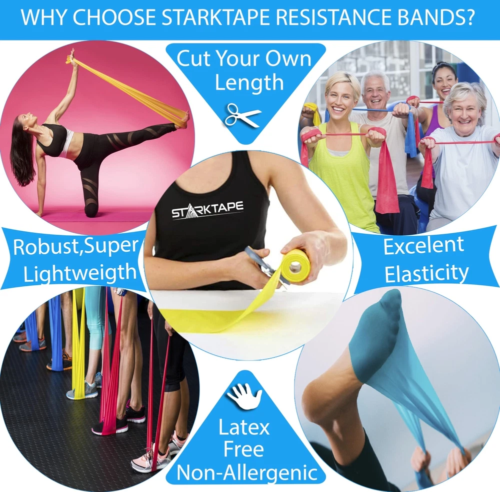 Non-allergenic, Non-Latex, Skin-friendly professional resistance bands. Made with premium TPE, no scent, and no powder, the elastic resistance band meets the needs of patients, practitioners, and personal users with latex allergies. Muscle toning, strength, flexibility improvement, physical therapy, and rehabilitation are just a few benefits of the perfect training Do it yourself, 24 ft (8 Yards) long by 6 inches wide, customizable roll. Choose the strength you want, from beginner to advanced, with 5 color-coded progressive resistance levels: extra light, light, medium, heavy, extra heavy. The easily dispensable band can be cut and customized to any length desired and required for yourself or your client. Super lightweight, robust, resilient, and durable, with excellent elasticity, our resistance band will stretch, tone, and condition all major muscle groups: legs, arms, shoulders, back, upper and lower body. You can easily tailor your training depending on your strength, ability, and comfort. Use it in the clinic, in the comfort of your own home, at the gym, yoga, pilates studio, outdoor, or on the road. bulk exercise band is an easy and comfortable workout tool, proving to be the perfect choice for individual training, as well as for your Stretching, Physical Therapy, Rehabilitation, Bodybuilding, Wrestling, Losing Weight. Easy to use, from children to seniors. Whether you are a mom, a dad or a grandma, these fitness bands are right for you. People Love doing fun home exercises with the bands, they are a MUST item for staying in good health. Research has proven that resistance band provides as much benefit in fitness health and strength gains as weights training equipment. Add to cart now and see how do you feel after using resistance loop bands.