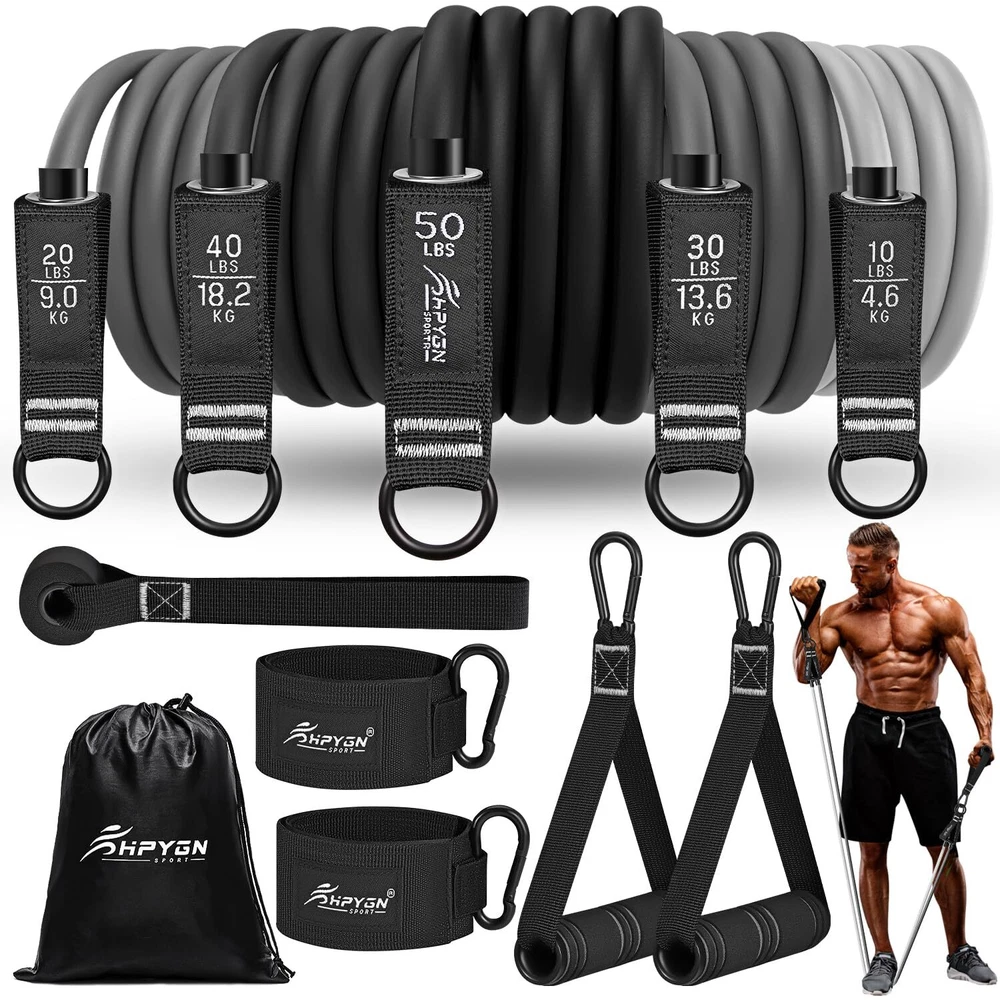 đȘThe Resistance Bands Set are ideal for Strength training Physical therapy Home workouts Body shaping Weight loss. â€YOUR PERSONAL HOME GYM â Got no time to head down to your local gym every day? With this set of resistance bands, you can enjoy a full body workout without even stepping out of your home. â€TRAIN DIFFERENT MUSCLE GROUPS â Use these fitness bands to perform rows, pulls, raises, and fly workout sets to exercise your arms, back, hips, legs, chest, and abdominal region. You can use resistance bands to replace dumbbells or weights. â¶New upgrade Strong rubber bands provide consistent resistance for every movement and give you enough flexibility to do hundreds of different exercises from beginner level through advanced. Virtually guarantees you'll never grow bored of your workouts. â¶The Resistance Bands Set can be integrated seamlessly to improve your muscular endurance, strength, balance, flexibility, body awareness and co-ordination. â¶Apart from body building and fat burning, the fitness set is also useful for injury rehabilitation, perfect for beginners to experts. â¶The foam handles are made of anti-slip, sweat absorbing material for a comfortable frip. The door anchor turns your door into your own gym in seconds. â¶At compact package size and light weight, the workout set will surely be a convenience and guarantee a much more interesting trip. â€100% Satisfaction! â Insanity Resistance Bands are built to last with high-quality materials and attention to detail and safety that exceeds market standards. Should your bands ever break, weâll replace them for you at no cost to you. ăNEW Upgraded Resistance Bands ă We have completely optimized this fitness band based on customersâ feedback, improved the traditional production process and adopted a new type of latex material to make the tension rope more durable and elastic, and to longer the life of product; and harmless to our health! We optimized all of the selective accessories, regardless of cost. ăNatural Latex bandsăExercise bands Set are made from 100% natural latex, extra thick high-grade silicon that will not snap, or deform. strong fabric and steel D buckles, With sweatproof and skidproof handles, Each band is double layered and carefully constructed to provide maximum resistance. ăFor Every Kind Of Workout ă Use workout band to intensify your muscles and build that perfect beach body.The resistance band set can be great with any popular workout like Yoga, Pilates and more. Or use them for general exercise, stretching, strength training, power weight programs. ă5 Different LevelsăThe resistance bands come with 5 different resistance level 10lbs, 20lbs, 30lbs, 40lbs and 50lbs in 5 different colors. You can use the bands independently or in any combination with a maximum resistance level of 150lbs.It comes with 5 latex resistance bands, 2 hand grips, 2 ankle straps, 1 door anchor, 1 workout poster, a carry bag. ăPlease rest assured to buyăWe are very confident in our products, if you like our products, please add them to your shopping cart, if you have any confusion, please contact us in time, we will provide you with a satisfactory solution, or If you have better suggestions for our products during use, please contact us, we can improve the products and provide consumers with better products.