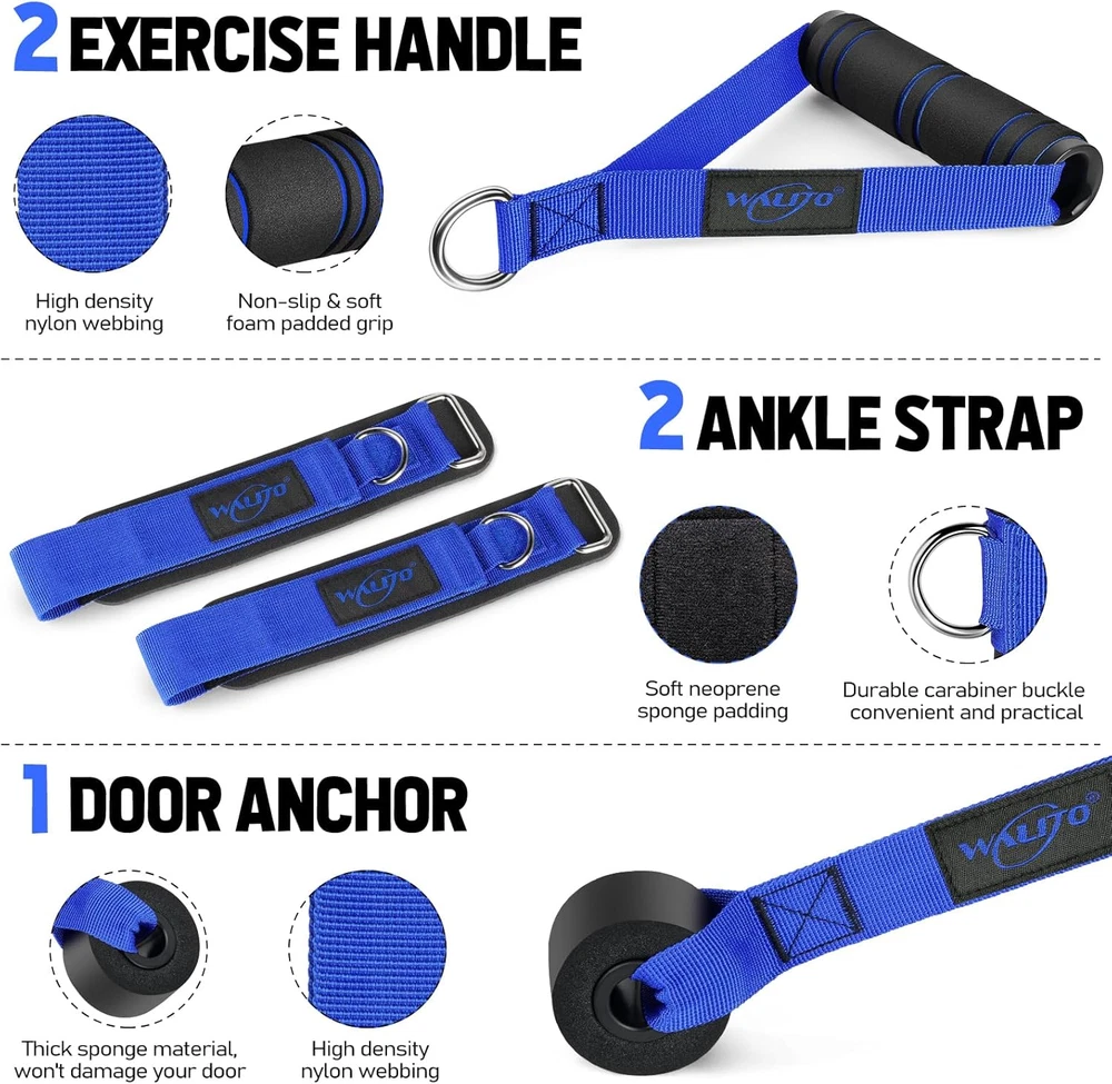 Store New Arrivals Add to Favorite View Feedback Contact Fast deliveries to the customer's home Quality customer service John Make the customers happy! Resistance Bands Set - Exercise Bands with Handles, Door Anchor, Legs Ankle Straps, for Heavy Resistance Training, Physical Therapy, Muscle Training, Yoga, Home Workouts Description Upgraded 150Lbs Resistance Bands Set: We designed the latest resistance bands set after market research and communication with fitness experts. Upgraded resistance bands made of 100% Natural Latex and high-density nylon webbing make it more elastic and durable, safe and reliable. The optimized accessories like handles use the highest quality materials in the market, can guarantee your training goes perfectly, effectively help you to train full body muscles, building your core. 5 Level Exercise Bands Set: Walito resistance bands set come with 5 different resistance levels: 10lbs, 20lbs, 30lbs, 40lbs, and 50lbs in 5 different colors, both in 51". You can use the bands independently or in any combination with a maximum resistance level of 200lbs, make you can clearly feel the muscle building up after every stretch. Perfect Multifunctional Sportiness: Walito resistance bands set are ideal for assisting in P90x, CrossFit, Yoga, Insanity, Pilates, Hot Yoga, and Beach Body workouts. Supports you in building your core strength through a variety of exercises, the most multifunctional choice for sports and fitness. Effective Creating the Ideal Body: Resistance bands training are extremely effective at burning fat and increase muscle strength, and also help you increase coordination, boost stamina, flexibility, range of motion, exercise different muscle groups, such as shoulder, arm, leg, butt etc. Perfect for all whether beginners or expert, boys or girls, men, women or children. Resistance Bands Set Includes :5 x Resistance Bands;2 x Ankle Straps;2 x Soft Handles;1 x Door Anchor;1 Massage ball ;1 x Carrying Bag ;1 Exercise Guidance Product Description Our Resistance Band Set - is made of high-quality materials to meet the requirements of exercise intensity. 5 different resistance levels are designed for different exercise needs, and you can use the appropriate combination of fitness bands to exercise anytime, anywhere. Safety is All We Pursuit - Our resistance bands set include: professional instruction manual and door anchor hanging tag to protect your safety movement. We are quite sure that you will be super-impressed with the durability, portability, versatility, and high quality of our resistance band set. Superior Quality Exercise Bands - For maximum longevity and safety during use, the resistance bands are made of high-grade natural latex with high-density nylon webbing and sturdy heavy metal climbing carabiners that won't break or deform, making it more elastic and durable, safe, and reliable. As a Special Gift - Buy a resistance exercise band for yourself, get one for your friend, workout partner, or spouse, and it's the start of the surprise! Explore Other Great Products from WALITO Item Weight 16 ounces Style 150LBS Sport Physiotherapy, Exercise and Fitness, Pilates, Body Building, Strength Training Color Blue Number of Resistance Levels 5 Material Natural Rubber Material Type Natural Rubber Sport Type Physiotherapy, Exercise and Fitness, Pilates, Body Building, Strength Training Tension Supported 10~150LBS Model Name 150LBS-Workout Bands Recommended Uses For Product Workout Included Components 5 Exercise Bands, 2 Ankle Straps, 2 Cushioned Handles, 1 Door Anchor,1 Massage ball, 1 Workout Poster and 1 Waterproof carrying bag Additional Features Stackable Style Name 150LBS ABOUT US We offer the best prices around on high quality products. Our E-store includes media such as books, movies, music and games while offering electronics, toys, sporting apparel, clothing, tools, general home, garden items and more. SHIPPING We are always working hard to ensure your package arrives as soon as possible. Please understand that some factors like weather, high postal traffic, and the performance of shipping companies are outside of our control. We offer free shipping to the lower 48 states and ship within 2 business days of payment, usually sooner. We do not accept P.O. Boxes. Please provide a physical address. For shipping outside of the continental USA, we only use eBay's Global Shipping Program. The item is shipped to KY and then sent to the rest of the world. International customers are responsible for all duties and taxes. Continue to 'check out' to calculate costs for shipping the item to your country. Messages regarding eBay's Global Shipping Program MUST be directed at eBay EXCLUSIVELY. RETURNS We offer a 30-Day Return Policy on items in which you are not completely satisfied with. You have the option of a full-refund or an exchange of the item. No returns are available on items shipped outside of the USA PAYMENT We accept PayPal. CONTACT US This page content is yet to come Please ad us to your favorite seller and visit again later Thank You CUSTOMER SATISFACTION We try our very best to make sure every customer is completely satisfied. If there's a problem, message us! We're happy to help. WE ACCEPT