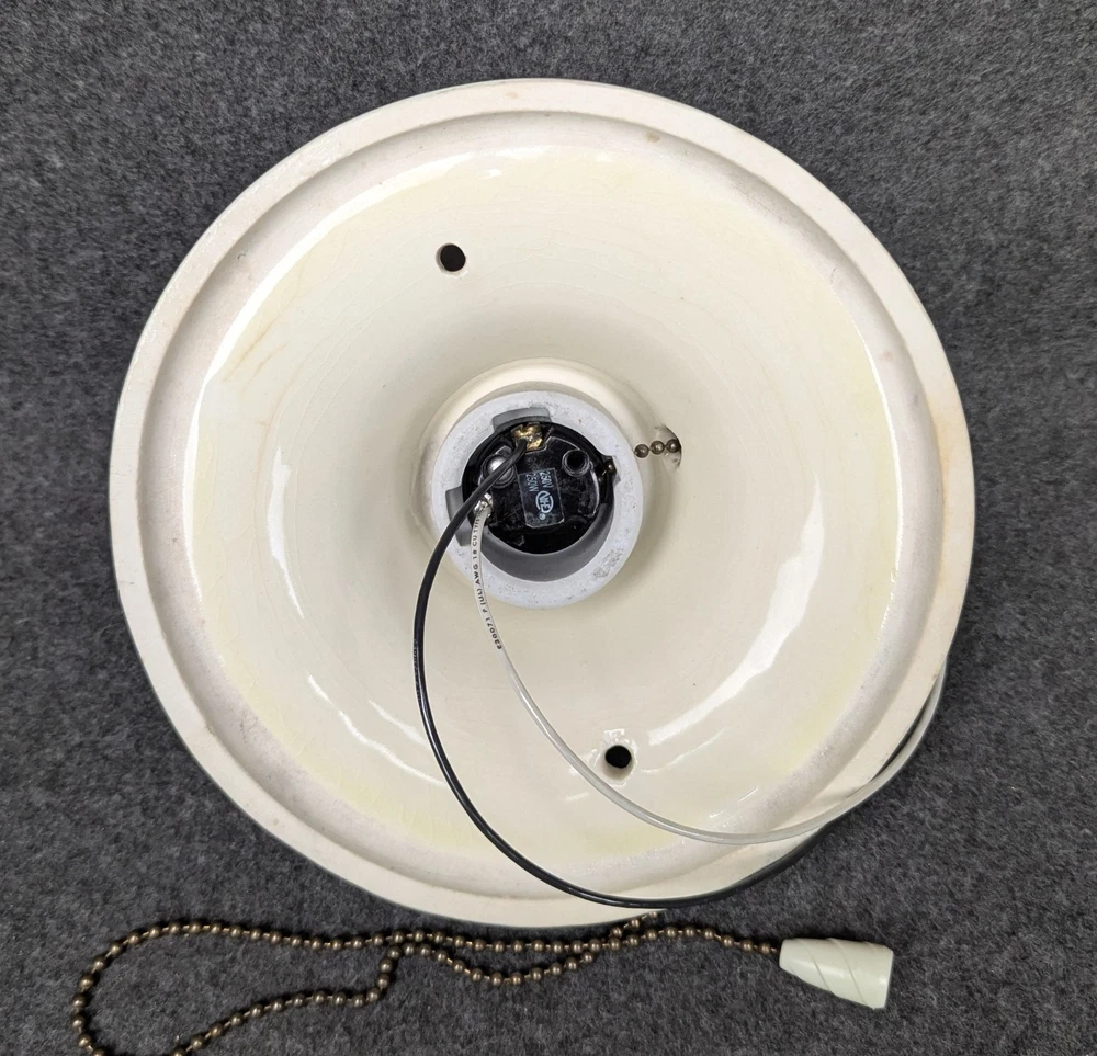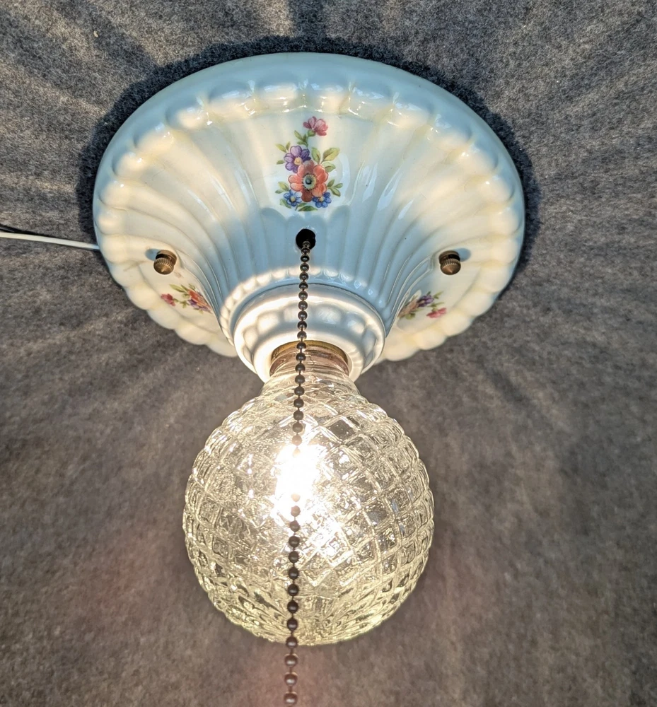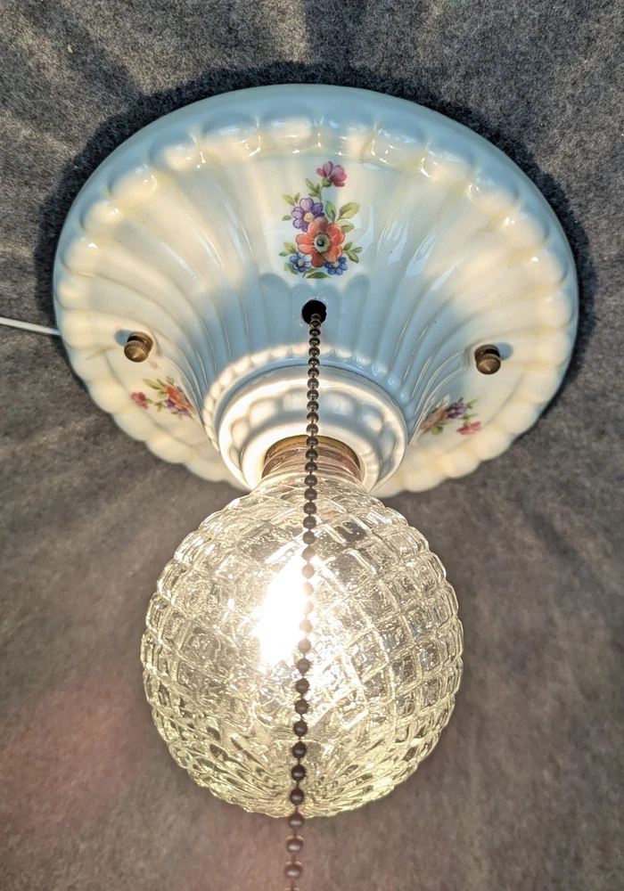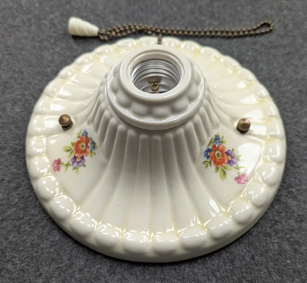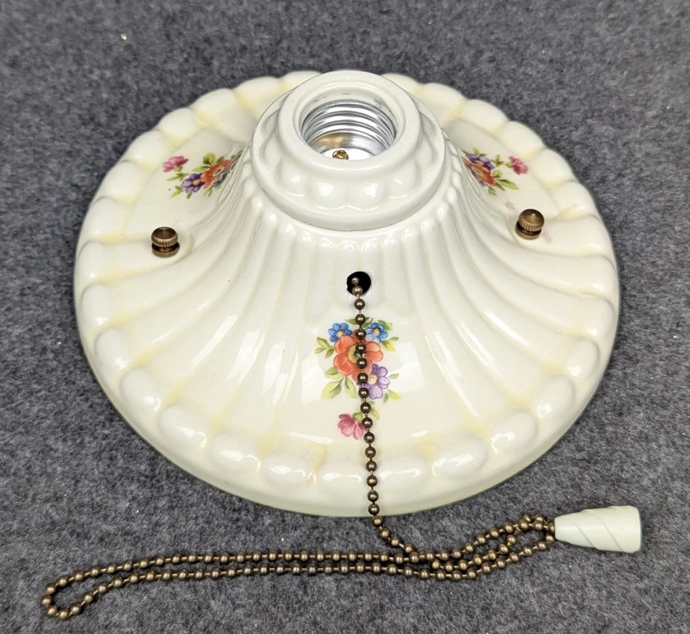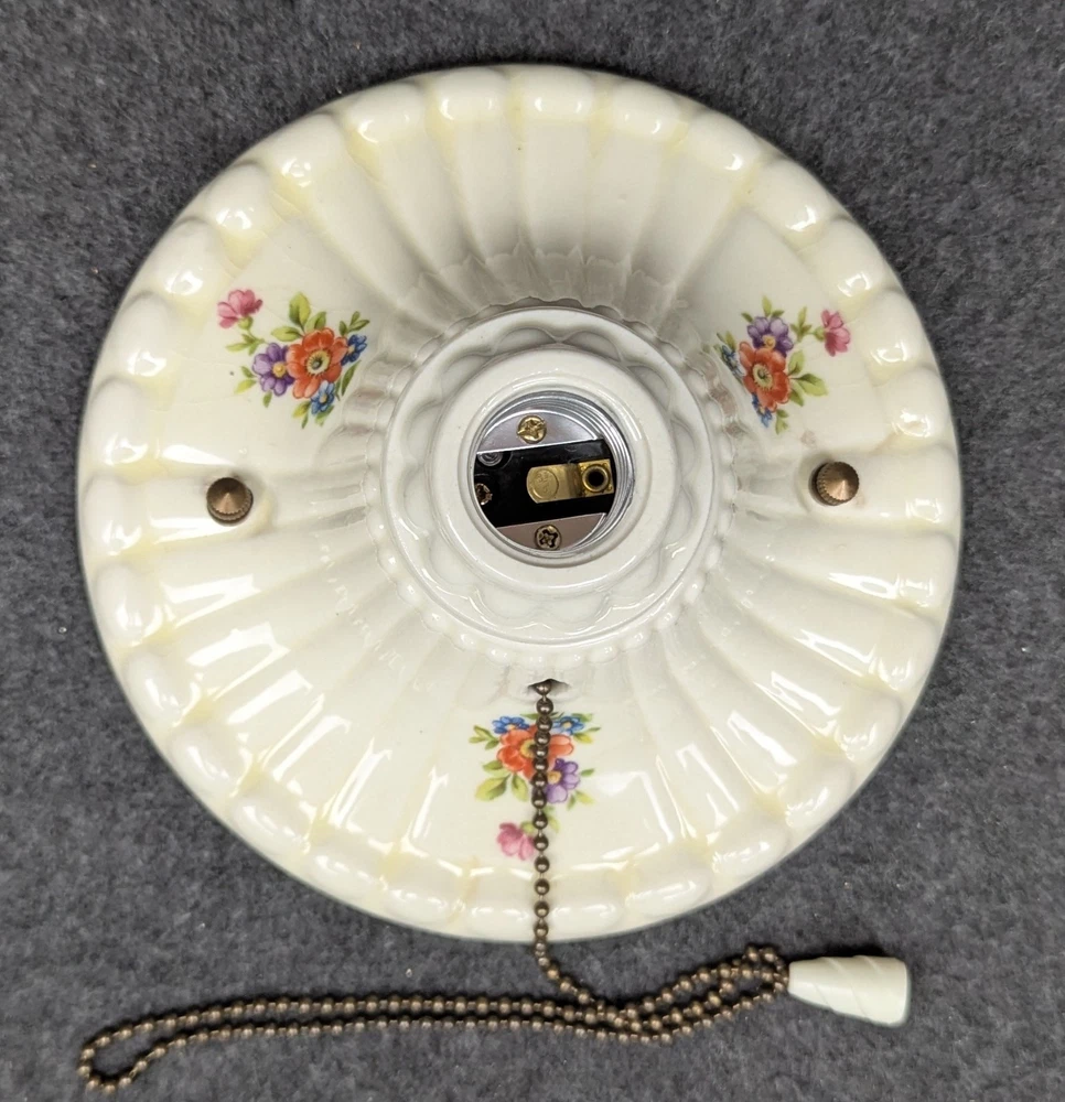 PORCELIER Porcelain Ceiling Light Fixture: Art Deco & MCM, EXCELLENT, Rewired This single-bulb, flush mount ceiling light was manufactured by Porcelier sometime between the late 1920's and the early 1950's, the lifetime of the company, and it is appropriate for both art deco and mid-century modern design. The fixture has a cream colored background with floral displays of garden flowers in pink, violet, blue, green and brown. The porcelain is in good condition but has minor stains near one mounting hole and a tiny chip at the other mounting hole, but both will be difficult to see once installed on the ceiling. We have carefully cleaned the fixture including removing all of the ceiling paint and dirt from the sides and back. We added a new pull chain socket and new wiring. We added a new antique brass pull chain and left it long (18") but it is easy to trim and we would be glad to trim it if the buyer specifies the length. The sale includes the mounting hardware (antique brass mounting nuts, threaded screws, & crossbar). If the buyer would prefer a chain and mounting nuts in nickel or bright brass, just say so and we will substitute. The fixture is 6-3/4" in diameter and is 3" high. It uses a standard base bulb (not included). All of our lights have been tested, are guaranteed to be as described, and we will accept their return if the buyer is dissatisfied. Just notify us within 30 days of receiving them. Shipping is buyer's choice of USPS Ground Advantage , UPS Ground, FedEx Ground, or USPS Priority Mail. We have other antique lighting for sale including other Porcelier ceiling fixtures, so please check out lighting store !
