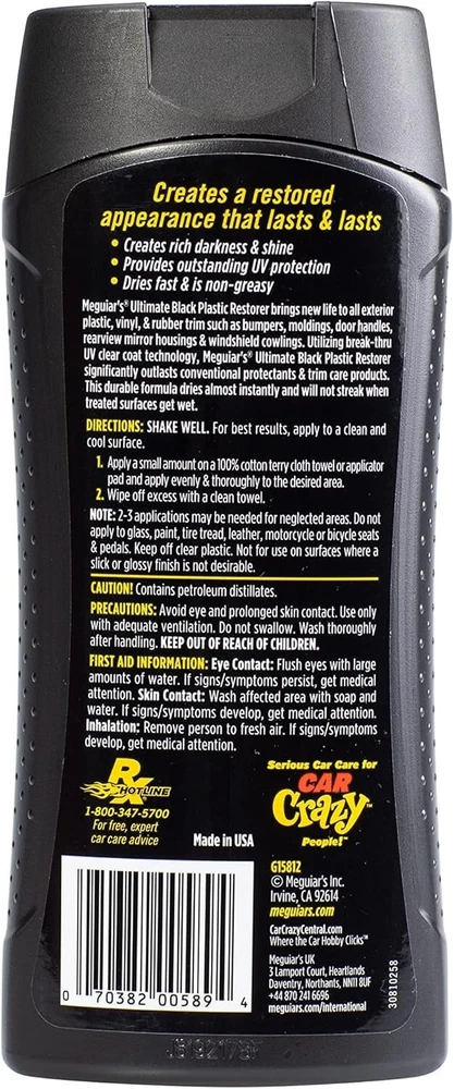 Restores, Protects, and Revitalizes: Ultimate Black Plastic Restorer, 12 Oz ‹ › ‹ › ‹ › ‹ › ‹ › ‹ › ‹ › ‹ › ‹ › ‹ › ‹ › ‹ › Ultimate Black Plastic Restorer - 12 Oz Restores, Protects, and Revitalizes all non-painted exterior plastic, vinyl, and rubber trim with unmatched efficacy. Product Features: Dimensions: 12 oz bottle. Versatile Application: Ideal for non-painted bumpers, moldings, door handles, rearview mirror housings, and windshield cowlings. Efficient Use: A dime-sized drop is all you need on a foam applicator pad, allowing for full control and minimal overspray. Revolutionary Formula: Featuring UV clear coat technology that outlasts conventional protectants and trim care products. Instant Results: Non-greasy formula dries nearly instantly, leaving surfaces without streaks even when wet. Transform Your Vehicle: Bring unparalleled richness and shine back to your vehicle's exterior trim, combating the effects of aging and environmental factors. Each application offers robust UV protection, preserving your car's aesthetics against harmful sun exposure and contaminants. Application Instructions: Ensure the surface is clean, dry, and cool. Shake well and apply a small amount of the restorer to a clean applicator. Spread evenly over the desired area and wipe off any excess with a clean towel. Repeat as necessary for neglected areas. Benefits of Choosing our Restorer: Long-lasting Shine: Revitalizes dull surfaces, creating a showroom-quality finish. Easy Application: Designed for hassle-free use with precise control. Protective Layer: Advanced hybrid polymer technology that seals surfaces for superior UV protection. Quick Dry: Saves you time with rapid-drying capabilities, ready to go in minutes. Why Choose Ultimate Black Plastic Restorer? Elevate your car care routine with a product that's specifically engineered to make your vehicle look like new while providing long-lasting protection from the elements. Unlock the vibrancy of your exterior trim and reflect your passion for excellence with every application. Don’t settle for less—transform your vehicle's appearance today with the Ultimate Black Plastic Restorer! Shipping Free & Fast Shipping - We offer free shipping to most of the USA with a normal delivery time of 3-7 days. However, due to the current situation, additional delivery time (up to 3 weeks) may be required for some items. Alternative Carriers - We may use alternative carriers (e.g. USPS, FedEx, UPS, etc.) to ensure your package arrives safely and on time. Due to the use of multiple carriers, we are unable to provide a tracking number automatically. Handling Time - Orders are processed and shipped within 1-2 business days of receiving cleared payment. Shipping Restrictions - Shipping to Alaska, Hawaii, Puerto Rico, Guam, and other US territories may incur shipping charges or delivery restrictions. Please contact us before ordering, or your order can be refunded/cancelled. State Restrictions - There may be restrictions based on your state of purchase. For example, certain items may not be shipped to California due to state regulations. Contact for Tracking Updates - If you require tracking updates or have any concerns about the delivery of your order, please feel free to contact us, and we will be happy to assist you. Return 30-Day Hassle-Free Returns - We want you to be completely satisfied with your purchase. If you are not, you can return the item within 30 days of receiving it for a full refund or exchange. Easy Return Process - To start a return, simply contact us and we will provide you with a prepaid return shipping label and detailed instructions. Restocking Fee - There are no restocking fees for returns. However, the buyer is responsible for return shipping costs if the return is not due to a seller's error. Refund Processing Time - Refunds will be processed within 5 business days of receiving the returned item in its original condition. Payment We accept all major credit cards, PayPal, and Apple Pay for your convenience. Your payment information is secure and encrypted to ensure a safe and seamless transaction. Please complete your payment within 3 days of purchase to avoid any delays in shipping. Feedback Your feedback is extremely important to us. We strive to provide the best products and customer service possible. If you are satisfied with your purchase, please take a moment to leave us a positive review. If you have any concerns or issues with your order, please contact us before leaving negative feedback. We are committed to resolving any problems and ensuring your satisfaction. Contact Us If you have any questions or concerns, please feel free to reach out to our customer support team. You can contact us through the eBay messaging system. We are available Monday to Friday, 9:00 am to 5:00 pm EST, and we will do our best to respond to your inquiry within 24 hours. Buy it now and enjoy a pleasant shopping experience! Manufacturer Part Number: Plastic Restorer UPC: Not Set Unit Quantity: 12 Brand: Unbranded Type: Car Towel Warranty: No Warranty Country/Region of Manufacture: Plastic Restorer Unit Type: oz
