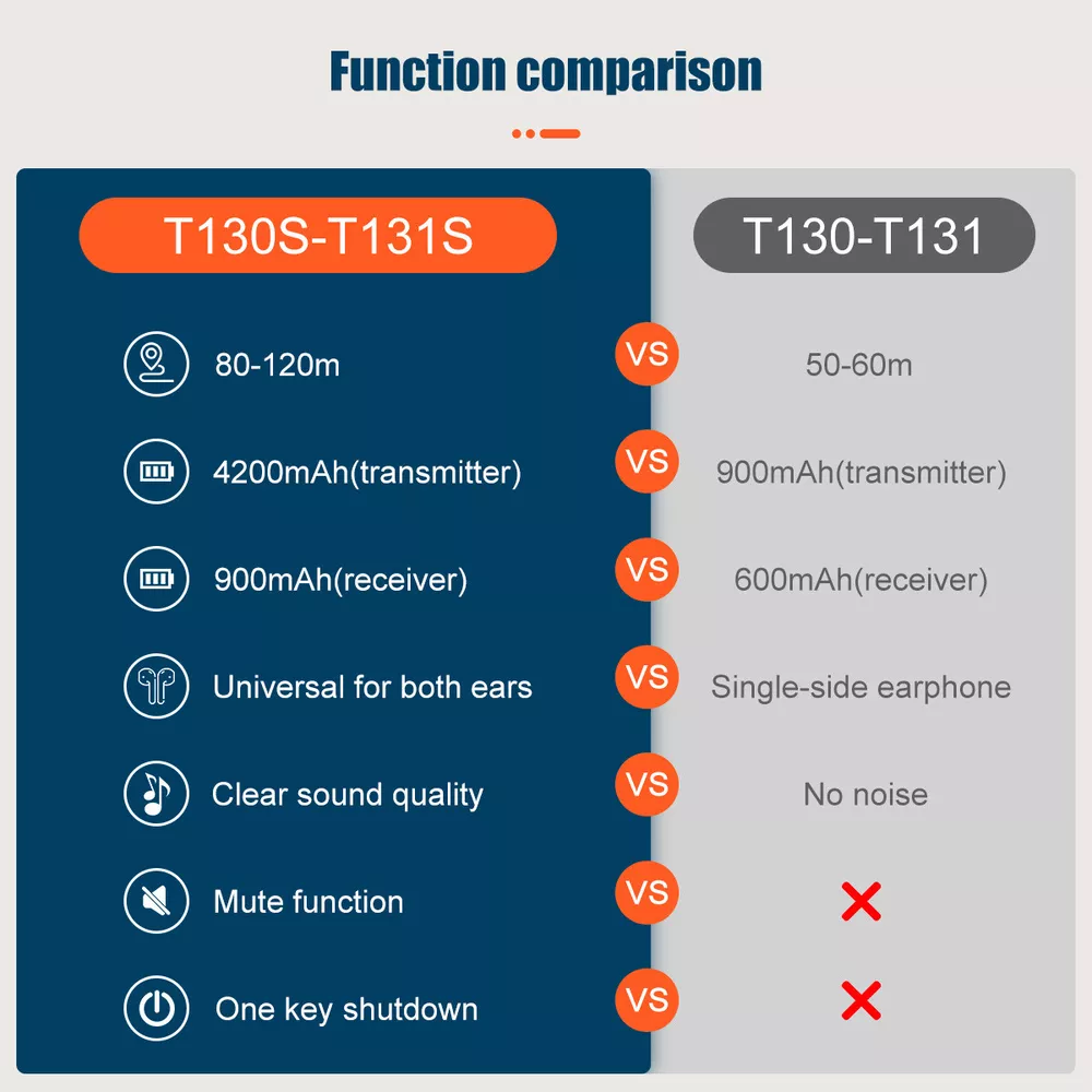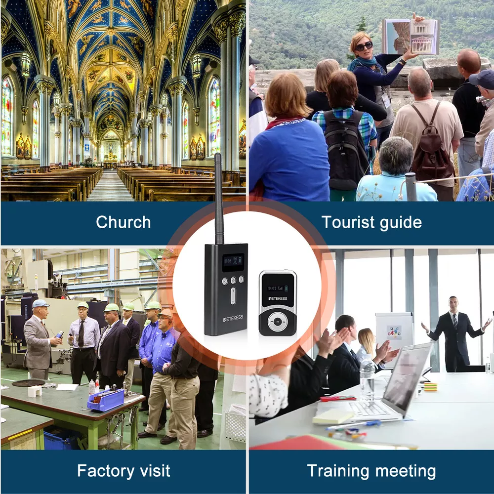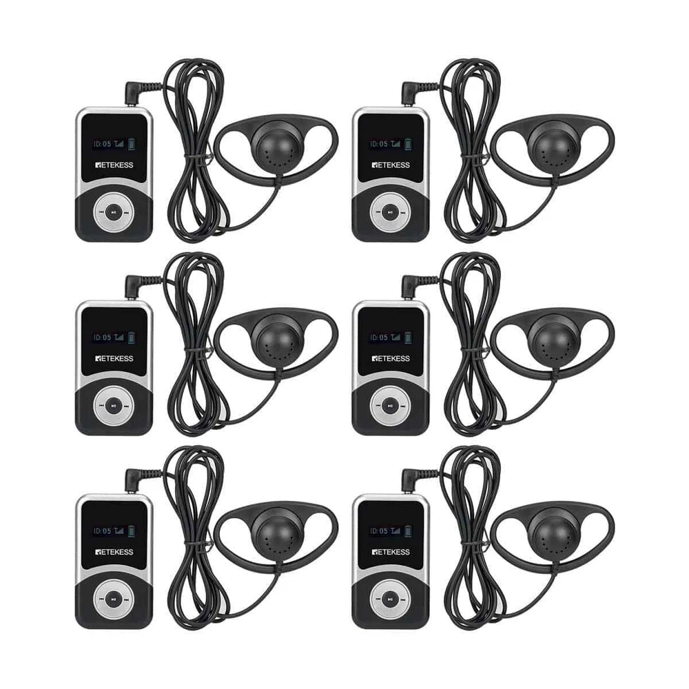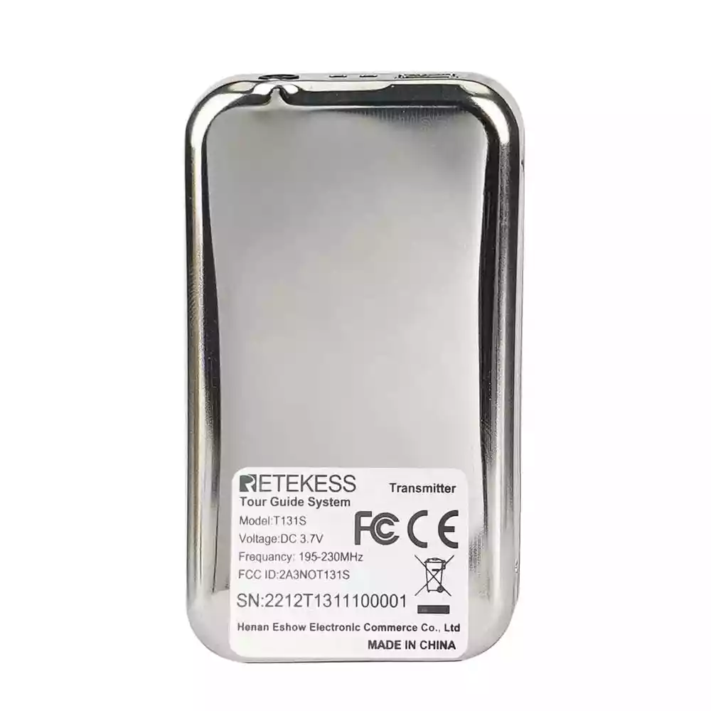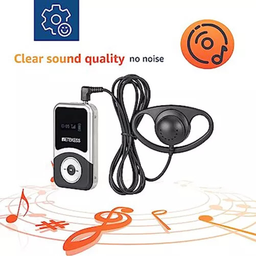 Shipping Service:Priority DHL Express Service when items ship from China.(2-7 business days) Retekess T131S Wireless Tour Guide Audio System Receiver for T130S Meeting Tour NOTE: This is wireless receiver only, it has to match our transmitter (T130S 195-216MHz,not be included in package) to build a wireless tour guide system, please feel free to contact us. Receiver Features: Portable design, the smallest and lightest PLL synthesized design, with high frequency stability 49 channel: allows 49 groups to operate simultaneously at the same place Built-in rechargeable lithium battery, make sure can use all day long LCD display, volume adjustable, battery consumption display, easy to operate Applications: Tour guide, Wireless meeting, Wireless teaching, Simultaneous interpreting, Corporate hospitality, Factory tour, Church sermon, etc.. Receiver Specification: Frequency range 195-216MHz Channel 49 channels Operating voltage DC 3.7V Audio frequency input 3.5mm line Frequency response range 50-18000Hz SNR 80dB(Typical) Image rejection ratio ≥90dB Degree of distortion <0.3% Effective working area 100m (empty) Capacity of battery 900mAh Working hours About 20 hours Size 73x 42 x 12mm / 2.8 x 1.6 x 0.5 in Weight 45g / 0.1lb Package Includes: 6 x Wireless receiver 6 x Single earphone 7 x Lanyard 1 x English manual Long working distance Signal transmission distance up to 100m/328ft, is ideal for keeping social distancing, such as tour guides, translators; factory visits; training meetings and other scenarios. The frequency range is 195-216MHz, helping tour groups overcome background noise and distance from the guide. One key to mute When the tour guide has to answer the phone during the explanation, he can turn on the mute function with one button on the transmitter instead of turning off the transmitter. PLL technology for signal stabilization PLL digital locking frequency synthesis design, more stable frequency, data mute locking technology, no interference noise. Ensures the clear and smooth audio transmission in a tour trip or in a conference. Ultra-long standby rechargeable battery Built-in 4200mAh lithium rechargeable battery in the transmitter can be used for 20 hours. Built-in 900mAh lithium battery in the receiver can be used for 20 hours. Long working time ensures your guests won’t miss any of your message,readily for a whole-day conference or journey. Wireless ID Setting Manual ID Setting We have 2 ways to set ID: Wireless ID setting and manual ID setting. Wireless ID setting works better for the occasion that if have to set the ID for many receivers, like a big conference; Manual ID setting works better for the occasion that if have to set the ID for few receivers, like a small class, a small group of tourists; Support 49 channels In the same tourist attraction, there will be multiple sets of equipment for explanations at the same time, and 49 optional channels will keep your team free from interference from other equipment. AUX and MIC dual-channel audio input The tour guide can play background music through the AUX function when explaining. Allow visitors to immerse themselves in the attractions. The clear and high-quality sound offers enjoyable listening experiences.. D-shaped earphones Compatible with left and right ears, it can reduce the burden on listeners who wear headphones for a long time compared to wearing headphones on one side. It is convenient to wear and solves the difficulty of using some hearing-impaired people, increasing the wearing options of users. Intuitive user interface LCD display for battery power, channel, volume, it is very easy to operate. The lit display design allows users to see information intuitively even in dark environments. Mini-sized The transmitter and receivers are mini-sized and light. Easily hang on your neck and it doesn’t cause neck pain even for a long-time wearing. Wireless tour guide system for a factory tour. Presenters don’t have to shout to compete with ambient noise. Tour group can adjust their own volume to a comfortable level. Make sure every visitor hear the introduction when the machines are working. About Us