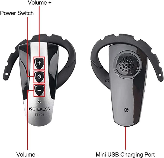 If you want to buy at more favorable price, or want to freely match the receiver, please contact customer service Shipping Service:Priority DHL Express from China to deliver item(2-7 business days) Retekess TT106 Tour Guide Audio Assisted System Transmitter 20 Receiver Training Features TT106 guide system with digital signal transmission; longer distance; higher confidentiality; strong anti-interference ability; clear audio quality; widely used in churches; simultaneous interpretation; seminars; exhibitions; art galleries and other learning activities ; special vocational training. Professional wireless audio guide system; adopt used globally signal transmission, with 9999 selectable channels; 9999 IDs allow up to 9999 tour groups to operate simultaneously in the same vicinity. One-click to set the channels of all receivers; one-click to turn off all connected receivers; one-click to mute all receivers; if the interpreter sometimes does not want the listener to hear him; he can press the mute button and the listener cannot hear his speech. Communication range up to 150 m / 492 ft; built-in 1300mAh rechargeable lithium battery in the transmitter can be used for 25 hours; and built-in 380mAh rechargeable lithium battery in the receiver can be used for 23 hours. Easy to carry; each small device comes with its own charger; small size; transmitter weighs 0.15 pounds and each receiver weighs 0.04 pounds; easy for listeners to use; the transmitter has a MIC input for the microphone; and supports mono external AUX audio input; such as smartphones; laptops; church audio systems. Specification TT106 Wireless Transmitter TT106 Wireless Receiver Frequency Range 2400~2483MHz Frequency Range 2400~2483MHz ID Number 9999 ID Number 9999 Supply Voltage DC3.7V Supply Voltage DC3.7V Transmitting power ≦50mW TIS -90dBm Frequency stability ±0.001﹪ Frequency stability ±0.001﹪ SNR 80dB SNR 80dB Size 97*63*18mm Size 65*58*11mm Weight 70g Weight 18g Charge time 3H Charge time 2H Working time 25H Working time 23H Battery specification 3.7V/1300mA Battery Specification 3.7V/380mA Charge Jack MINI USB Charge Jack MINI USB Modulation frequency deviation ±320KHz Modulation frequency deviation ±320KHz Working current 62mA Working current 15mA Communication range 150m (open air) Standby current 1mA Charging voltage DC5V Charging current 320mA Communication range 150m (open air) Charging voltage DC5V Package Includes 1 x TT106 Wireless Transmitter 20 x TT106 Wireless Receiver 1 x Lavalier Mic 21 x USB Cable 21 x Lanyard 1 x English User Manual Long Service Time 1300mAh rechargeable lithium battery for transmitter; 3H get full charged, 25H continuous use; 380mAh for receivers; 2H get full charged, 23H continuous use. AUX Input Jack Transmitter support 3.5mm AUX input which enables to connect a MP3, PC, phone, etc. to plug as sound sources; You can play background music or pre-recorded voice files by this function. One Key Mute Tour guide transmitter has mute function; If the interpreter sometimes does not want the audience to hear his speech, he can press the mute button and the audience will not hear his speech. 2.4GHz Global Public Use Signal Stable transmission; High security and confidentiality. Support 2 Transmitters Work Simultaneously Receivers could hear voice messages from two transmitters on the same channel; Note:If need more transmitters or receiveds,please contact our customer service. Translation System One click turn off all paired receivers; 9999 IDs allows 9999 tour groups to operate simultaneously in the same area; Unlimited number of receivers can be paired to a tour guide transmitter. Ear-hook Design for Tour Guide System Receivers Light weight, 18g for each receiver, 70g for each transmitter; Comfortable, no need to plug the receiver headset into ear; One click to make all receiver mute. USB Charging Tour Guide System Receivers USB chraging slots for each receiver; USB charging cable for each receivers are included; One click to turn off all connected receivers. Translation System for Churches You can adjust volume to a comfortable level without disturbing others; Set channels for all receiver simultaneously . About Us