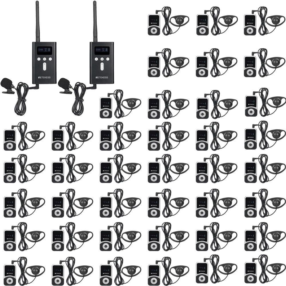 Model TT116T+TT116R TT125 T130+T131 Product Frequency Range UHF:902-928mhz 2.4 GHz 195-230MHz Transmission distance 200m(Open Area) 150m(Open Area) 60m(Open Area) Standby Time about 10h(Transmitter) about 18h(Transmitter) about 12h(Transmitter) about 13h(Receiver) about 80-100h(Receiver) about 18h(Receiver) Channel number 50 channels 999 channels 99 channels Noise Reduction Technology YES YES NO One-key Pairing YES YES YES One-key Mute YES YES NO Charging Port Type-C Type-C USB Battery Capacity 3.7V 1000mAh 3.7V 3000mAh 3.7V 900mAh(T)/600mAh(R) Microphone Omnidirectional Omnidirectional / Earphone D-shaped;Suitabel for both ears D-shaped;Suitabel for both ears D-shaped;Suitabel for both ears Size 114.8X54.8X20.6mm(T&R) 114.8X54.8X20.6mm(T&R) 99X56X14mm(T)+72X42X12mm(R) Weight 65g(T)+56g(R) 100g(T&R) 58(T)+45g(R) RetekessWireless Tour Guide Audio System 2 transmitter 40 Receiver Church Museum Transmitter Features: Portable design, the smallest and lightest PLL synthesized design, with high frequency stability 49 channel: allows 49 groups to operate simultaneously at the same place One transmitter can work with any number of receivers About 120m(393ft) communicating distances The transmitter supports external audio input, such as MP3, Smartphone Bulit-in rechargeable lithium battery, make sure can use all day long LCD display, volume adjustable, battery consumption display, easy to operate Two way of ID setting: Wireless and Manual. If you have to set the ID for many receivers, the wirelss ID setting method is more quickly Support the transmitter to turn off the receiver on the same frequency with one key, the transmitter to mute with one key, and the transmitter to frequency with one key Applications: Tour guide, Wireless meeting, Wireless teaching, Simultaneous interpreting, Corporate hospitality, Factory tour, Church sermon, etc. Transmitter Specification: Frequency range 195-216MHz Channel 49 channels Frequency response 50Hz-18000Hz Operating voltage DC 3.7V Transmitted output power 18dBm Audio frequency input 3.5mm line /Microphone input SNR 80dB(Typical) Image rejection ratio ≥90dB Degree of distortion <0.3% Effective working area 100m Capacity of battery 4200mAh Working hours About 20 hours Size 205 x 60 x 20 mm / 8 x 2. 3 x 0. 7 in Weight 140 g / 0.3lb NOTE: This is a wireless transmitter only, it has to match our receiver to build a wireless tour guide system, please feel free to contact us. Can be used with T131 receiver Receiver Features: Portable design, the smallest and lightest PLL synthesized design, with high frequency stability 49 channel: allows 49 groups to operate simultaneously at the same place Built-in rechargeable lithium battery, make sure can use all day long LCD display, volume adjustable, battery consumption display, easy to operate Applications: Tour guide, Wireless meeting, Wireless teaching, Simultaneous interpreting, Corporate hospitality, Factory tour, Church sermon, etc.. Receiver Specification: Frequency range 195-216MHz Channel 49 channels Operating voltage DC 3.7V Audio frequency input 3.5mm line Frequency response range 50-18000Hz SNR 80dB(Typical) Image rejection ratio ≥90dB Degree of distortion <0.3% Effective working area 100m (empty) Capacity of battery 900mAh Working hours About 20 hours Size 73x 42 x 12mm / 2.8 x 1.6 x 0.5 in Weight 45g / 0.1lb NOTE: This is a wireless receiver only, it has to match our transmitter (195-216MHz) to build a wireless tour guide system, please feel free to contact us. Package Includes: 2 x Wireless t ransmitter 40 x Wireless receiver 40 x Single earphone 1 x Lavalier microphone 40 x USB charging cable 40 x Lanyard 1 x English manual Long working distance Signal transmission distance up to 100m/328ft, is ideal for keeping social distancing, such as tour guides, translators; factory visits; training meetings and other scenarios. The frequency range is 195-216MHz, helping tour groups overcome background noise and distance from the guide. One key to mute When the tour guide has to answer the phone during the explanation, he can turn on the mute function with one button on the transmitter instead of turning off the transmitter. PLL technology for signal stabilization PLL digital locking frequency synthesis design, more stable frequency, data mute locking technology, no interference noise. Ensures the clear and smooth audio transmission in a tour trip or in a conference. Ultra-long standby rechargeable battery Built-in 4200mAh lithium rechargeable battery in the transmitter can be used for 20 hours. Built-in 900mAh lithium battery in the receiver can be used for 20 hours. Long working time ensures your guests won’t miss any of your message,readily for a whole-day conference or journey. Wireless ID Setting Manual ID Setting We have 2 ways to set ID: Wireless ID setting and manual ID setting. Wireless ID setting works better for the occasion that if have to set the ID for many receivers, like a big conference; Manual ID setting works better for the occasion that if have to set the ID for few receivers, like a small class, a small group of tourists; Support 49 channels In the same tourist attraction, there will be multiple sets of equipment for explanations at the same time, and 49 optional channels will keep your team free from interference from other equipment. AUX and MIC dual-channel audio input The tour guide can play background music through the AUX function when explaining. Allow visitors to immerse themselves in the attractions. The clear and high-quality sound offers enjoyable listening experiences.. D-shaped earphones Compatible with left and right ears, it can reduce the burden on listeners who wear headphones for a long time compared to wearing headphones on one side. It is convenient to wear and solves the difficulty of using some hearing-impaired people, increasing the wearing options of users. Intuitive user interface LCD display for battery power, channel, volume, it is very easy to operate. The lit disp