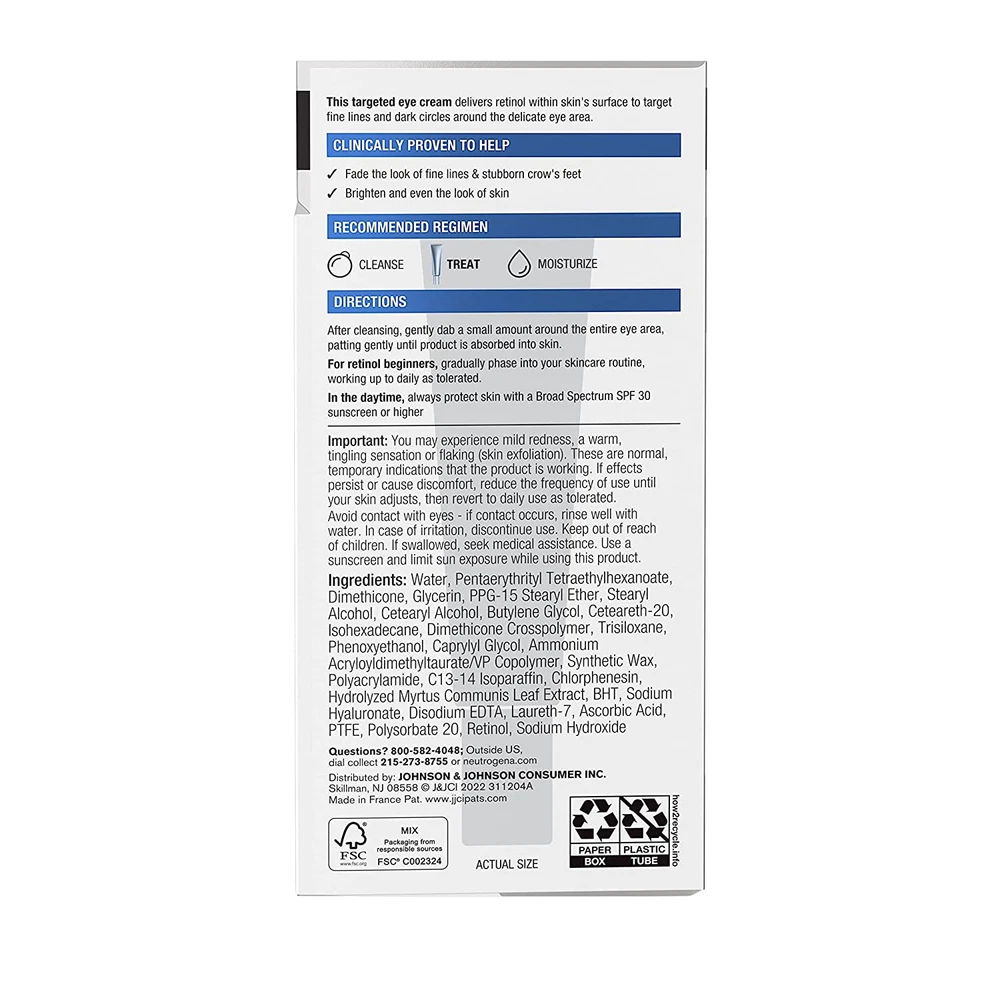 0.5-fluid ounce tube of Neutrogena Fragrance-Free Visible Repair Retinol Anti-Wrinkle Eye Cream with retinol & hyaluronic acid to target crow's feet, fine lines & dark circles. Your Rapid Wrinkle Repair just got upgraded, now with a soothing complex The beginner strength fragrance-free retinol cream hydrates & moisturizes the delicate under eye area. It is formulated to help fade the look of fine lines & stubborn crow's feet & brighten & even the look of skin in the under eye area Anti-aging eye cream with pure retinol, a form of Vitamin A scientifically proven superior to other retinyl esters, improves the look of fine lines & dark spots & hyaluronic acid to add plumping moisture to help hydrate & rejuvenate the look of skin This unscented anti-wrinkle cream features a soothing complex to nourish skin & help minimize the potential for irritation. The under eye cream is suitable for daily use & is formulated without fragrance, parabens, mineral oil & dyes The perfect addition to a daily at-home anti-age skincare routine, this fragrance-free anti-wrinkle retinol eye cream works quickly for visible results & is the #1 retinol brand used most by dermatologists Product Description Target crow's feet, fine lines and dark circles with Neutrogena Rapid Wrinkle Repair Retinol Anti-Wrinkle Eye Cream. Specially formulated for the delicate eye area, the retinol cream is suitable for daily use and helps fade the look of fine lines and stubborn crow's feet and brightens and evens the look of skin in the under-eye area. Perfect for use in a daily skincare routine, anti-aging formula contains retinol, a powerful dermatologist-proven form of vitamin A, to fight fine lines, dullness, wrinkles and dark spots. Our eye cream is formulated with pure retinol, which is scientifically proven superior to commonly used retinyl esters. Hyaluronic acid within this eye cream adds plumping moisture to help hydrate and rejuvenate the look of skin around the eyes. This dark circle targeting retinol cream is formulated without parabens, mineral oil, and dyes and comes from the #1 retinol brand used most by dermatologists. Brand Story By