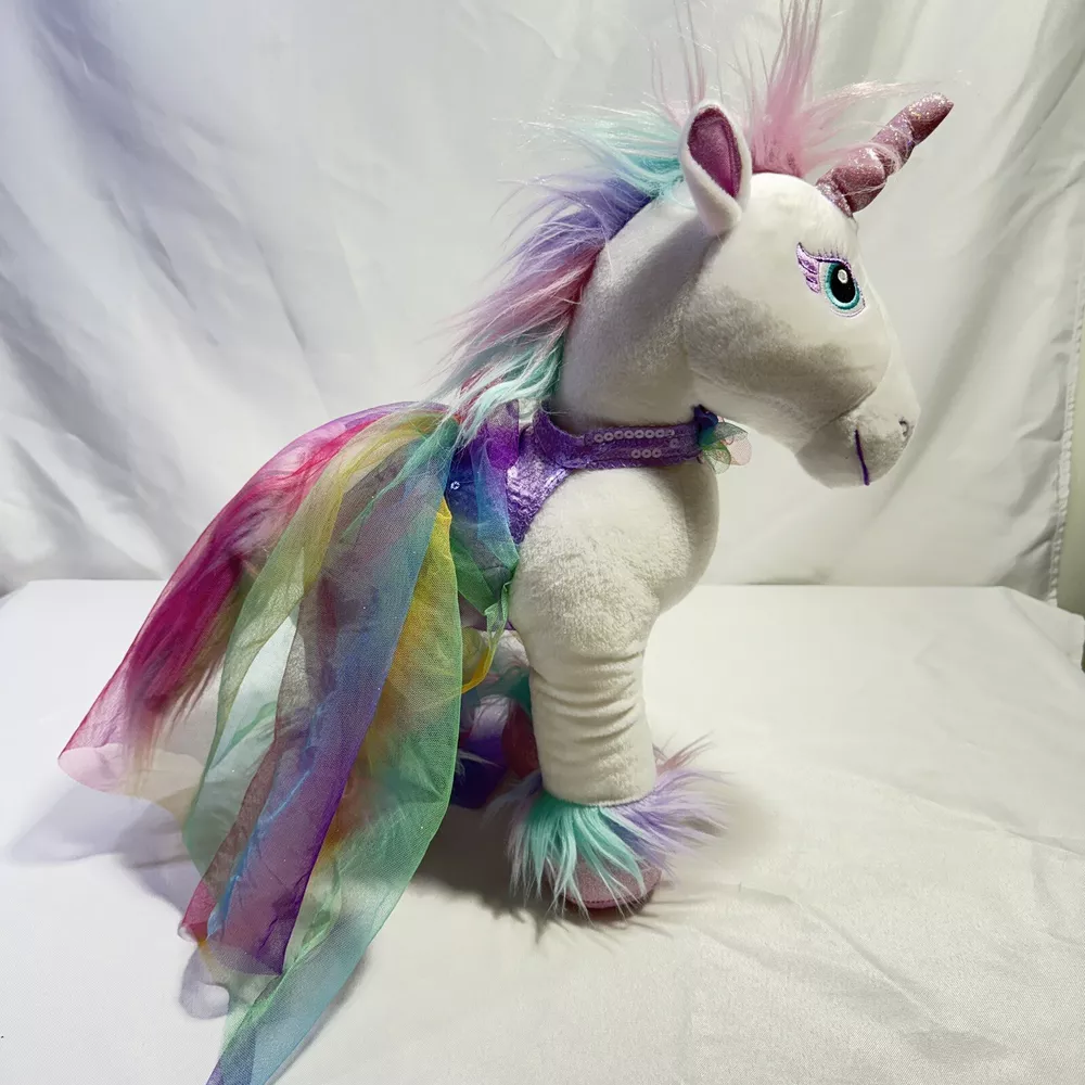 This retired Build-A-Bear plush doll is a must-have for any My Little Pony fan. The 17-inch white unicorn boasts beautiful blue eyes and comes dressed in clothing and accessories. This original, licenced reproduction from the 2010-2019 collection is in excellent condition and is the perfect addition to any collection. The doll is made of high-quality plush material and features intricate details, such as the unicorn horn and wings. This single unit doll weighs 1 pound and is perfect for display or play. Add this magical Build-A-Bear Workshop My Little Pony plush doll to your collection today! Note: Sound does not work