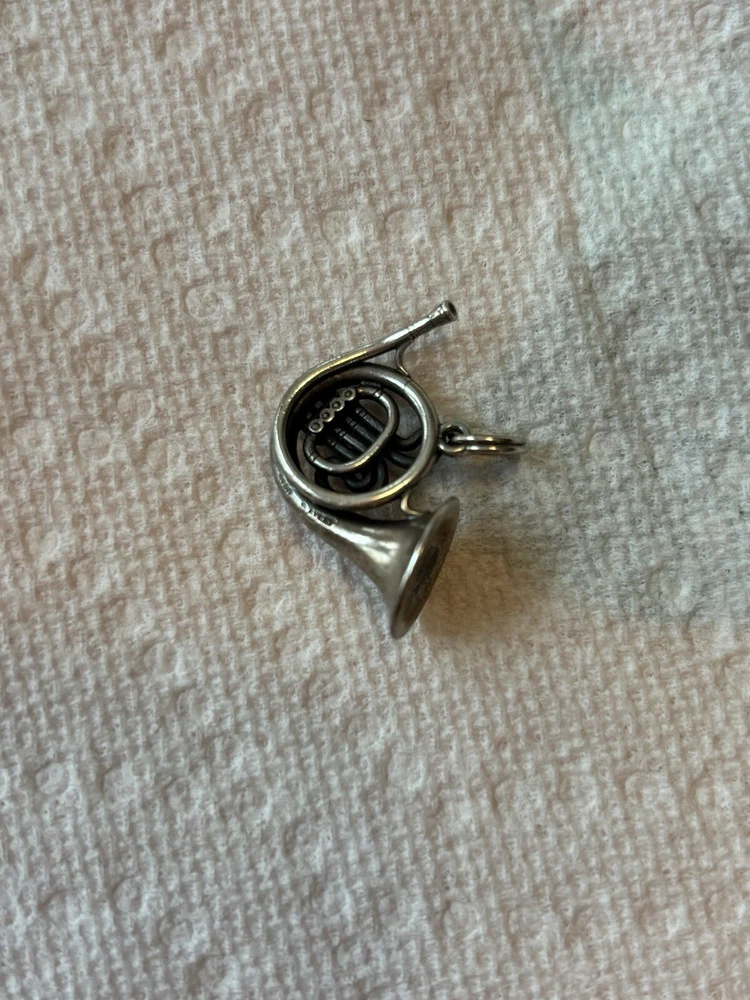 This is a retired James Avery French Horn Charm made of sterling silver with a purity of 925. It features a horn material and is signed by the brand. The charm has a vintage style and is from the United States. It is a perfect addition to any charm collection.