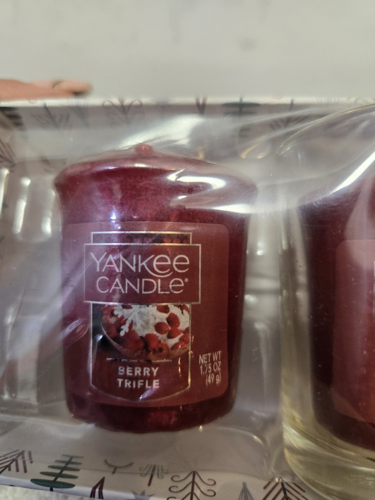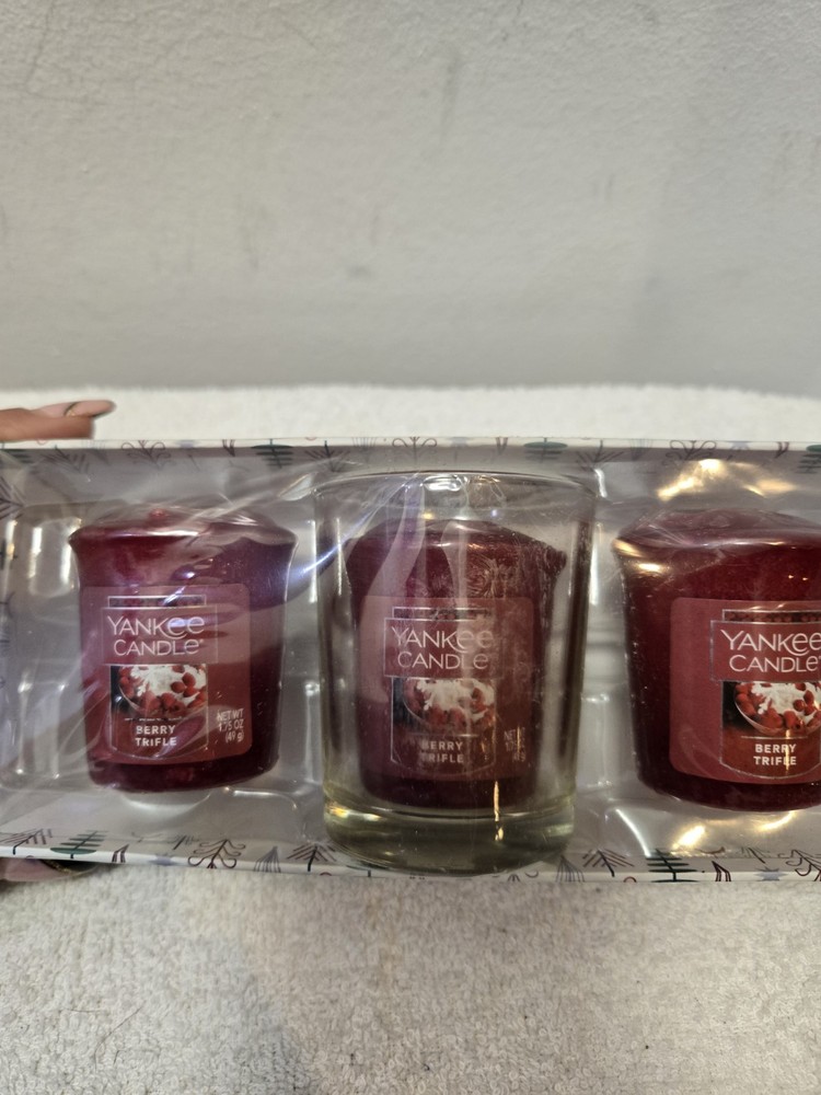 Retired Yankee Candle Votive Gift Set Berry Trifle 3 votive candles and one glass holder in Christmas gift box never open