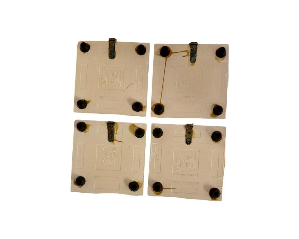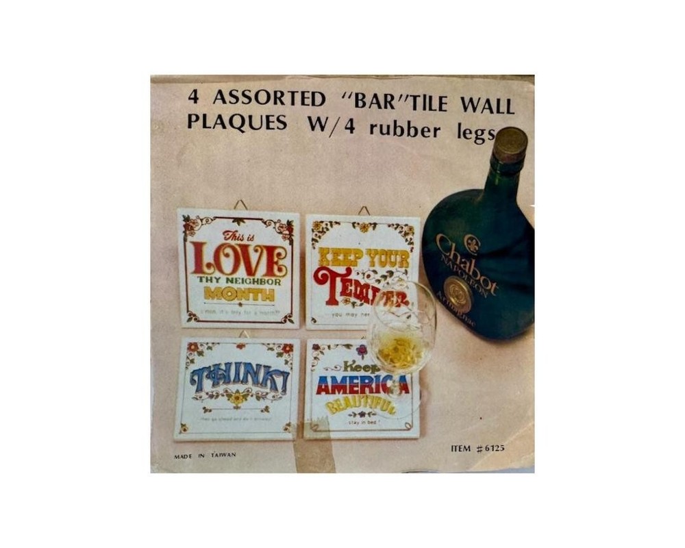 This product is a set of four small square ceramic bar tile wall plaques with retro designs in multicolor. Each plaque measures 4.5 inches in length and height, with a glossy finish. They come with hanging brackets and rubber legs for easy mounting on any room's wall. Made in Taiwan, these plaques add a touch of retro charm to your home décor with their unique tile art style. Perfect for adding a pop of color and vintage flair to your living space.
