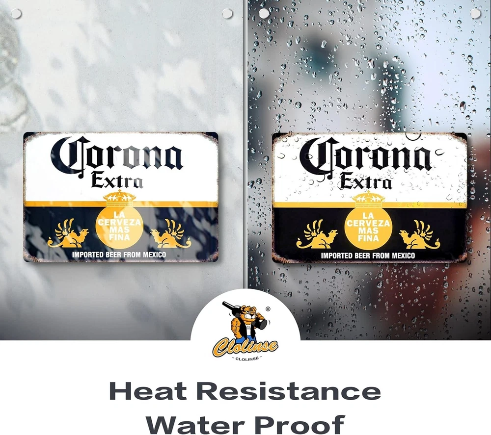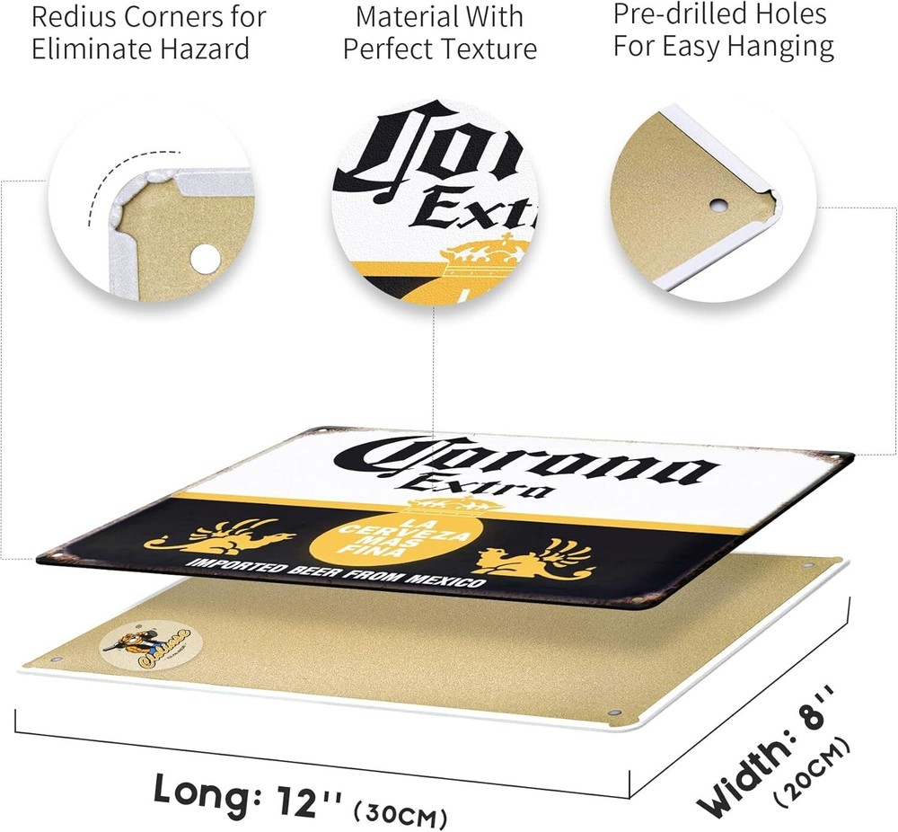 Retro Corona Extra Beer Metal Tin Sign Wall Art for Pub Home Bar Man Cave Decor 👉SIZE: 8 Inch X 12 Inch(20 Cm X 30 Cm) 👉MATERIAL:Made from high-quality tinplate(harmless, no rust, no fading), with rounded corners,Dumb oil scrub is eco-Friendly and 100% recycled to benefit our environment. 👉EASY TO INSTALL:The street signs have four screw holes and can be installed with double-sided nano tape(a gift for you), command strips or nails. 👉PREFERRED GIFT:A wonderful piece to add to your Bar, Man Cave, Coffee room, Home, Gate, Bedroom, Bathroom, Laundry, Garden, Office, Bar, Restaurant, Dorm, Cafe, Pubs, Street, Billiard House, Hotel, Club Wall, Country room, Garage Or Grunge rooms. Functionality and appreciation coexist. It is best for giving gifts to family, lovers, friends, elders who have taken care of themselves, etc. This is a good gift that makes people who like Vintage Things happy. 👉PERFECT GUARANTEE:We provide quality after-sale refund and return service. If you have questions about our products, please contact us in time and we will answer them as soon as possible.