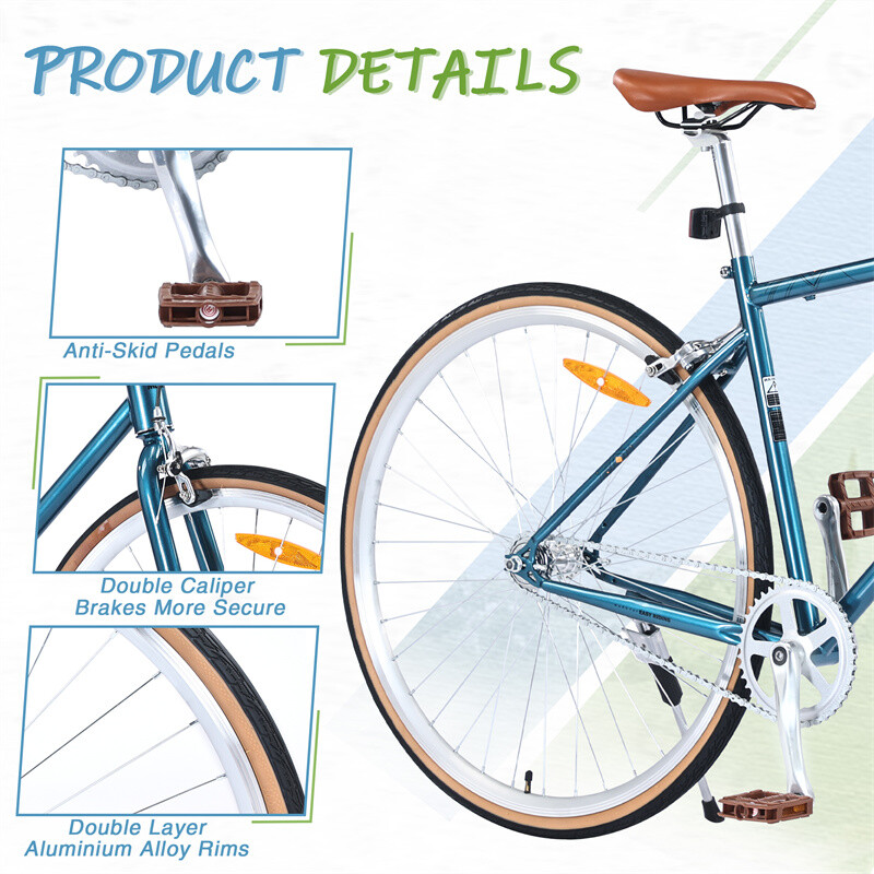 Specification Product Information Product Type:General Item Product Name:Single Speed Retro style 700C Road Bike For men women's City Bicycle,Steel Frame Place of Origin:China Main Color:Blue Main Material:Steel Product Dimensions Assembled Length (in.):64.97 Assembled Width (in.):24.41 Assembled Height (in.):38.52 Weight (lbs.):28.66 Package Size Length (in.):53.15 Width (in.):7.09 Height (in.):28.35 Weight (lbs.):34.83 Product Features 700C Hybrid bike,sturdy and durable steel frame, provide safe and stable cycling experience. Ergonomically design, suitable for mens womens height 5'3"-5'8", max weight is up to 220lbs. Double layer aluminium alloy rims and 700*35C High-performance tyres,It responds to quick turns keeps you well planted on the road. Easy riding,single speed system is simple to use,double caliper brakes more secure and faster braking response. 85% pre-assembled,easy to assemble,free installation tools and pedals include. Description Product Details Bike Type Road Bike ,Hybrid Bike Age Range (Description) Adult Number of Speed Single Speed Wheel Size 700C Frame Material Steel Frame Brakes Double Caliper Brakes