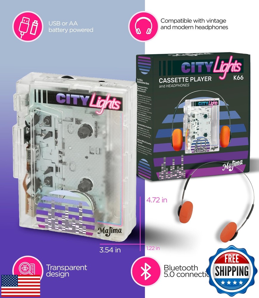 CityLights Walkman Retro Cassette Player Transparent Design with Wired Headphones Bluetooth FM Radio 80s 90s Nostalgic Style Portable Superior Sound Quality Perfect for Collectors and Vintage Gifts Features 🎁 THE PERFECT GIFT FOR RETRO LOVERS AND COLLECTORS Surprise your loved ones with a gift that blends nostalgia with innovation. Inspired by the styles seen in Guardians of the Galaxy and Stranger Things, this retro cassette player walkman is perfect for collectors, vintage music fans, and those who appreciate timeless design. Ideal for birthdays, holidays, or any special occasion. 🎶 AUTHENTIC VINTAGE SOUND WITH BLUETOOTH CONNECTIVITY Relive the magic of the 80s and 90s with this high-quality cassette player, offering crisp audio and seamless functionality. Featuring advanced Bluetooth 5.0 technology, this Bluetooth cassette player lets you wirelessly stream your favorite playlists from any device. Perfect for those who enjoy both classic cassette tapes and modern digital tunes. 🎧 RETRO TRANSPARENT DESIGN WITH ICONIC HEADPHONES Step back in time with the eye-catching transparent cassette player design, showcasing the intricate mechanics inside. Comes with iconic wired vintage headphones featuring vibrant orange foam for that authentic 80s vibe. A must-have for fans of vintage Sony Walkman styles and anyone who loves a retro touch in their daily life. 🔋 PORTABLE, LIGHTWEIGHT, AND LONG-LASTING Designed for ultimate portability, this walkman cassette player is lightweight and compact, making it easy to carry wherever you go. Powered by AA batteries or USB, it’s perfect for travel, outdoor adventures, or daily commutes. With energy-efficient playback, you’ll enjoy hours of uninterrupted music. 📼 COMPATIBLE WITH CLASSIC AND MODERN CASSETTES Rediscover the magic of your favorite vintage cassette tapes or explore new releases with this versatile cassette tape player. It delivers smooth operation and exceptional audio performance, making it ideal for collectors and enthusiasts. Whether revisiting your 80s cassette collection or exploring fresh cassette tape music, this device is the perfect companion. Shipping Free & Fast Shipping: We offer free shipping to most of the USA with a normal delivery time of 3-7 days. However, due to the current situation, additional delivery time (up to 3 weeks) may be required for some items. Alternative Carriers: We may use alternative carriers (e.g., USPS, FedEx, UPS) to ensure your package arrives safely and on time. Due to the use of multiple carriers, we are unable to provide a tracking number automatically. Handling Time: Orders are processed and shipped within 1-2 business days of receiving cleared payment. Shipping Restrictions: Shipping to Alaska, Hawaii, Puerto Rico, Guam, and other US territories may incur shipping charges or delivery restrictions. Please contact us before ordering, or your order can be refunded/cancelled. State Restrictions: Certain items may not be shipped to California due to state regulations. Contact for Tracking Updates: If you require tracking updates or have any concerns about the delivery of your order, please feel free to contact us, and we will be happy to assist you. Return Policy 30-Day Hassle-Free Returns: If you are not completely satisfied with your purchase, you can return the item for free within 30 days of receiving it for a full refund or exchange. Easy Return Process: Contact us, and we will provide you with a prepaid return shipping label and detailed instructions. No Restocking Fee: There are no restocking fees for returns. However, the buyer is responsible for return shipping costs if the return is not due to a seller's error. Refund Processing: Refunds will be processed within 1 business day of receiving the returned item in its original condition. Payment We accept all major credit cards, PayPal, and Apple Pay for your convenience. Your payment information is secure and encrypted to ensure a safe and seamless transaction. Please complete your payment within 3 days of purchase to avoid any delays in shipping. Feedback Your feedback is extremely important to us. We strive to provide the best products and customer service possible. If you are satisfied with your purchase, please take a moment to leave us a positive review. If you have any concerns or issues with your order, please contact us before leaving negative feedback. We are committed to resolving any problems and ensuring your satisfaction. Contact Us If you have any questions or concerns, please feel free to reach out to our customer support team. You can contact us through the eBay messaging system. We are available Monday to Friday, 9:00 am to 5:00 pm EST, and we will do our best to respond to your inquiry within 24 hours. Thank you for supporting our small family business!