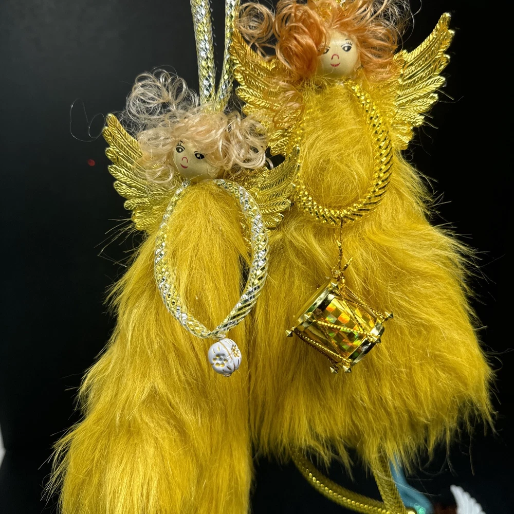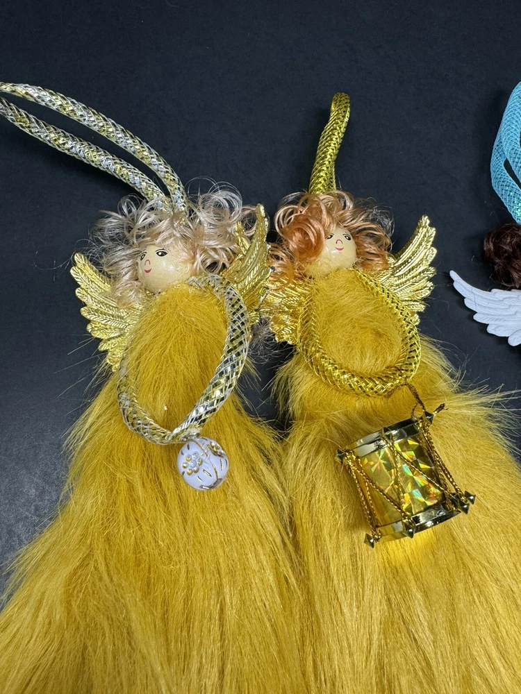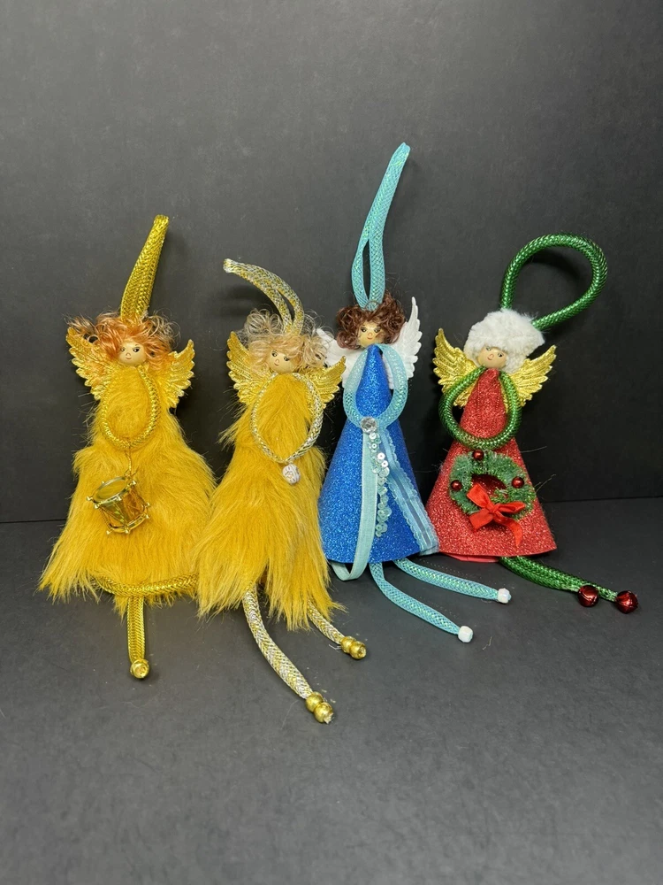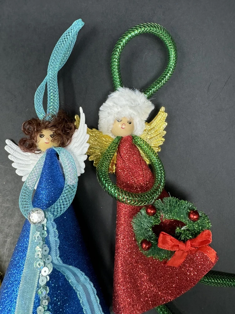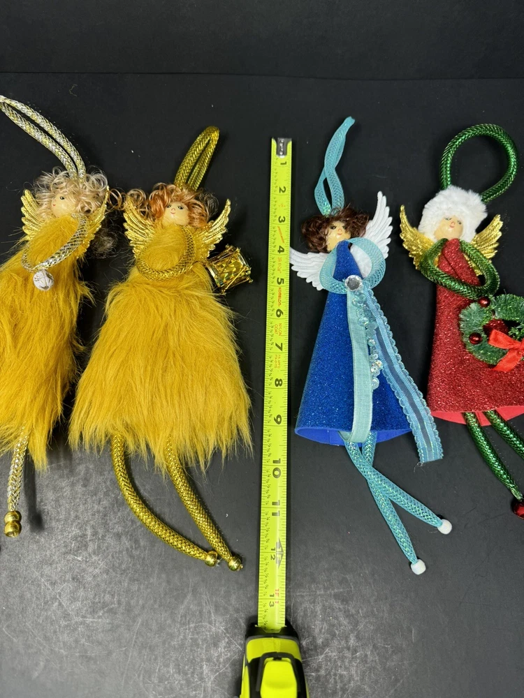 Add some retro charm to your Christmas tree with this lot of four vintage angel ornaments. These handmade ornaments feature faux fur piping, glitter, wood, cloth, and fabric materials that give them a unique and kitschy look. Each ornament is solidly patterned and shaped as an angel, perfect for any angel-themed Christmas decor. The set includes four hanging ornaments that are sure to add some sparkle and personality to your tree. These angel ornaments are measuring approximately 12 inches in height.