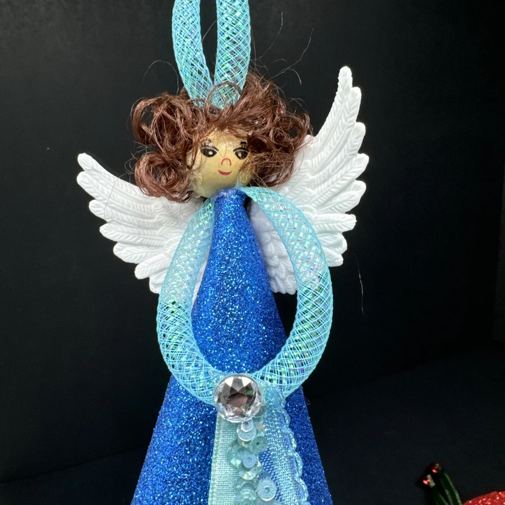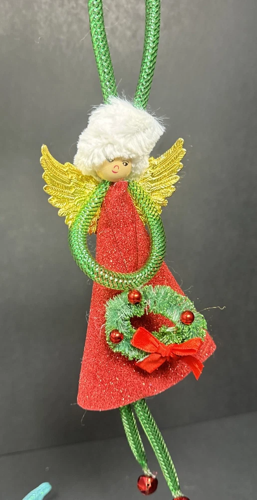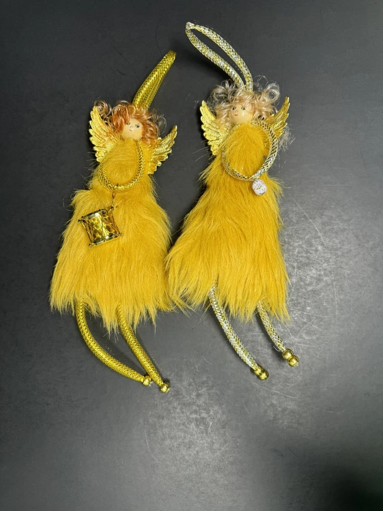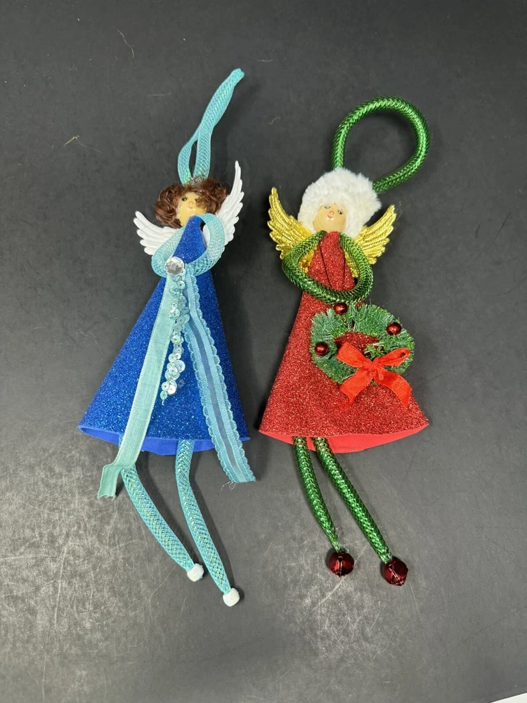 Add some retro charm to your Christmas tree with this lot of four vintage angel ornaments. These handmade ornaments feature faux fur piping, glitter, wood, cloth, and fabric materials that give them a unique and kitschy look. Each ornament is solidly patterned and shaped as an angel, perfect for any angel-themed Christmas decor. The set includes four hanging ornaments that are sure to add some sparkle and personality to your tree. These angel ornaments are measuring approximately 12 inches in height.