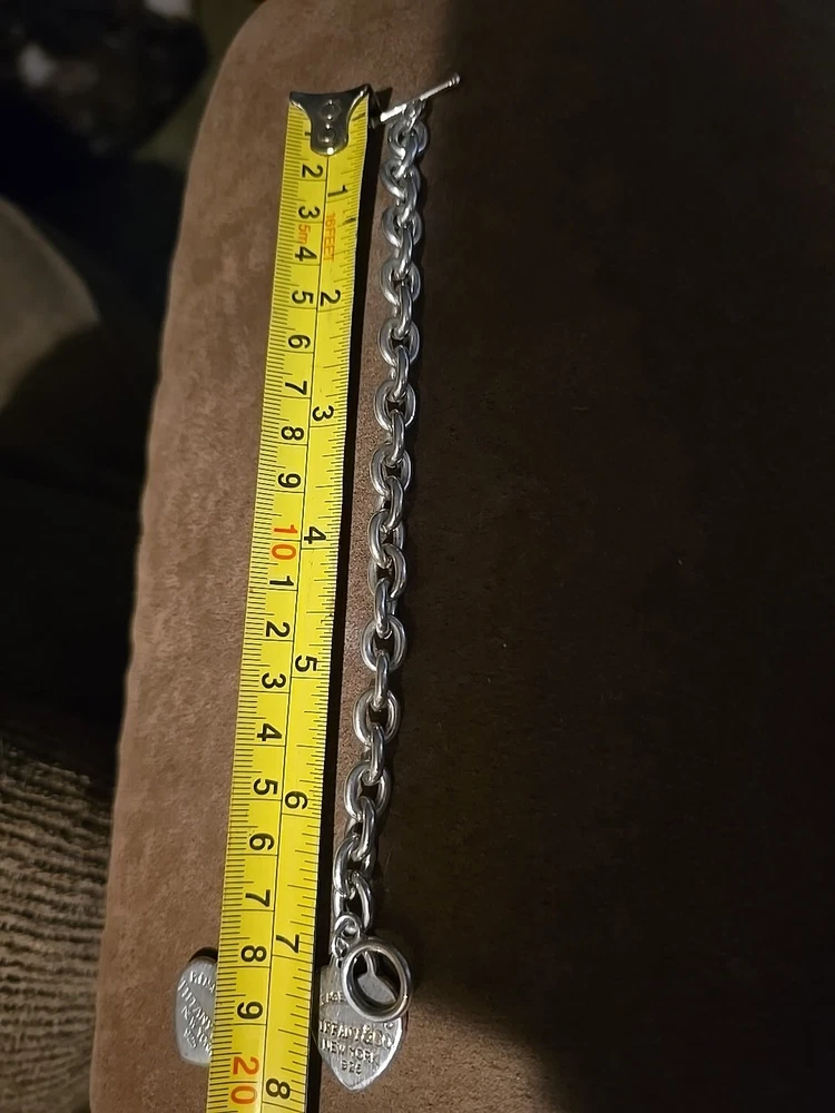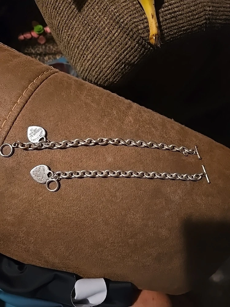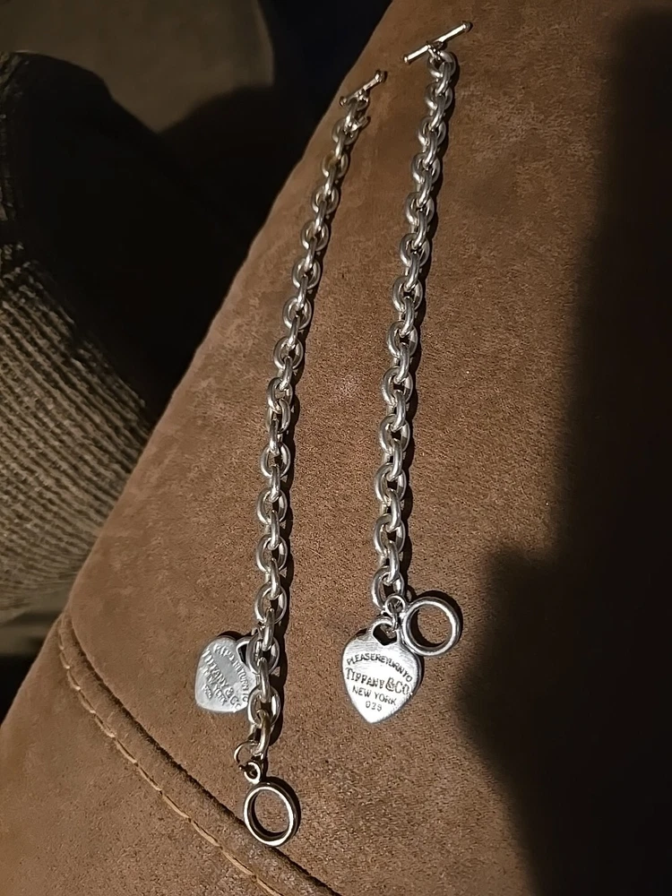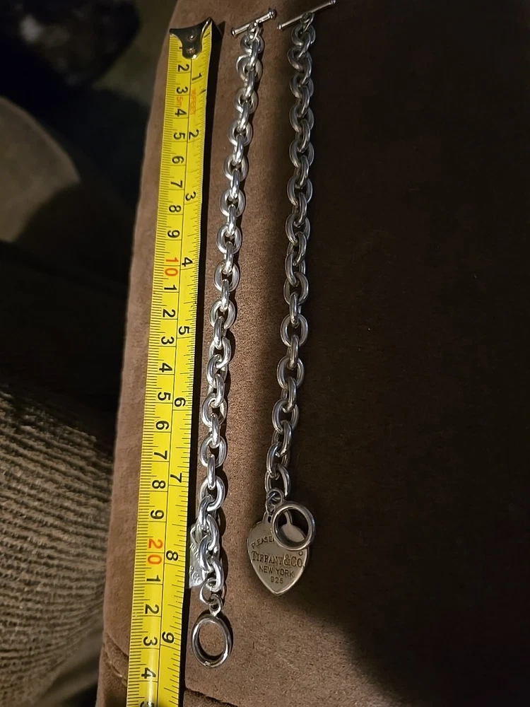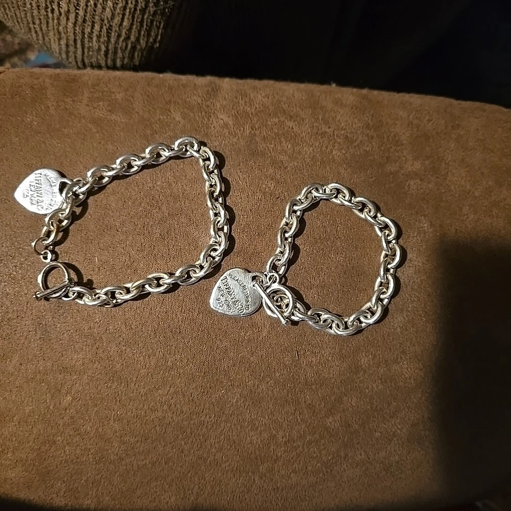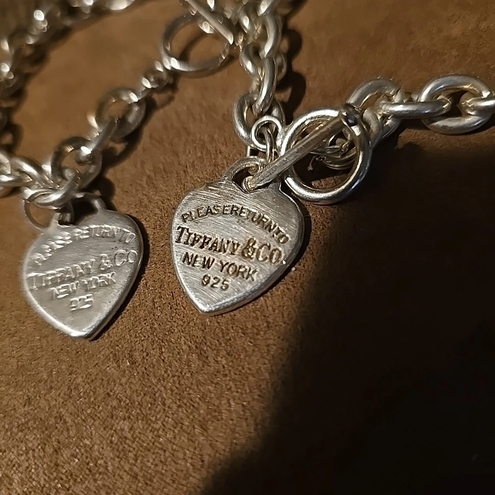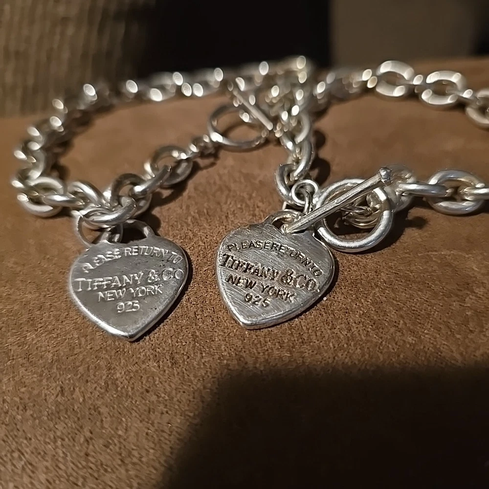 Elevate your style with this stunning 925 silver bracelet set from Tiffany & Co. The set includes a 9" bracelet and a 7" bracelet, both adorned with the iconic Tiffany & Co. Return to Tiffany collection charm. The bracelets feature a round link chain type and a toggle closure for a secure fit. The silver metal purity and charming design make this set a must-have for any jewelry lover. Add a touch of sophistication to your look with this Tiffany & Co. bracelet set.
