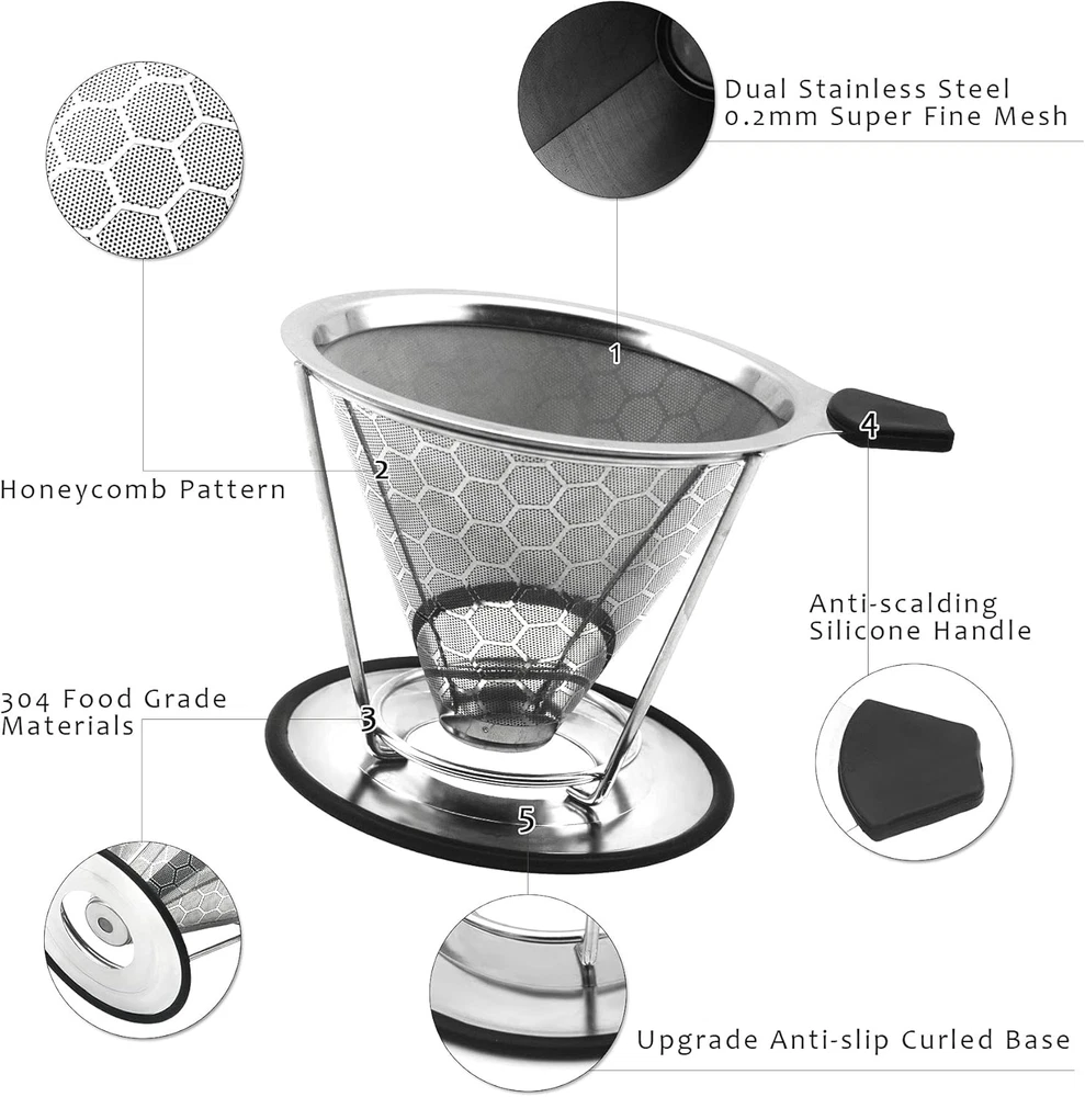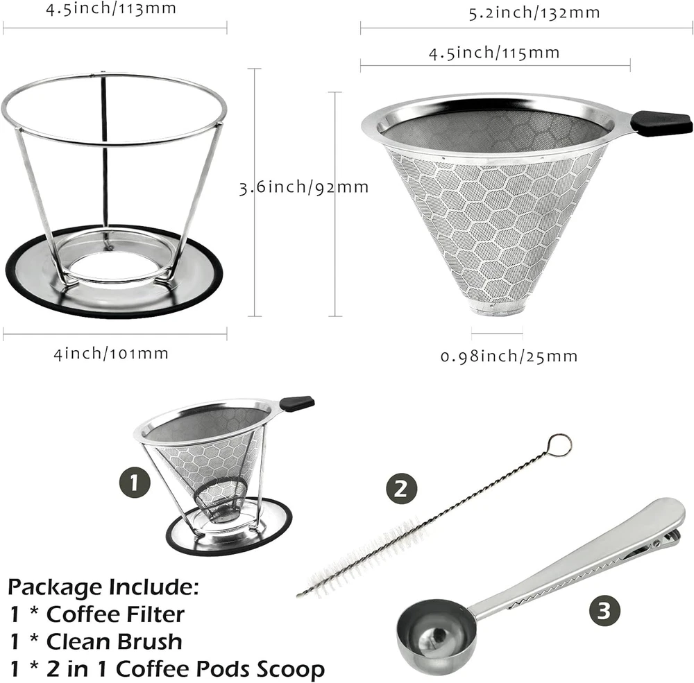 Store New Arrivals Add to Favorite View Feedback Contact Reusable Coffee Filter Professional Manual Stainless Steel Coffee Dripper Cone Coffee Strainer Paperless Coffee Maker for 2-4 People with Removable Cup Stand, Cleaning Brush, Coffee Scoop Description Item model number KD015 Unit Count 1 Count Material Stainless Steel Item Weight 9.2 ounces Shape Cone Number of Pieces 3 Package Dimensions 5.35 x 5.28 x 4.25 inches Size Removable Cup(For 1-3 People) Enhance Your Coffee’s Flavor: Our coffee filters are designed in double layers with high quality food grade 304 stainless steel without using paper filters. Super fine 800 mesh ensure no grounds end up in your cup. Fits Most and Safety Design: Divided design fits on most coffee pots and mugs. Silicone handle to resistance heat. Wide Anti-slip base to keep the filter steady for safety use. Easy to Use: No more paper filters needed. Just add coffee grounds in resuable coffee maker, slowly pour in the hot water, let the coffee drip out the water through the fine pour over filter, and remove the coffee dripper when done. Ready to enjoy your coffee. Easy to Clean: Just rinse the coffee filter with running water as soon as possible after enjoying the coffee. It is dishwasher safe. Take it Anywhere: Compact and lightweight, the coffee dripper works great at home or work or while traveling or camping. One cleaning brush and one 2 in 1 coffee Scoop with clips in this pour over set help you make coffee more convenient. Product Description Start A New Day With Easy Brewing a Coffee Are you tired of waiting in a long queue at the coffee shop for an expensive cup of coffee or worried about mess or filter from collapsing by making coffee yourself. Now, you can brew a cup of coffee in minutes anytime and anywhere by using LIGICKY Stainless Steel Pover Over Coffee Filter Set. Package Includes: 1 x Resuable Coffe Filter with Removable Cup Stand 1 x 2 in 1 Coffee Spoon 1 x Cleaning Brush LIGICKY Reusable Pover Over Coffee Filter Stainless Steel Coffee Dripper Metal Cone with Removable Cup Stand, Cleaning Brush, Coffee Scoop Enhance Your Coffee’s Flavor: Our coffee filters are designed in double layers with high quality food grade 304 stainless steel without using paper filters. Super fine 800 mesh ensure no grounds end up in your cup. Enviroment-Friendly and Budget-Friendly: A Enviroment-Friendly choice that eliminates the need for disposable paper filters that are expensive and wasteful. Tips: We recommend every 2-3 weeks to descale the pour over filter by soaking it in a solution of distilled vinegar and warm water Product Details: High Quality and Double Layers Design Our coffee filters are designed in double layers which is extra fine mesh with high quality food grade 304 stainless steel. Insulated Handle Design Silicone handle to resistance heat. Wide Anti-slip Base Design Wide Anti-slip base to keep the filter steady for safety use. Fit Most Design Divided design fits on most coffee pots and mugs Zero Waste and Reusable The filter is reusable , so it's a good for coffee filter papers, let's saving the trees and the Earth by skipping paper filters that leave waste. Easy to Brew Just heat up the water to your desired temp, add in your coffee grounds to the manual coffee maker and slowly pour in the hot water. Easy to Clean Rinse your tone coffee filter under warm running water. It is also dishwasher safe Travel-friendly Conveniently portable for your coffee needs anywhere, anytime! ABOUT US We offer the best prices around on high quality products. Our E-store includes media such as books, movies, music and games while offering electronics, toys, sporting apparel, clothing, tools, general home, garden items and more. SHIPPING We are always working hard to ensure your package arrives as soon as possible. Please understand that some factors like weather, high postal traffic, and the performance of shipping companies are outside of our control. We offer free shipping to the lower 48 states and ship within 2 business days of payment, usually sooner. We do not accept P.O. Boxes. Please provide a physical address. For shipping outside of the continental USA, we only use eBay's Global Shipping Program.The item is shipped to KY and then sent to the rest of the world. International customers are responsible for all duties and taxes. Continue to check out in order to calculate costs for shipping the item to your country. Messages regarding eBay's Global Shipping Program MUST be directed at eBay EXCLUSIVELY. RETURNS We offer a 30-Day Return Policy on items which you are not completely satisfied with. You have the option for a full-refund or an exchange of the item. No returns are available on items shipped outside of the USA. PAYMENT We accept PayPal. CONTACT US This page content is yet to come Please ad us to your favorite seller and visit again later Thank You CUSTOMER SATISFACTION We try our very best to make sure every customer is completely satisfied. If there's a problem, message us! We're happy to help. WE ACCEPT Copyright © 2021 AutoDS. | All Rights Reserved