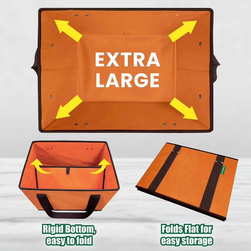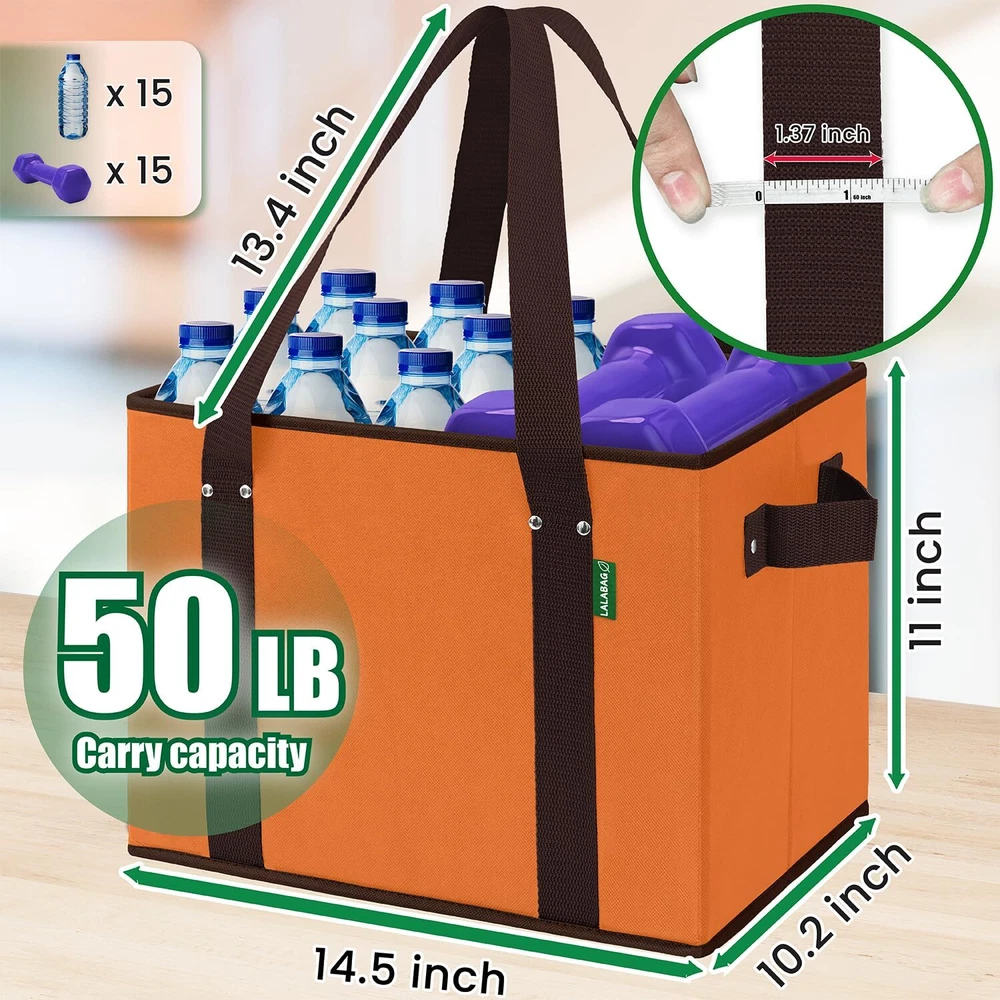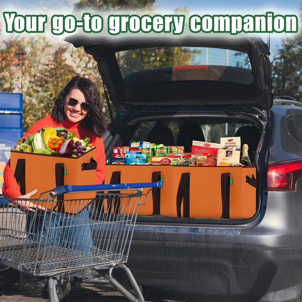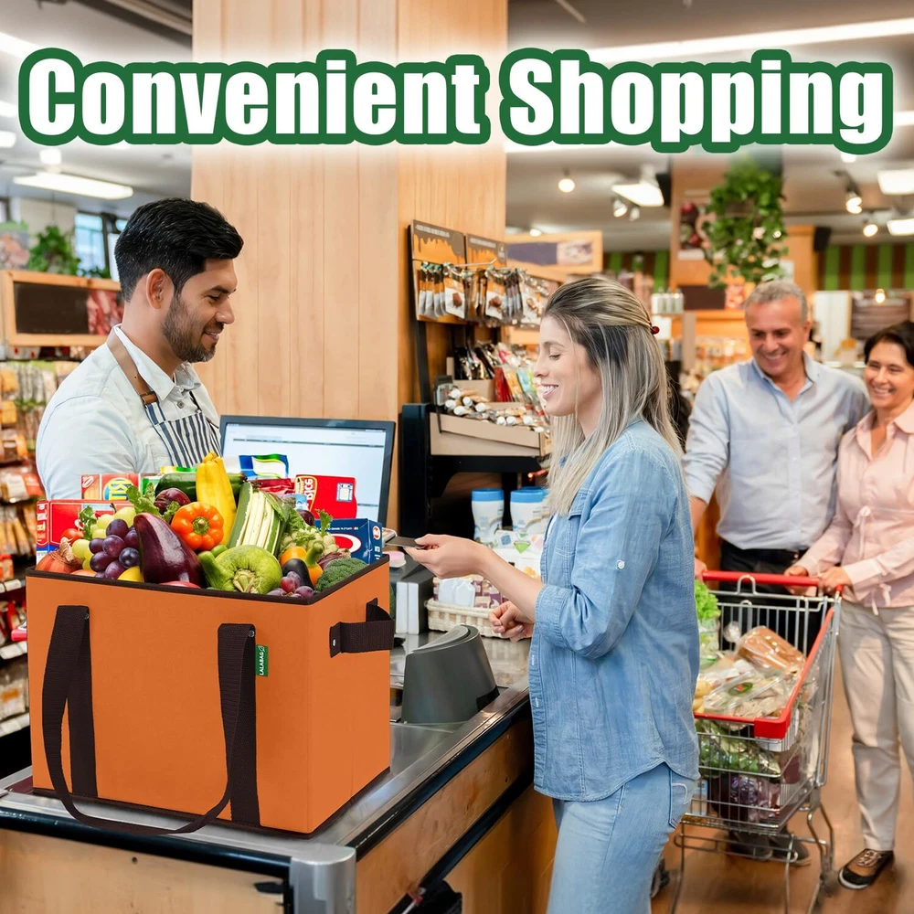 Our reusable grocery bags are the perfect choice for anyone looking to combine durability with aesthetics. Designed with a high load-bearing capacity, these bags can carry up to 43 lbs, making them ideal for heavy-duty shopping, food storage, and various other storage needs. The waterproof material protects your belongings from moisture, while the easy-to-clean interior ensures the bag stays fresh and hygienic. With a large capacity, these bags are perfect for trips to the grocery , supermarket hauls, or household storage. The foldable design makes it convenient to when not in use. Not just for shopping, these bags can also be used as beach totes, gift bags, or travel bags. Choose our reusable grocery bags to experience convenience, durability, and eco-friendliness. High Load Bearing Capacity: Our reusable grocery bags are designed to carry up to 50 lbs, making them perfect for heavy duty shopping and storage needs. No more worrying about broken handles or tears. Ideal for transporting groceries, produce, bulk items, and even kitchen supplies. Great for use as a shopping cart alternative. Large Capacity for Bulk Items: With a spacious interior, and dimension: 14.5'' (L) x 11'' (H) x 10.2'' (W) these bags can hold large quantities of groceries, produce, or other bulky items. Ideal for supermarket trips, farmers market hauls, and camping. Perfect for storing food, kitchen items, and more. The large size allows for easy packing and organizing of your groceries and household essentials. Durable and Long-lasting: Made from high-quality, waterproof materials, these reusable boxes are built to last. They are reinforced with sturdy piping and durable handles, ensuring they can withstand heavy use over time. These bags are also foldable for easy storage when not in use. The durable construction makes them perfect for long-term use, whether for daily shopping, travel, or storage. Easy to Clean Interior: The interior of these totes is designed to be easily wiped clean, ensuring they stay fresh and hygienic after each use. Perfect for carrying food items, groceries, drinks and other perishables without worrying about spills and stains. Versatile and Practical: These bags are not just for groceries. Use them for storage, as a tote for beach trips, as a laundry basket, or even as a gift bag. Their collapsible design makes them easy to when not in use. They are also perfect for travel, picnics, organizing various items, and even as a cooler bag for keeping food and drinks at the perfect temperature. The multi-purpose design makes them ideal for a variety of uses, from daily errands to special occasions.