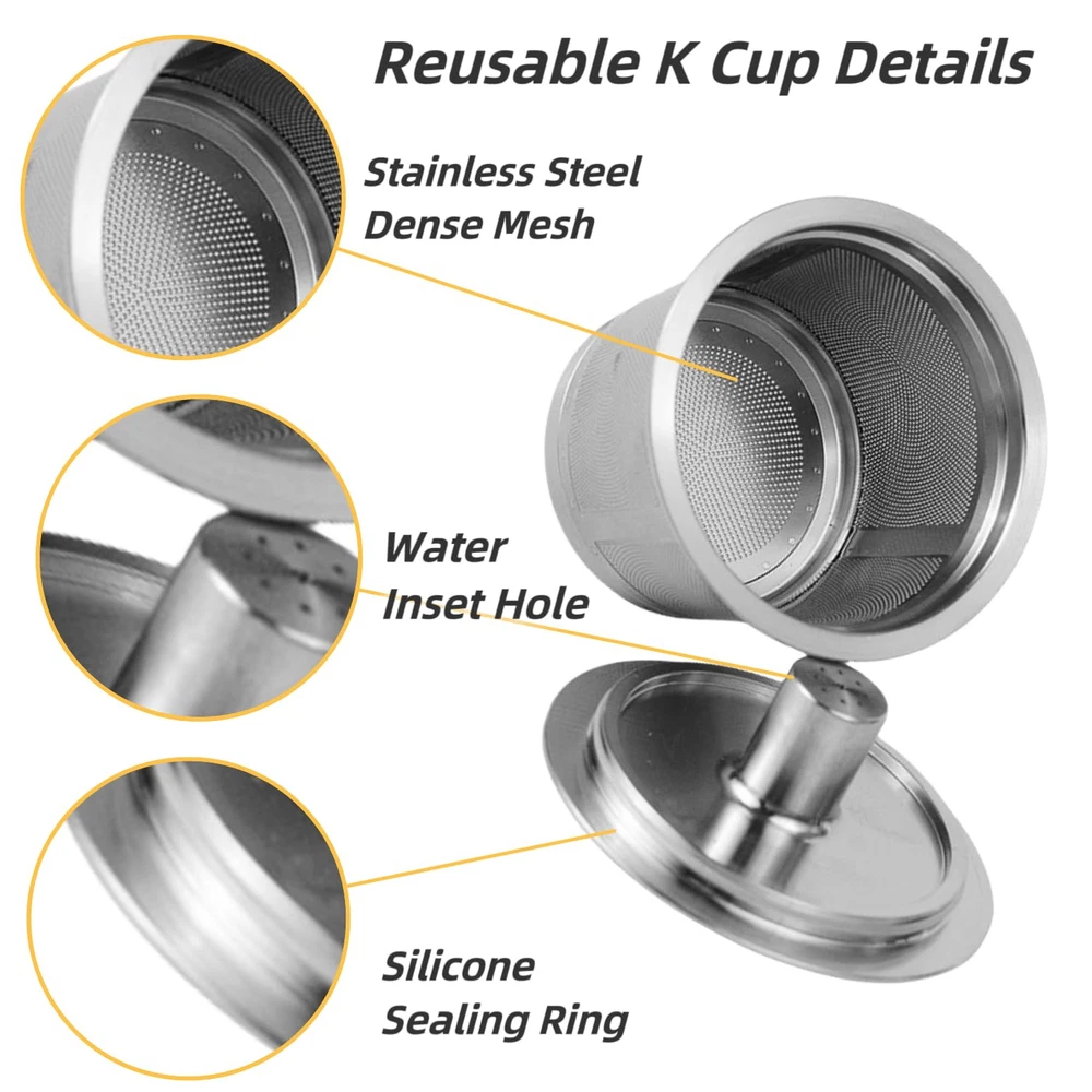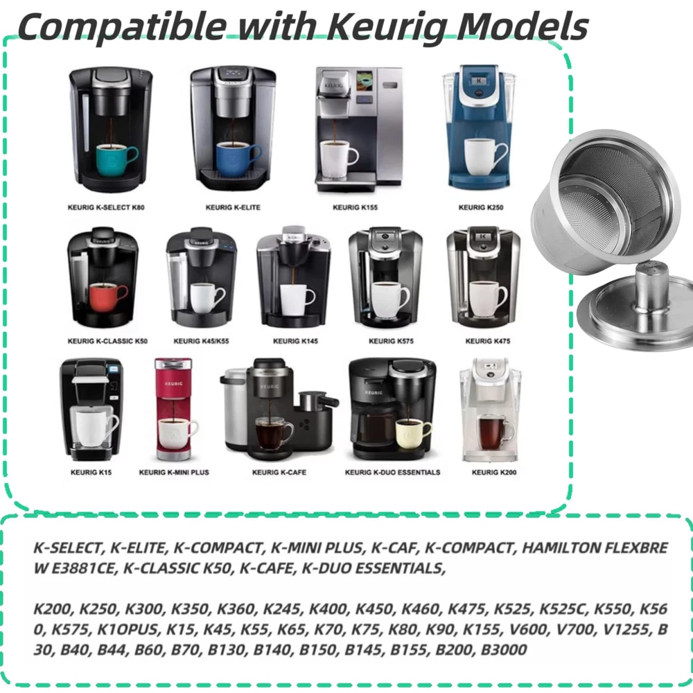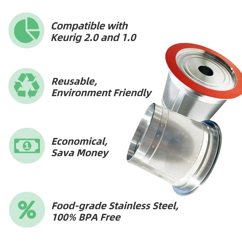 【Premium 304 Stainless Steel – Built to Last】 Made from high-quality 304 food-stainless steel, our reusable K-Cup coffee pod offers unmatched durability, ensuring years of reliable use. Unlike competitors with plastic components, the only non-metal part is a silicone seal on the lid for a perfect fit. Say goodbye to flimsy plastic alternatives and enjoy the safety and purity of stainless steel in every brew 【Universal Compatibility – Fits a Wide Range of Machines】 This refillable K-Cup is designed to work seamlessly with both Keurig 2.0 and 1.0 models, including K-Select, K-Elite, K-Mini Plus, K-Classic, and even Hamilton Flexbrew E3881CE. No matter which machine you use, this pod guarantees a smooth, consistent brewing experience (Full compatibility list in the product description) 【Eco-Friendly & Cost-Effective – Save Money, Save the Planet】 Ditch the disposable coffee pods and expensive paper filters! Our stainless steel K-Cup is an eco-friendly alternative that not only reduces waste but also saves you money in the long run. Brew your favorite coffee blends guilt-free, knowing you’re making a positive environmental impact with every cup 【Superior Brew Quality – Perfect Extraction for Every Cup】 Featuring an ultra-fine mesh filter, our K-Cup ensures even water flow and optimal coffee extraction, delivering a rich, smooth, full-bodied cup of coffee every time. Whether you love a bold espresso or a light roast, this reusable pod elevates the flavor, allowing you to customize your brew with your favorite ground coffee or tea 【Easy to Use & Clean – Effortless Brewing Experience】 Brewing a perfect cup has never been easier. Simply fill the pod with your preferred coffee grounds, pop it into your coffee machine, and enjoy! After use, rinse it under running water or toss it in the dishwasher for quick and easy cleaning. Its robust design ensures hassle-free use, making it ideal for daily coffee lovers who value convenience and quality