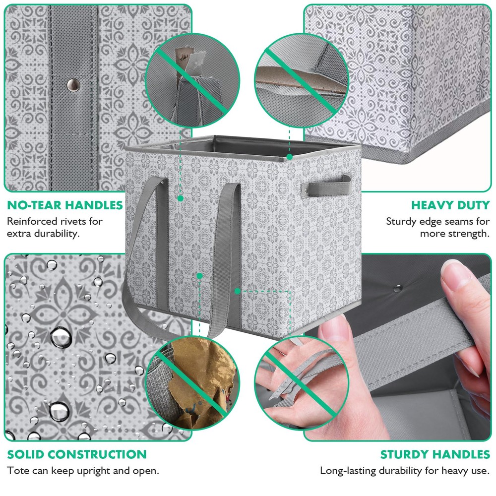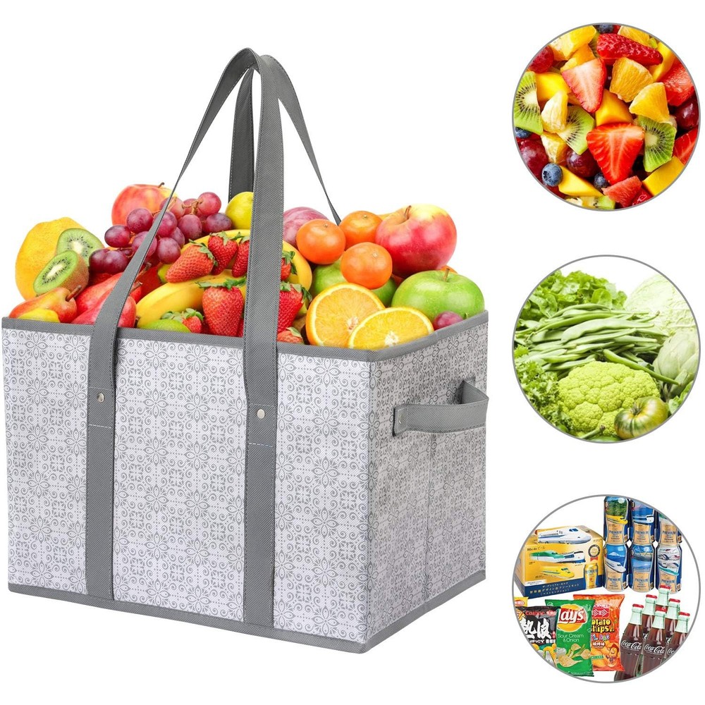 [Multi-Purpose] To organize books/CDs or to carry and organize laundry,cleaning supplies,art supplies. Also works as a reusable grocery bags to hold groceries in the car and hold picnics and snacks for the beach or camping. [COLLAPSIBLE] Folds up flat for easy storage when not in use. Cardboard bottom ensures that storage box will not shift when in use and will remain open and upright in car. [RIGID STRUCTURE] The eco reusable grocery box is made of heavy-duty non-woven floral fabric (with water resistant coating) reinforced and stiffened with long lasting recycled cardboard insert on each side offering a rigid structure when opened. [EASY TO CARRY] The shopping box bags have short side handles in addition to the shoulder straps making it easier to carry a heavy load. The shoulder strap are sewn down the side of the bag and secured with metal rivets for added strength. [REUSABLE] One reusable shopping bag is equivalent to 1000+ times of using plastic disposal bags. A great alternative to single-use plastic bags, to keep folded shopping bags in your handbag and car for emergencies or outdoor activities.