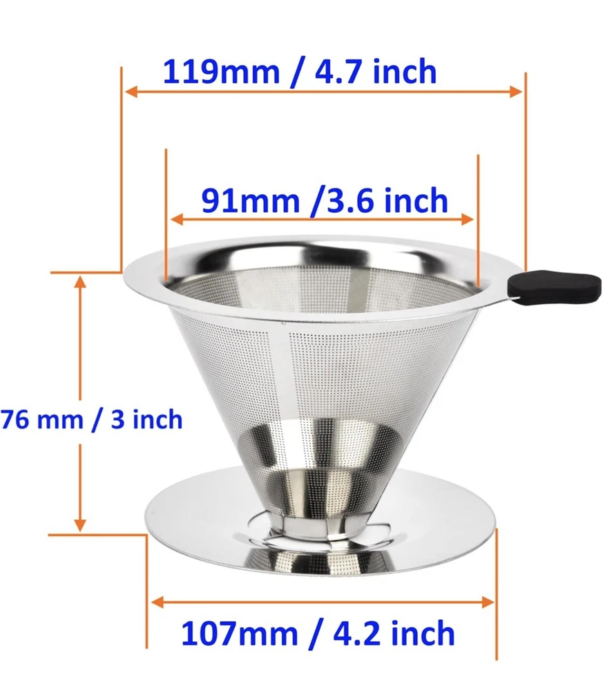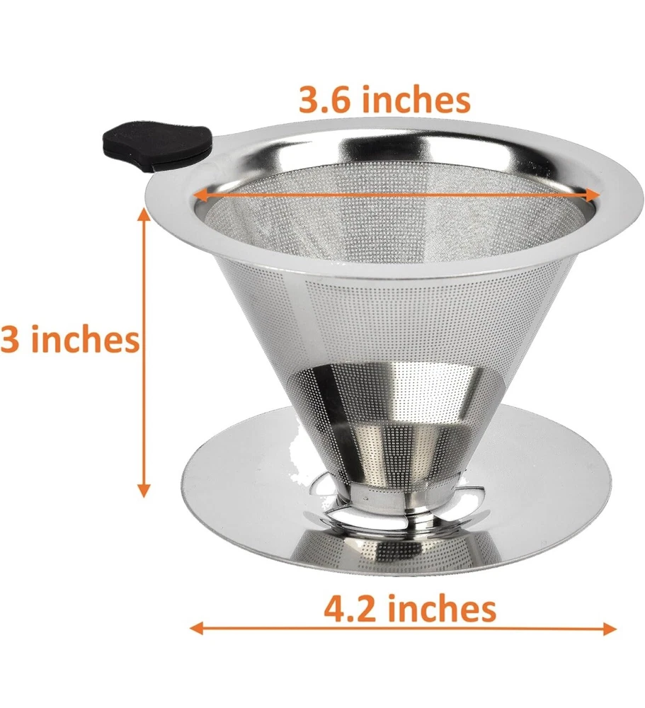 Great flavor: The coffee dripper is designed in double layer with high quality stainless steel, the inner filter is evenly distributed with ultra-fine mesh, which in combination with the high hardness outer filter allows coffee grounds to be completely saturated and ensures a particle-free drinking experience. Perfect fit: The stainless steel coffee dripper has a wide 4-inch diameter base that fits perfectly into most coffee cups, mugs and pots. Reusable coffee drippers are available to meet your different needs for a variety of occasions. Easy to clean: the cone coffee filter rinses quickly. Clean well every 3-4 weeks to descale the pouring filter with distilled vinegar and warm water, or leave the cone coffee filter in the oven for 4 ~ 5 minutes. Paperless and reusable: the slow drip reusable coffee filter is made of high quality stainless steel, safe and healthy. Reusable and paperless coffee filters preserve the taste of coffee better. Using a stainless steel drip coffee maker head not only reduces filter waste, but also saves time and costs. If you have any problems with the product, please contact our friendly customer service for a refund or replacement.