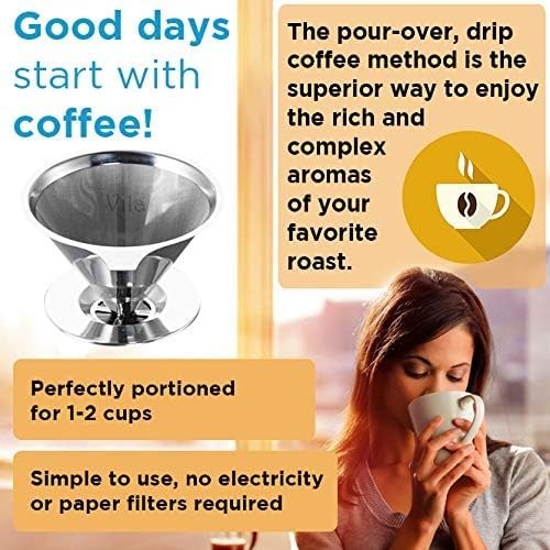 Reusable Stainless Steel Coffee Filter Fine Mesh Pour Over Dripper Paperless Taste Your Coffee, Not The Filter --- Coffee lovers agree that maintaining the flavor profile of a specific kind of coffee is essential to thoroughly enjoying a cup of coffee. Common paper coffee filters are white or brown paper filters that can affect the taste of your coffee. To ensure that you taste the delicious flavor of your special coffee, use the Vila Stainless Steel Coffee Filter. Save Money And The Environment --- Instead of paying for single-use paper filters over and over again, why not make a tiny investment into a reusable stainless steel coffee filter? Not only will the Stainless Steel Coffee Dripper from Vila save you money, but it will benefit the environment as well. Using treated paper filters can seep into the ground when dumped in landfills. Excellent For Pour Over Tea Brewing --- Not everyone is a coffee aficionado, but the Vila Stainless Steel Filter is useful for a wide variety of herbs and teas as well. Loose herbs, tea leaves and tea bags of all sorts can be brewed using the handy filter. Simply place your oolong, green tea, Earl Grey, chamomile or Darjeeling tea into the mesh filter, pour on hot water and allow to steep. Compact, Fits Standard Sized Coffee Cups --- The compact and lightweight Vila Coffee Dripper stands 3.5” (9 cm) tall and has a 3.9” (10cm) bottom base. It sits perfectly atop almost any coffee cup or mug without wobbling while your coffee drips smoothly in. Portable and practical, the coffee dripper is an excellent tool in your home kitchen, office lounge and camp site. Made Using Durable, Reliable Materials --- Made using high quality 18/8 grade stainless steel, the Coffee Dripper from Vila is extra durable, and is able to handle high temperatures. Reinforced fine steel mesh is used so that no grounds end up in your coffee. Stainless steel is a superior choice to paper, plastic, ceramic and glass coffee filters. Product description Maintains Integrity of Coffee Flavor Profile From bright and lively Arabica coffee blends to deep and earthy Sumatra coffee, there are so many different types of coffee flavor profiles to try. Forget about paper coffee filters that can dilute the flavor of yummy coffee grinds and embrace the benefits of a reusable stainless steel coffee dripper. You will finally be able to fully enjoy the essences and oils of each new coffee blend that you taste. The Vila Stainless Steel Coffee Dripper is necessary for any coffee connoisseur that truly appreciates the rich, bold and unique flavors that come from a handcrafted cup of coffee. How to Use the Pour Over Coffee Dripper The simple to use Vila Stainless Steel Coffee Dripper gives you the power to brew amazing coffee like a professional barista. Preheat the coffee filter by pouring hot water over it and then place the base on top of the cup, pot or mug that you intend to fill with delicious coffee. Add two tablespoons of coffee grounds per six ounces of water Slowly begin pouring the hot water into the cone shaped filter in a circular motion, keeping the water level consistent. Allow the coffee grinds to brew and flow through the tight fine mesh bottom and into your cup. When finished, dump the grinds, wash the filter and enjoy your delectable cup of joe. Cleaning Instructions: Once you are done using the coffee brewer, simply rinse it under running water or put it in your dishwasher immediately after use to restrict coffee grinds and oils from clogging. For prolonging its shelf-life, soak the filter in a solution of half white vinegar and half water for 30 minutes or leave the pour over coffee filter in the oven for 4 ~ 5 minutes once a month. The high-temperature roasting can help remove the fine coffee residues in the filter. 5.04 inches x 5.08 inches x 3.98 inches. Weight: 5.0 oz Unit Count 1.0 Count Material Stainless Steel Global Trade Identification Number 00735899170779 Item Weight 5 ounces Shape Cone Manufacturer Creative Store Package Dimensions 5.08 x 5.04 x 3.98 inches Number of Pieces 1