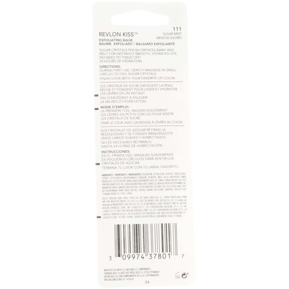 Product Description Revlon Kiss Exfoliating Balm uses real sugar crystals to polish dryness away, then melts to provide softer, smoother lips. Infused with natural fruit oils and a soothing sweet mint flavor, this lip balm provides 24 hours of hydration. Use alone to instantly smooth lips or as a prep step for lip color application. Real sugar crystals polish dryness away and then melt for softer, smoother lips Formula infused with natural fruit oils for 24 hours of moisture Use alone for instantly smooth lips OR as a prep step for better lip color application Soothing sweet mint flavor Product Description Revlon Kiss Exfoliating Balm uses real sugar crystals to polish dryness away, then melts to provide softer, smoother lips. Infused with natural fruit oils and a soothing sweet mint flavor, this lip balm provides 24 hours of hydration. Use alone to instantly smooth lips or as a prep step for lip color application. Real sugar crystals polish dryness away and then melt for softer, smoother lips Formula infused with natural fruit oils for 24 hours of moisture Use alone for instantly smooth lips OR as a prep step for better lip color application Soothing sweet mint flavor Disclaimer The product descriptions and instructions provided by vitabox.com are for informational purposes only and are qualified in their entirety by the information available from manufacturers of the products. You should carefully read all product packaging, and contact the manufacturer with any questions before using a product. While we endeavor to ensure that product descriptions are current, manufacturers sometimes change their products. We are not liable for inaccuracies or misstatements about products. We do not provide medical advice or recommendations. You should not use the information provided by vitabox.com for diagnosing or treating a health problem or disease. If you have or suspect that you have a medical problem, immediately contact your health care provider. Information and statements regarding dietary supplements have not been evaluated by the Food and Drug Administration or any other government agency and are not intended to diagnose, treat, cure, or prevent any disease.