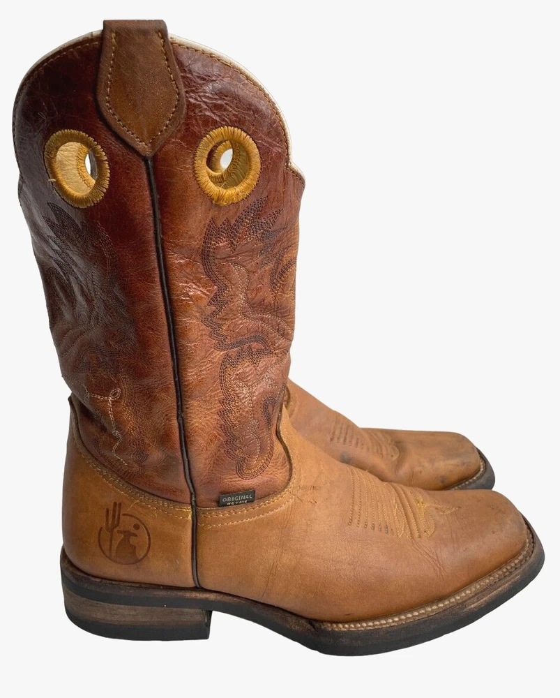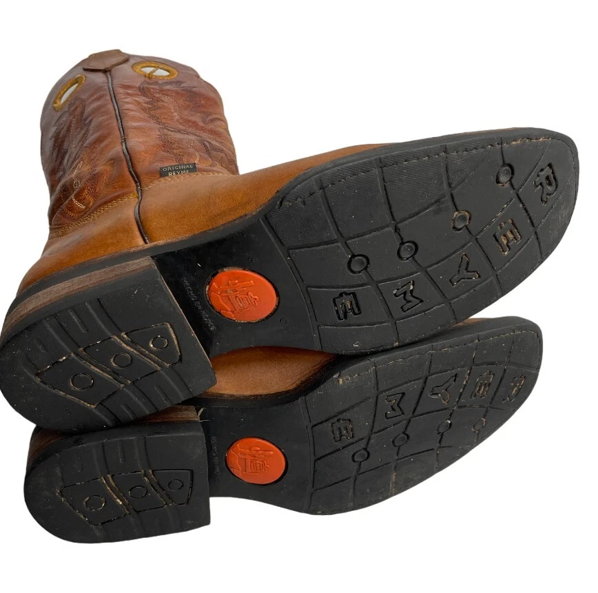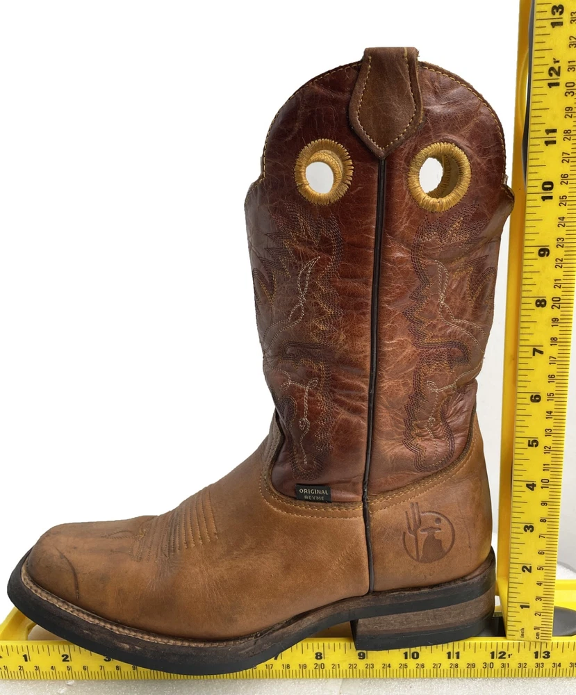 Upper Material: Leather Shoe Shaft Style: Mid-Calf Shoe Width: Standard Features: Comfort Department: Men Closure: Pull On Color: Brown US Shoe Size: 8 Type: Boot Pattern: Western Toe Shape: Square Toe Accents: Embroidered Theme: Cowboy, Western Brand: Reyme Style: Western