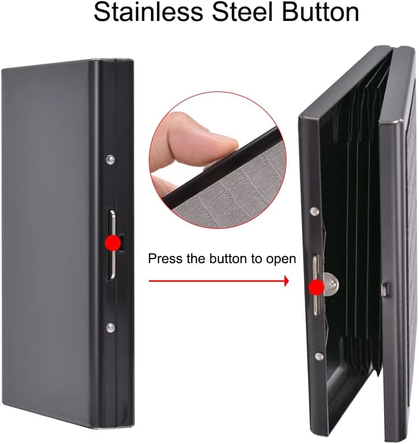 1.SLIM & RFID DESIGN:Easy to carry and put the card holder in any pocket. RFID blocking signals business card holder can protect your credit card wallet from unauthorized scanning. 2.SIZE: Mini size(3.74" x 2.59" x 0.5"), Light weight(0.2LB), 6 card slots, designed to hold credit card, debit card, id card, gift card, business card, ATM card, cash etc. 3.MATERIAL: This small card case is made of stainless steel + PU leather,more stronger and durable than plastic or aluminum item. 4.QUICK ACCESS: The accordion card slots design let you see the cards clearly and easy to take out & put in. 5.PERFECT GIFT: This metal card wallet is packed with individual box, It is a perfect gift for men and women. Not only can be used for yourself, but also it is the wondeful birthday gift for father mother grandfather daughter and friends. Product Description Slim Credit Card Holder Many Colors Credit Card Holders for Men Women Minimalist Accordion Card Holder Wallet Mini size(3.74" x 2.59" x 0.5"), Light weight(0.2LB). This business card holder wallet can up to 6 cards, fit for various of cards such as credit card, ID card and metro card. Perfect workmanship --Stainless steel metal material. --PU is attached on the front. --PVC card slots inside. Rfid Blocking RFID Blocking Metal Business Credit Card Holder. Keeps Your Vital Information Secure. Be Safe and Protected from Electronic Pick Pocketing. Slim Design Easy to carry and put the card holder in any pocket or bag.