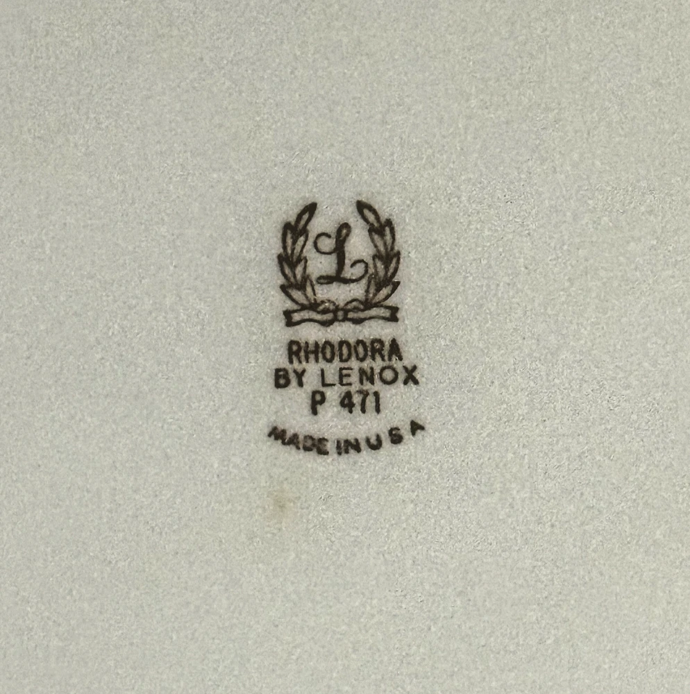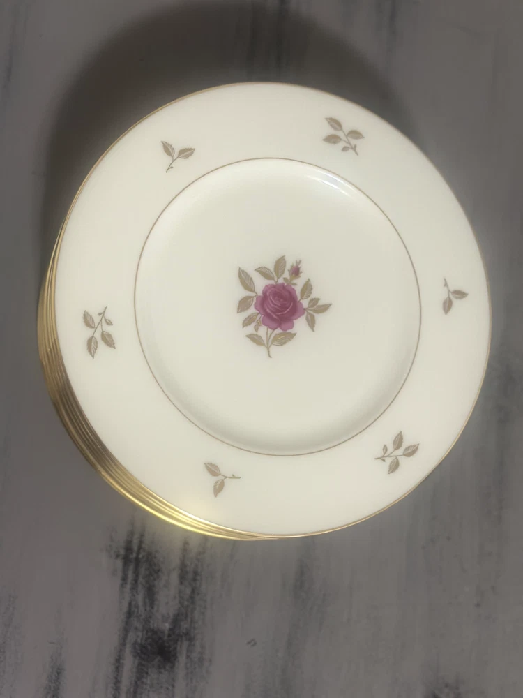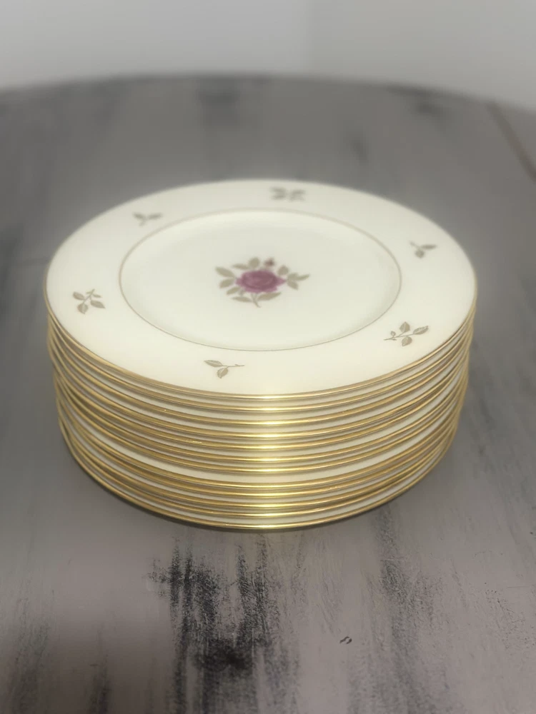 I have 12 gorgeous Salad plates from the Vintage, Discontinued "Rhodora" (P 471) Pattern. They are 8 1/4" in diameter, and are cream colored with Gold trim & leaves, with a beautiful Pink Rose at the Center. Lenox is the only manufacturer of Bone China in the US. This set was hardly ever used, as they were my grandmothers formal china and were only brought out on rare/special occasions. I am selling: Full Set of 12 plates: $420 Set of 6 plates: $215 Set of 4 plates: $130 Set of 2 plates: $60