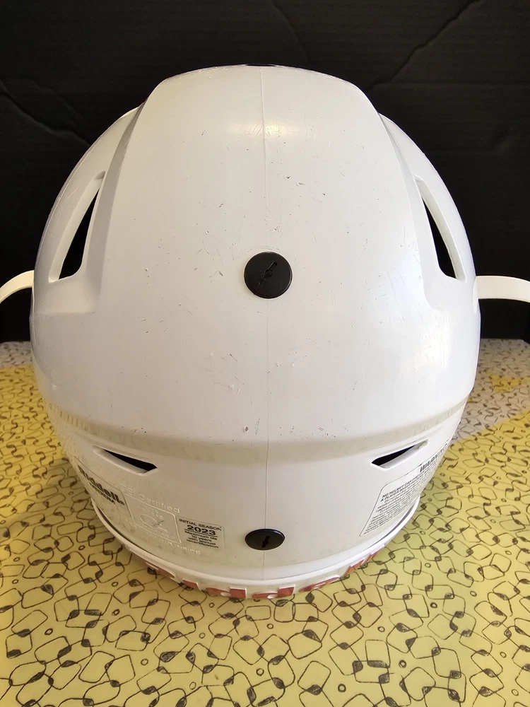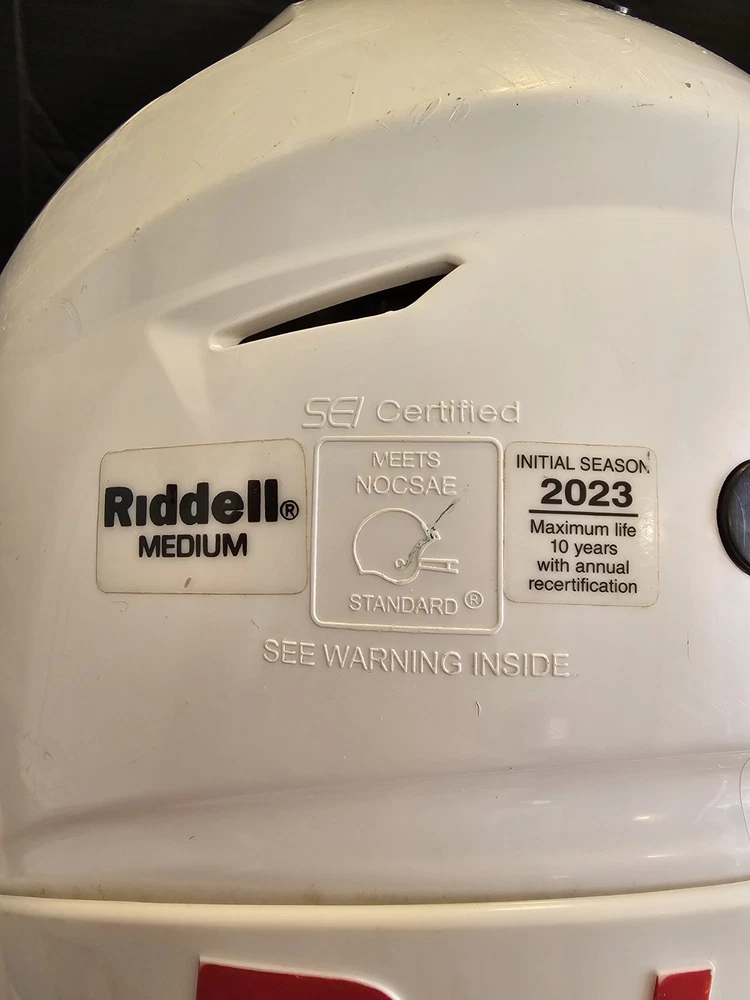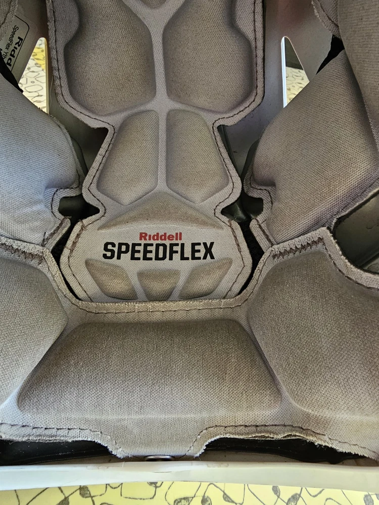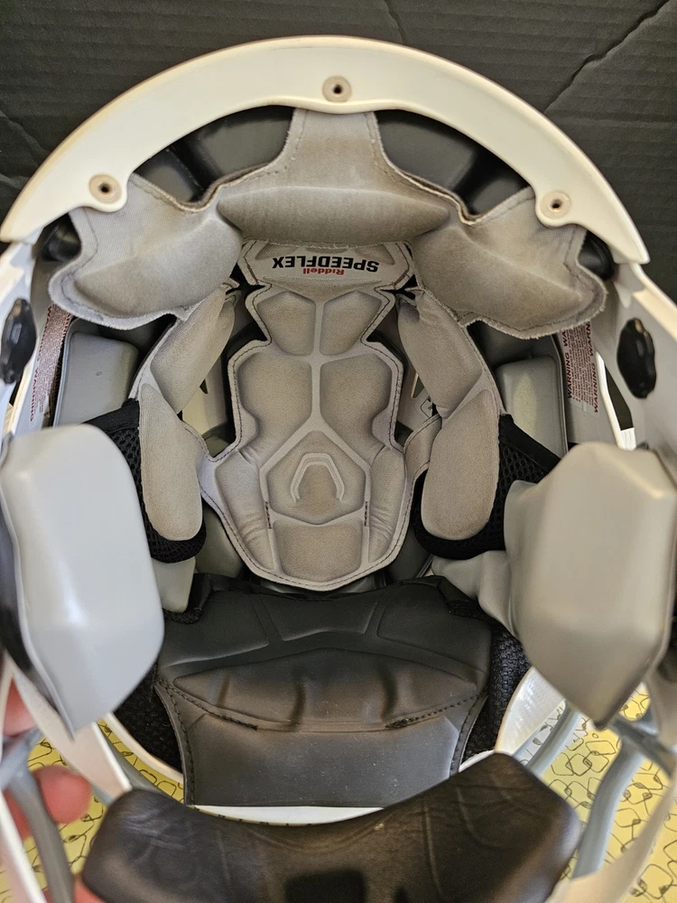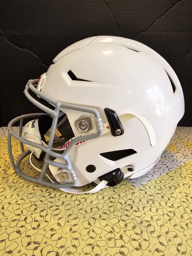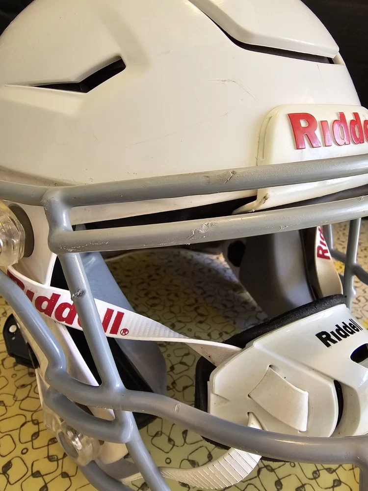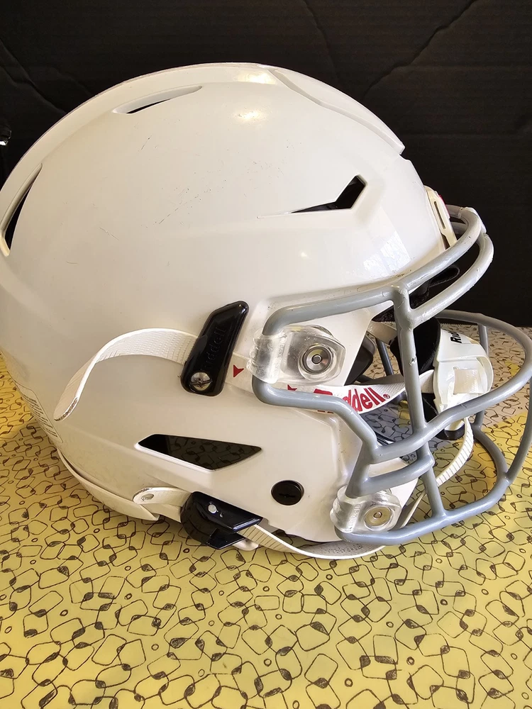 Stay protected on the field with the Riddell SpeedFlex Medium Youth Football Helmet. This helmet features a full face design with a matte white finish, attaching with a chin strap for a secure fit. It has more than 6 vent holes for breathability and is designed for boys in the medium size. Perfect for football, this helmet is the ultimate choice for any young athlete looking to stay safe while playing their favorite sport. Good condition. Some wear See pictures