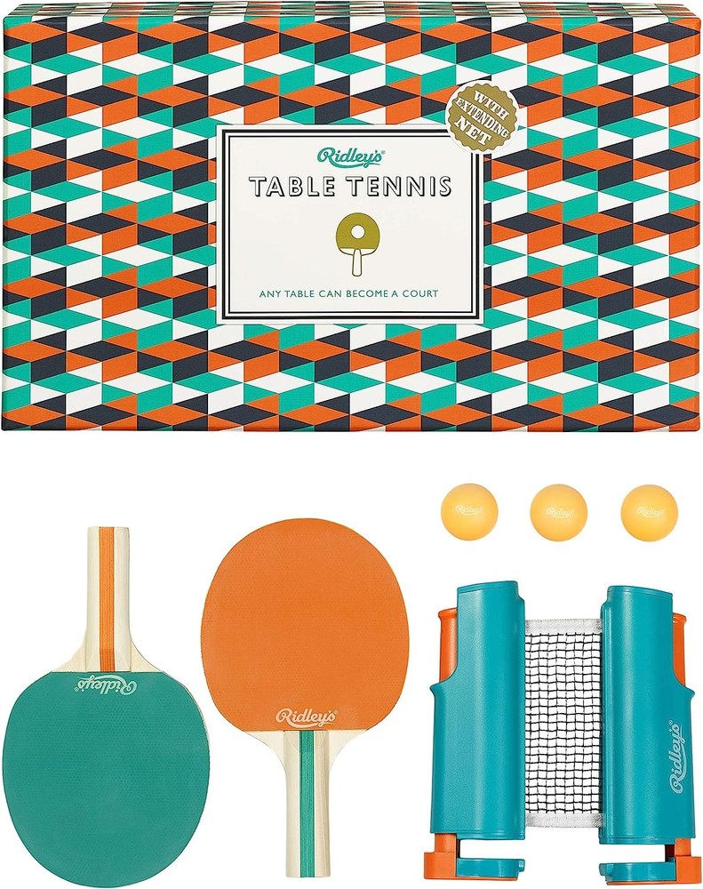 Further Details Title: Ridley's Table Tennis Set With Extending Net Great Gift Idea Condition: New Description: PRODUCT DESCRIPTION Any table can become a court with this table tennis set from Ridley's games room. The all-in-one set includes two branded orange and teal wooden bats with a rubber finish, three orange balls and an adjustable clamping net that can be fixed to any surface. Take the net posts and pull them apart to extend the net, clip one post over the table edge using the simple non-slip clamp built into the bottom, then pull the other post across the length of the table and fix it in place to set up the net. The vice grips on each post not only grip well to ensure stability, but they are also soft enough to ensure that no marks are left on the play surface after use. Play the classic game in the office, in the sports Club, in the pub or even on the train. Attaches to any table up to 1530 mm wide. Packaged in a branded geometric box. Box Dimensions: 167 mm x 281 mm x 88 mm. Safety Warning Not Applicable See all SAFETY WARNING Not suitable for children under 36 months. Small Parts. Choking Hazard BOX CONTAINS 1 x Table Tennis Set See more Brand: Ridley's Color: Multi-coloured Material: Wood, Cardboard, Rubber Type: Sets Missing Information? Please contact us if any details are missing and where possible we will add the information to our listing.