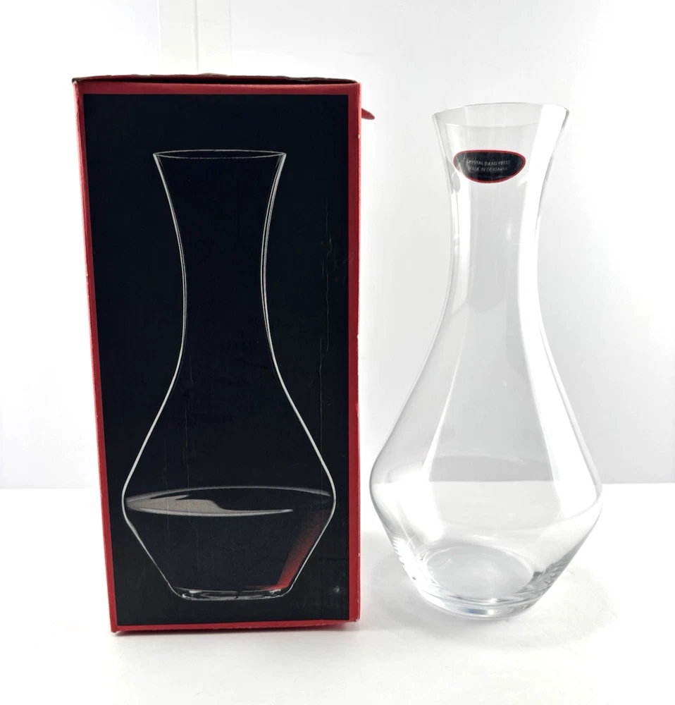 This is a RIEDEL Merlot Decanter made of crystal, lead-free, and crafted in Germany. The decanter is clear in color and comes in an open box. It is designed specifically for Merlot wines, featuring a sleek and elegant design perfect for aerating and serving wine.