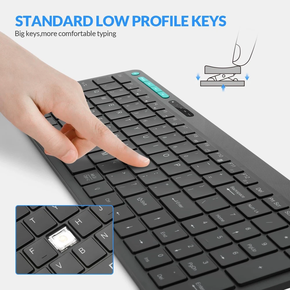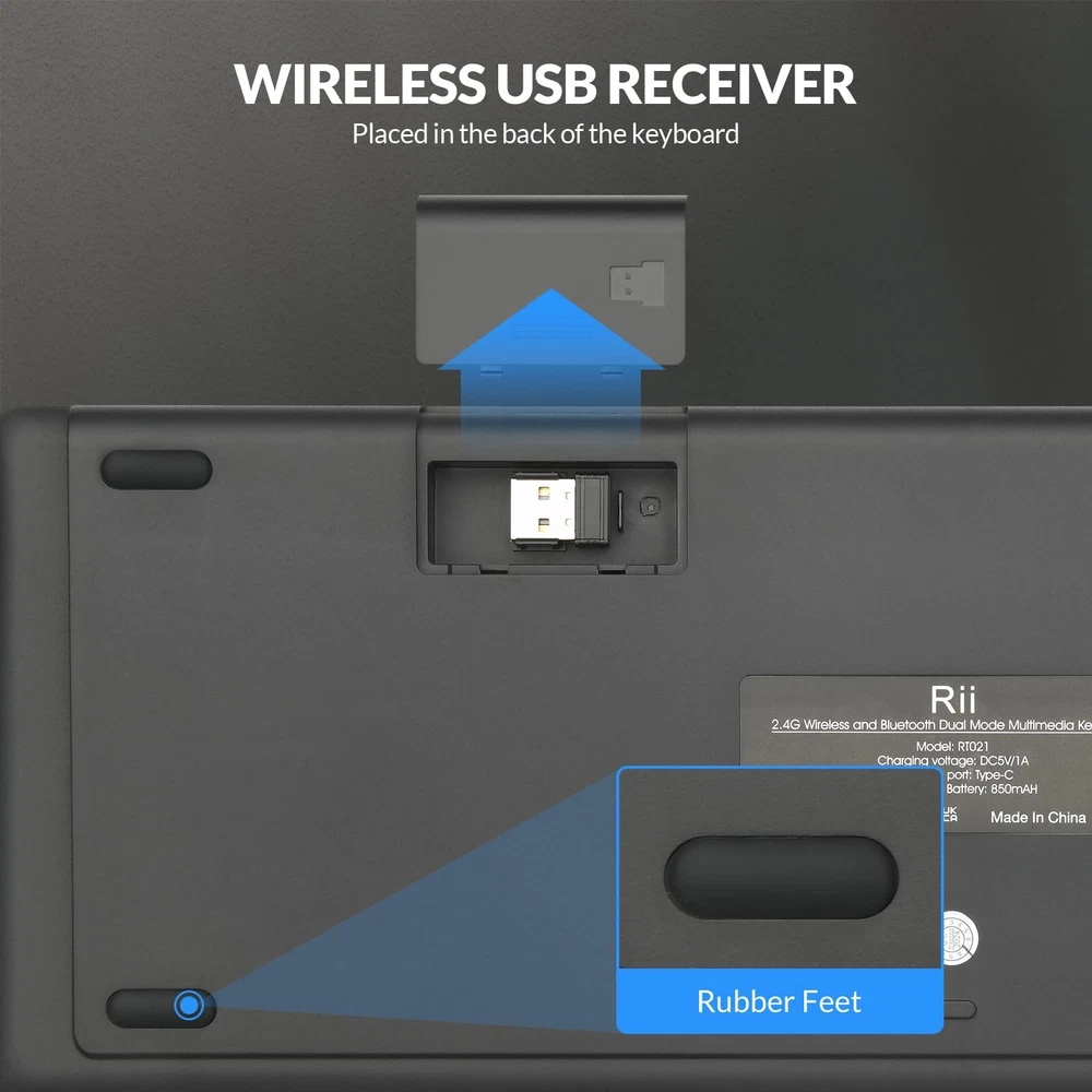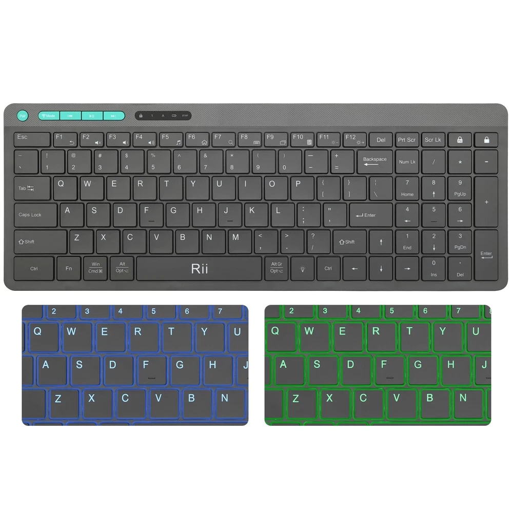 Rii Bluetooth Keyboard,Wireless Keyboard Bluetooth 5.1,Dual Model Backlit Keyboard,Rechargeable Keyboard with Number Pad, Compact Keyboard for iPad,Tablet,PC,Computer,Laptop (Black) Product Details Color: Black Brand: Rii MPN: USRT021 EAN: 6974972303169 UPC: Does not apply Brand: Rii Compatible Devices: Projector, Laptop, PC, Tablet, Smartphone Connectivity Technology: Bluetooth, USB-A Keyboard Description: Rii Bluetooth keyboard ,Dual Model Wireless Keyboard Bluetooth 5.0,Multi-Device keyboard with Number Pad for PC,Tablet ,office ,school See more Recommended Uses For Product: Everyday Use Special Feature: wireless keyboard with Backlit, keyboard with Dual Mode:Bluetooth 5.1+2.4G USB Dongle, Compact keyboard with Number pad, Bluetooth keyboard with silent keys, Multi Device Keyboard See more Color: Black Number of Keys: 105 Keyboard backlighting color support: Single Color Product Dimensions: 14"L x 5.2"W x 0.7"H Product Dimensions: 14 x 5.2 x 0.7 inches Item Weight: 1.06 pounds Manufacturer: Rii Country of Origin: China Item model number: USRT021 Batteries: 1 Lithium Ion batteries required. (included) Date First Available: September 27, 2024 Dual-Mode KeyboardWireless keyboard with Bluetooth 5.1 +2.4G modes and one switch button to control the two connections . The keyboard can connect one device through Bluetooth and another device through a 2.4GHz USB receiver. Connection distance upto 10m. with full size QWERTY keys and number pad . Rechargeable Keyboard Bluetooth Keyboard with rechargeable battery for environmental sustainability advocates. It could last 60hours continuous working ,140days standby. Featured power-saving takes the keyboard to sleep after 10 minutes of in Backlight Keyboard Compact Keyboard with Blue &Green LED Backlight.Turn on the Backlight makes your typing cool and clear. Compact Keyboard with Numeric KeypadMulti Device Keyboard with a standard numeric keypad. Features hotkeys, Calculator, Fn lock, Mute, Volume up and down, etc., to increase your workflow and productivity. Low Profile Laptop-Style TypingKeyboard with scissor key mechanism,it enhances feedback and stability. The optimized key-travel makes typing more comfortable and precise. Compatible Operation System Keyboard support Windows,Anroid,Mac OS,PC,Desktop,Smart TV,Android TV Box,Raspberry Pi.