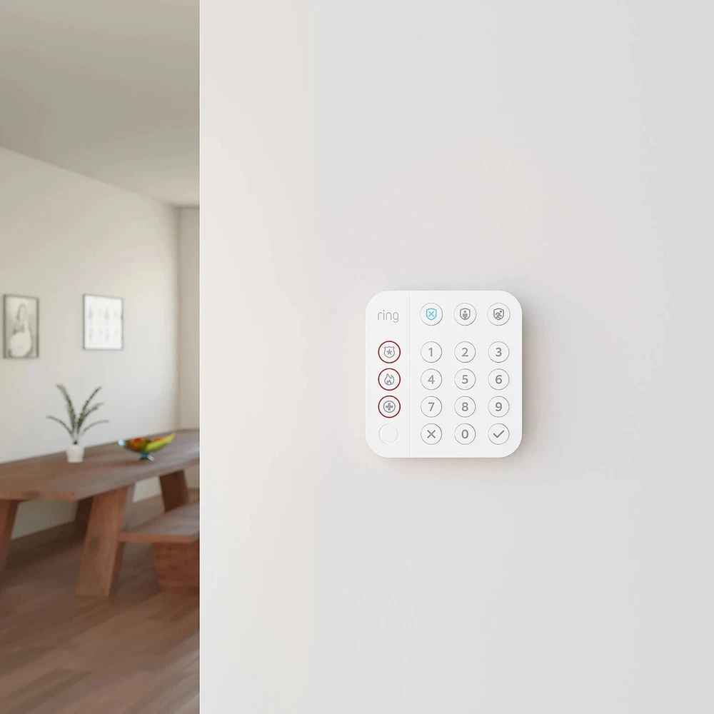 Keep an eye on your home while you're away with the Ring 8-Piece Alarm Home Security System. Receive an alert to your phone whenever a door or window is opened or motion is detected in your home while the system is armed, and utilize the 104-decibel siren to deter possible intruders. 104-decibel siren alerts you to any movement when the system is armed. Receive notifications to your phone or tablet when windows and doors are opened or motion is detected within your home. Customizable design can be expanded to fit any house or apartment. Panic Mode allows you to dispatch emergency services to your home from your keypad. 24-hour backup battery power. Utilize the app to control your entire home security system. Compatible with any iOS or Android device. Includes 1 base station, 1 keypad, 4 contact sensors, 1 motion detector and 1 range extender. Ring Alarm and all Ring Alarm accessories require a subscription for digital notifications, in-app features, digital arming/disarming, and integration with other Ring, Echo, and third party products. Subscription sold separately. Terms and conditions apply. Optional 24/7 professional monitoring with a Ring Protect subscription (sold separately). Connects to trusted third-party devices that are certified as "Works with Ring" Save up to $100 per year on home insurance with a professionally monitored Ring Alarm. (Actual savings vary depending on insurance carrier and policy). BONUS 1 Extra Motion Detector 1 Extra Contact Sensor 1 Ring Doorbell Wired Specs Item # 9714102 Manufacturer # 4K18SZ-0EN0 Model 8-Piece Alarm Home Security System Number Of Batteries 12 (Not included) Remote Control Included No Voltage 6 V Warranty None Width 5 in. Wireless Yes Alarm Type Security Battery Backup Yes Battery Size AA; CR-2032 Depth 9 in. Height 8 in. Quantity 8 Brand Name Ring Manufacturer RING