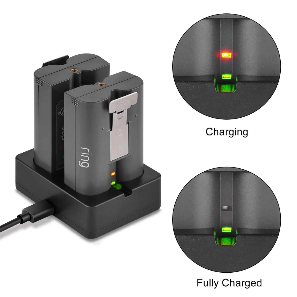 2-Port Charging Station for Ring Video Doorbell 2 and Spotlight Cam Batteries High Compatibilty 【MULTPLE CHARGING AT ONCE】 This Ring battery station can charge up to 2 batteries simultaneously, allowing you to change the batteries of your cameras via hot-swap and thereby reducing the downtime of your Ring. (NOTE: Ring batteries not included) 【THOUGHTFUL DESIGN】 Our patent-pending design allows you to easily look Ring batteries indicator lights that show whether the batteries are charging or are fully charged. 【EXCLLENT QUALITY】 Ring Rechargeable Batteries can slide easily in and out of the dual charging station, and each battery is charging individually, you can choose to charge only one or two backup batteries at the same time. 【 FCC CERTIFIED】 The Dual Port Charging Station good quality fire shell material and built-in safeguards, provides a short-circuit protection and effectively ensures safe charging, against over-heating, over-current and over-voltage. 【PACKAGES INCLUDED】 1 x Dual Charging Station; 1 x Power Cable. Note: Ring Rechargeable battery is not included. You can enjoy 12months warranty for this 2-Port Charging Station. If any problem, feel free to contact us. We'll surely help you and make you satisfied.