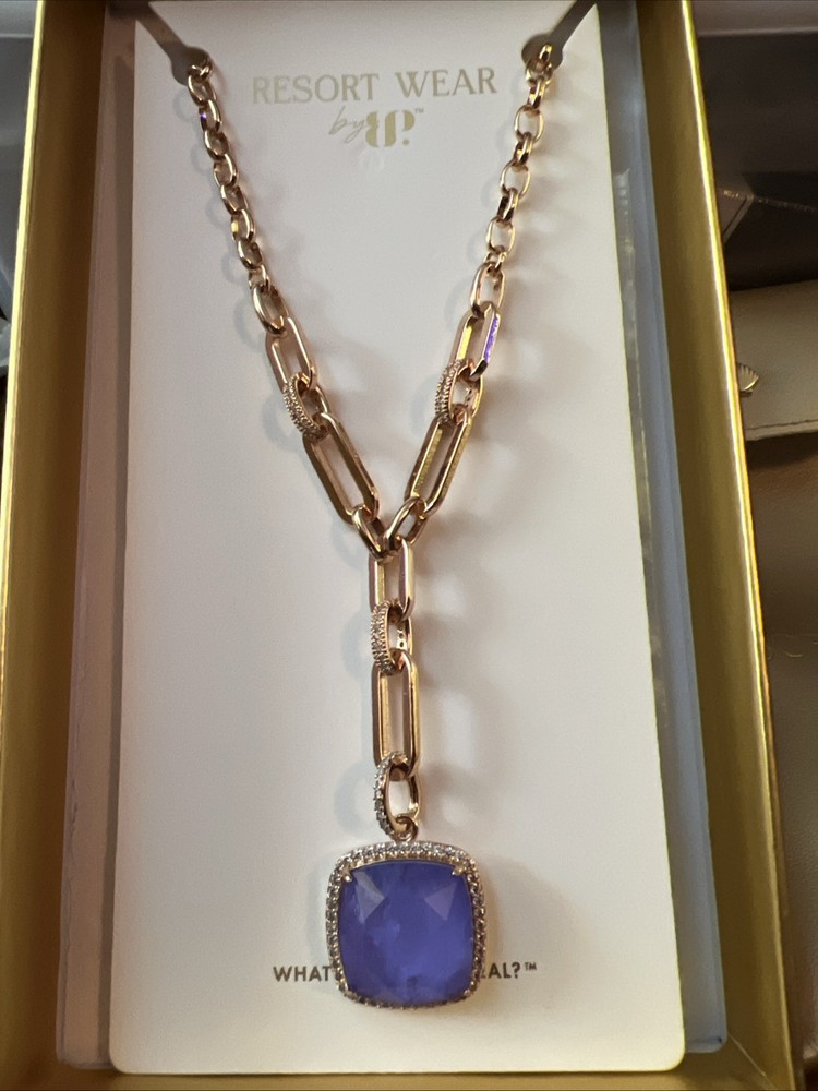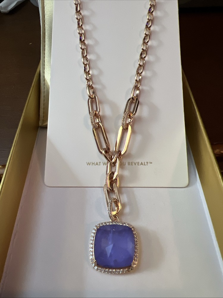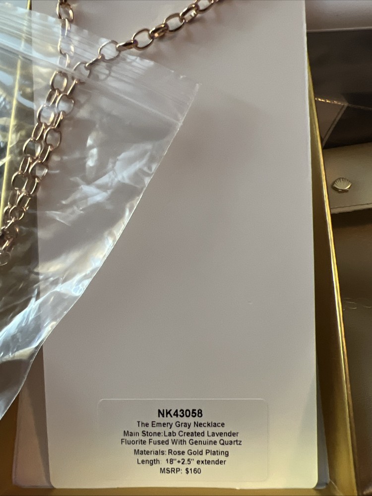 NK43058 The Emery Gray Necklace Main Stone: Lab Created Lavender Fluorite Fused With Genuine Quartz Materials: Rose Gold Plating Length: 18"+2.5" extender MSRP: $160 The "Ring Bomb Party, NK43058, The Emery Gray Necklace" features a pendant necklace with a unique design. The pendant is adorned with two stones in a lavender color, specifically Lavender Fluorite Fused With Genuine Quartz, creating a beautiful and eye-catching piece. The necklace is styled with a chain and rose gold plating, giving it a touch of elegance. It is designed in the USA and has a theme that includes beauty, art, beach, vacation, love, TV & movies, music & dance, and fashion & costumes, making it a versatile accessory for various occasions.