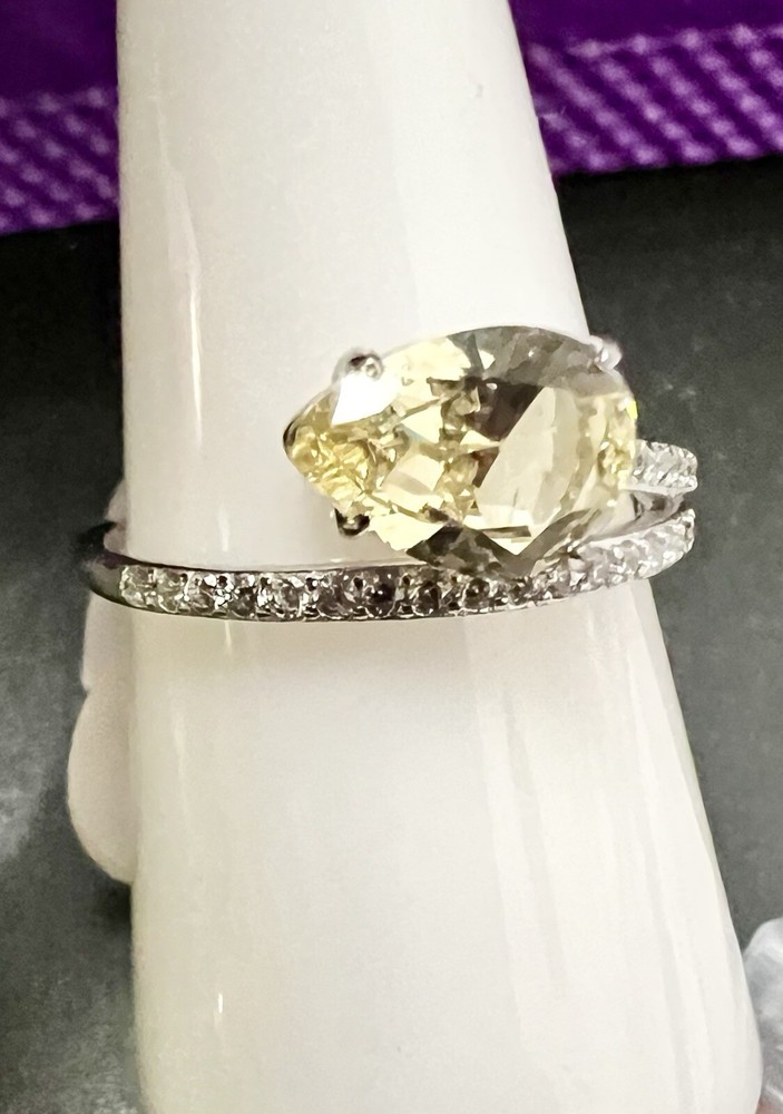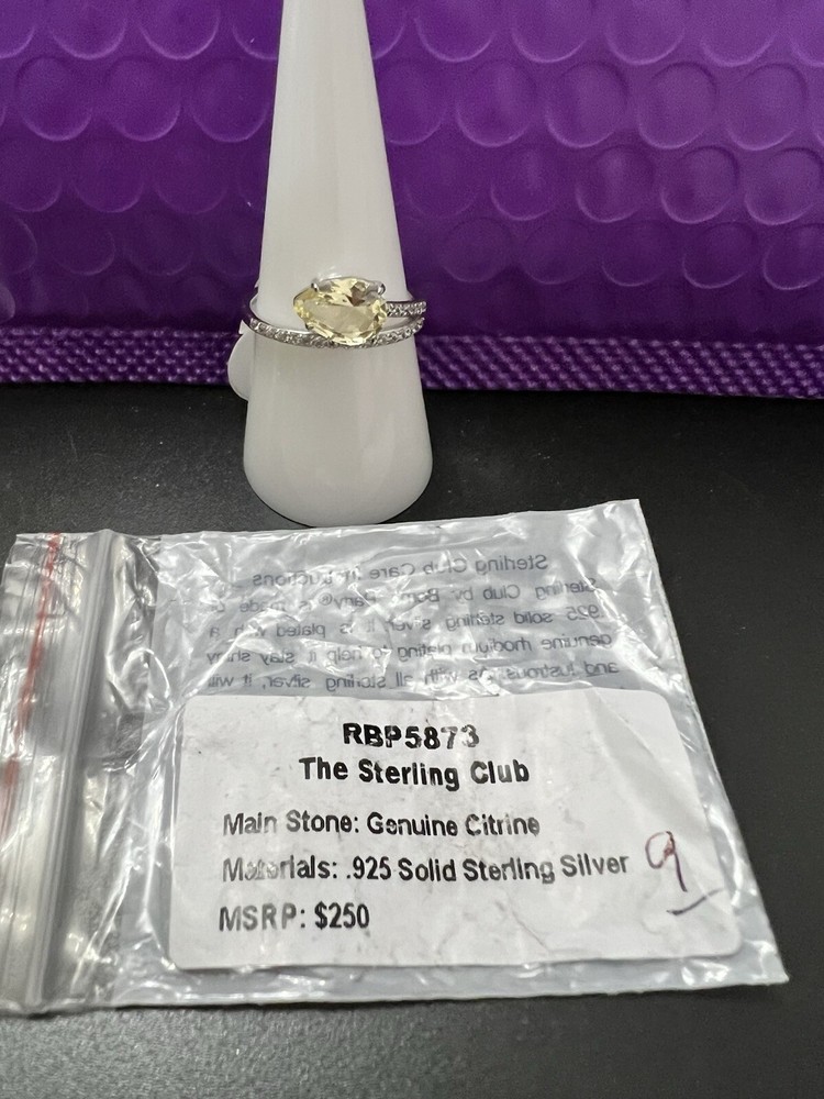RBP 5873 The Sterling Club Main Stone: Genuine Citrine Matarials: .925 Solid Sterling Silver MSRP: $250 The "Ring Bomb Party, RBP 5873, The Sterling Club, Genuine Citrine" is a Sterling Silver ring featuring a genuine Citrine gemstone in a circular shape. It is designed in the USA and belongs to The Sterling Club collection. The ring has a band style and is adorned with a beautiful Citrine stone, which is known for its warm yellow hue. This elegant piece of jewelry is perfect for adding a touch of sophistication and color to any outfit.