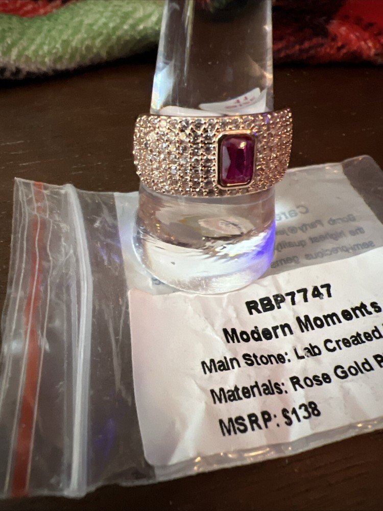 RBP7747 Modern Momems Main Stone: Lab Created Ruby Materlals: Rose Gold Plating MSRP: $138 Introducing the Ring Bomb Party RBP7747, a stunning piece of jewelry designed for the modern mom. This ring features a beautiful emerald-shaped lab-created ruby that is sure to catch the eye. The band is made of high-quality gemstone material and plated with rose gold, giving it a sleek and stylish look. With a ring size of 11, this band is perfect for those who want a comfortable fit. The Ring Bomb Party RBP7747 is a must-have for anyone who wants to add a touch of elegance to their wardrobe. This ring is designed in the USA and is of the highest quality. Don't miss out on this amazing opportunity to own a piece of jewelry that is sure to make a statement.