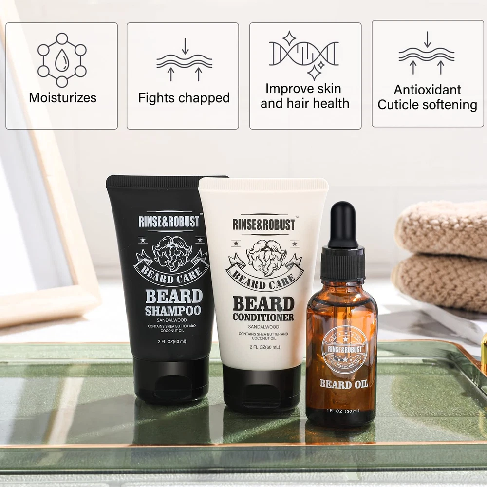 Rinse & Robust Beard Kit Care Grooming for Men Travel 8 Piece Set Product Details Package Dimensions : 9.8 x 6.02 x 2.64 inches; 1.1 Pounds Item model number : Sandalwood Manufacturer : Rinse & Robust 【Beard Grooming Set】Rinse&Robust 8pcs beard care set with travelling bag includes everything which could help you keep beard clean and tidy. Our well-made Beard Brush,Beard Comb,Beard Scissors make trimming,shaping your beard easier than ever.Of course also beard shampoo and conditioner, beard balm and beard oil are all in this travelling bag.Rinse&Robust are professional in men’s facial care and everything is designed for you. 【Sandalwood Fragrance】In terms of fragrance, we have selected natural sandalwood plant ingredients that are more masculine.All products in this 8pcs beard care kit are infused with the sweet and musky fragrance of sandalwood. Inhale the calming and relaxing aromas while grooming your beard. 【Natural Ingredients】Rinse&Robust promise that our products ingredients are no animal test,gluten free, just with high-quality, ingredients that high concentration of shea butter, additional squalane and beeswax ingredients so on could improve beard health and moisturize skin, never irritate. Our fragrance-free Beard Oil & Balm are gentler and safer. 【Travel Bag Design】Look no further for the perfect bag to bring with you on the go.Throw in all of your bath and beard care products for vacation or just to keep with you during your busy day for a quick refresh.Such an intimate and convenient packaging design can help you solve the problem of carrying daily care products when traveling. 【Perfect gift for Him】Look no further for the perfect gift that he will absolutely love! Whether it's for your love, your father, your brother or a friend, Rinse&Robust beard care set is sure to be enjoyed by anybody. A really nice Valentines gift choice for you. Having trouble finding the perfect gift for the man in your life? Look no further than our Rinse & Robust Bath Sets for men because men deserve self-care too! This set includes 8 pieces for a full beard grooming experience! Including Beard Shampoo, Beard Conditioner, Beard Oil, Beard Balm, Double-Headed Brush, Beard Scissors, Bristle Brush and a Travel Bag, this set is the perfect gift to give to to the bearded man or men in your life! Whether it is for your love, your father, your brother or a friend, this is the perfect gift for any occasion! Give this all-inclusive set for the holidays, birthdays, special occasions or just because. Rinse & Robust Men's Beard Care Set -Without: Phthalates, Parabens, Dyes. -Gluten free