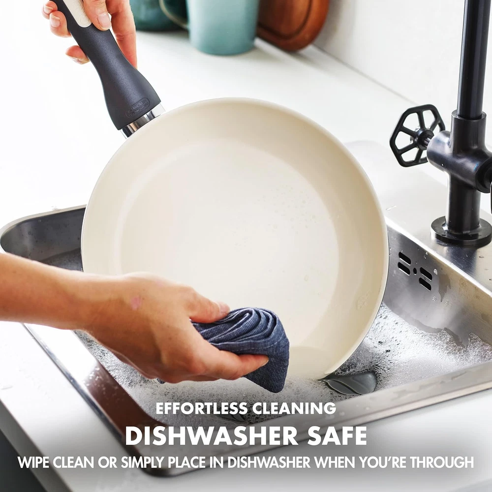 Rio Healthy Ceramic Nonstick 16 Piece Cookware Pots and Pans Set, Pfas-Free, Di SET INCLUDES: 5”, 8", and 10” frying pans, 1QT and 2QT saucepans with lids, 3QT sauté pan with lid, 5QT stock pot with lid, stainless steel steamer, bamboo solid spoon, bamboo slotted spoon, bamboo solid turner, bamboo slotted turner REINFORCED WITH DIAMONDS:Metal utensil safe, GreenPan's original diamond-infused nonstick coating offers remarkable durability, balanced heating, and effortless cleanup TOXIN-FREE: GreenPan's Thermolon healthy ceramic nonstick coating is free of PFAS, PFOA, lead, and cadmium TOUGH ALUMINUM BODIES: The heavy-duty aluminum construction offers extreme strength with quick and even heating every single time BUILT FOR OVEN COOKING: Oven and broiler safe up to 350°F and suitable for all stovetops, except induction ERGONOMIC HANDLES: This set’s stay-cool Bakelite handles are designed to give you a sturdy, comfortable grip without overheating ENJOY THE VIEW: The durable glass lids keep heat and moisture inside so you can watch all the action on the outside EASY TO CLEAN: These pans are dishwasher safe for easy cleanup, but most messes will wipe clean Add a touch of color to your kitchen with the vibrant style of the GreenPan Rio collection. This 16-piece cookware set features all the pots and pans you need to make your meals cleaner. Why? Each of these pots and pans features our Thermolon healthy ceramic nonstick coating—an easy release and wipe clean coating that’s free of PFAS, PFOA, lead, and cadmium for worry-free cooking. Unlike many other nonstick coatings, it will never release toxic fumes, even if it’s overheated. This durable coating is reinforced with diamonds to provide peak nonstick performance longer. The set’s heavy-duty construction gives you even heat distribution while the stay-cool Bakelite handles give you a comfortable grip and total control. Durable glass lids give you an easy view of your meal in progress without sacrificing heat. Dishwasher safe. These pans and lids are oven safe to 350°F. This cookware set includes: 5”, 8”, and 10” frypans; 1.2QT and 2.2QT saucepans with lids; 2.8QT sauté pan with lid; 5QT casserole with lid; stainless steel steamer; and 4 bamboo tools.. 21.65 inches x 9.06 inches x 12.8 inches. Weight: 19.56 lb Closure Material Glass Color Black Material Ceramic, PFAS Free Nonstick, Aluminum, Bakelite Handles Material Type Ceramic, PFAS Free Nonstick, Aluminum, Bakelite Handles Global Trade Identification Number 00885837019926 Is Oven Safe Yes Handle Material Bamboo,Metal,Stainless Steel Size 16 Piece Cookware Pots and Pans Set Material Type Free Cadmium Free, Perfluorooctane Sulfonate (PFOS) Free, Perfluorooctanoic Acid (PFOA) Free, Bisphenol-A (BPA) Free, PFAS Free, Lead Free Is the item dishwasher safe? Yes Compatibility Options dishwasher safe Included Components Set Includes: 5”, 8” & 10” frypans, 1.2QT & 2.2QT saucepans with lids, 2.8QT sauté pan with lid, 5QT casserole with lid, stainless steel steamer and 4 bamboo tools