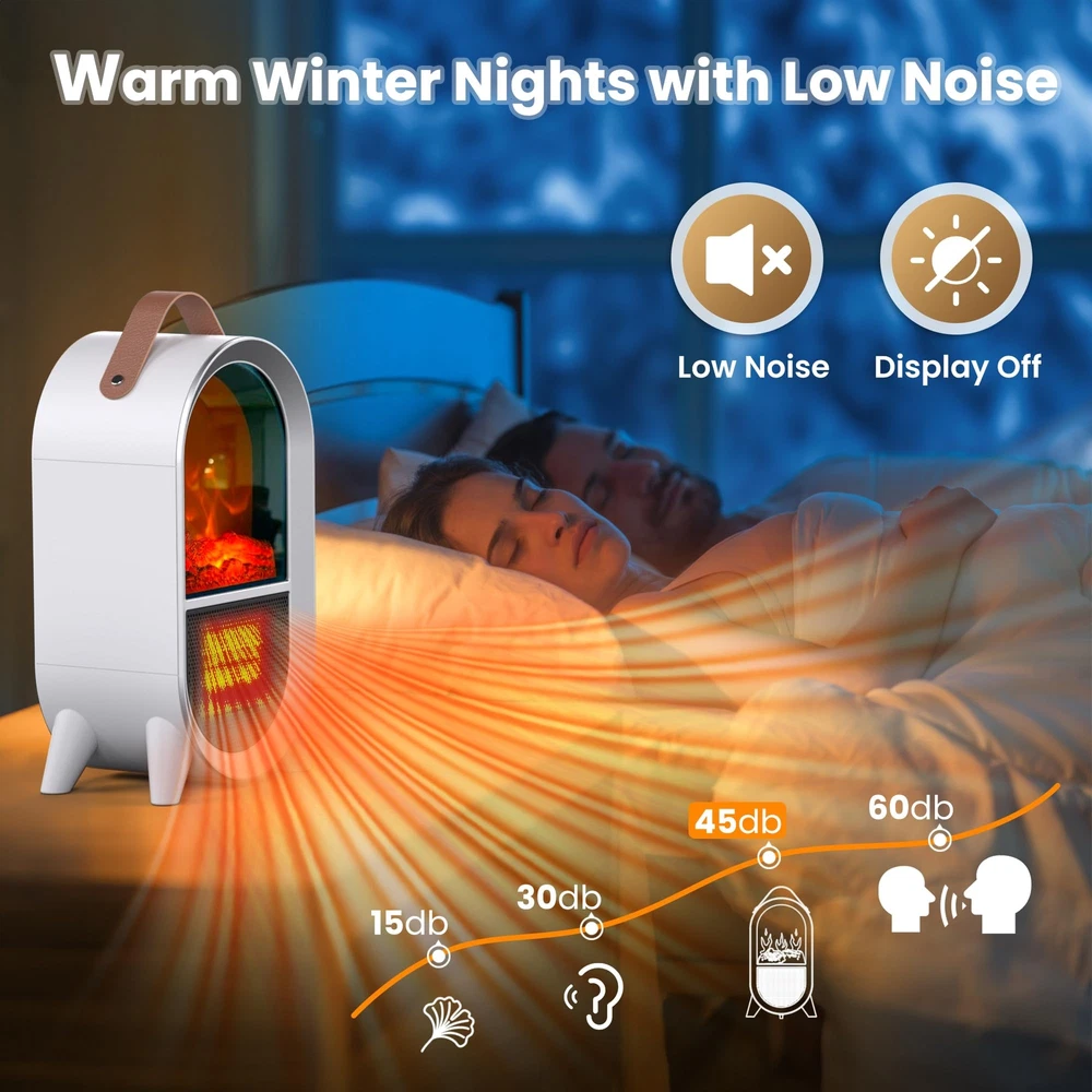2-IN-1 SPACE HEATER FAN: This small space heater utilizes ceramic heating technology and offers two heating levels, 1500W or 750W and a cool air fan that you can use in both winter and summer ADJUSTABLE THERMOSTAT: Adjust the thermostat to MIN, the heater will keep blowing cold air, adjust the thermostat to MAX, the heater will keep blowing hot air, with the thermostat in the middle, the heater will blow air to dissipate once the heater reaches the preset temperature, and then blow hot air again when the temperature falls below the thermostat setting REALISTIC 3D FLAME: This portable electric heater uses resin simulated charcoal to create a realistic 3D dynamic flame without smoke or noise, creating the ambiance of a real fireplace, adding warmth and comfort to your home TIP-OVER & OVERHEAT PROTECTION: This small fireplace heater is made of flame retardant material which effectively reduces any fire hazard. The overheat protection automatically shuts off the heater when it reaches a critical temperature. The tip-over protection system also shuts off the heater when it is accidentally knocked over, and after righting the heater, the heating function needs to be turned on again for added safety, perfect for families with children and pets PORTABLE AND POWERFUL: Our mini heater comes with a carrying strap, allowing you to easily move it to the space you want. Whether it's for your bedroom, living room, study, office or other space, its light weight and convenient design make it the best partner in winter