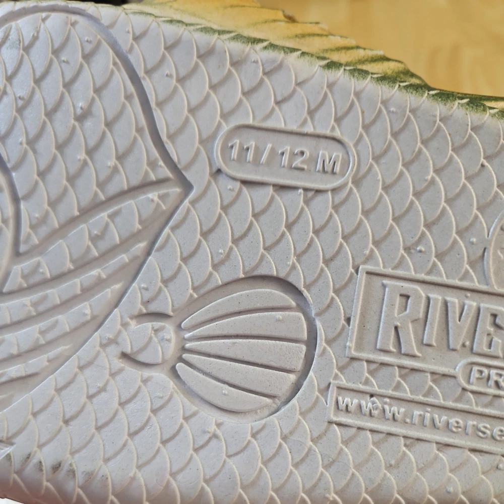 These Rivers Edge Bass Fish rubber slide sandals are designed for men in size 11/12 M. Featuring a fisherman character and fish pattern, these green sandals have a vintage style with a colorful and fun design. Made with a rubber outsole and upper material, these slide sandals are perfect for outdoor activities. The slip-on style and adjustable features make them easy to wear for any man looking for a unique and stylish footwear option.