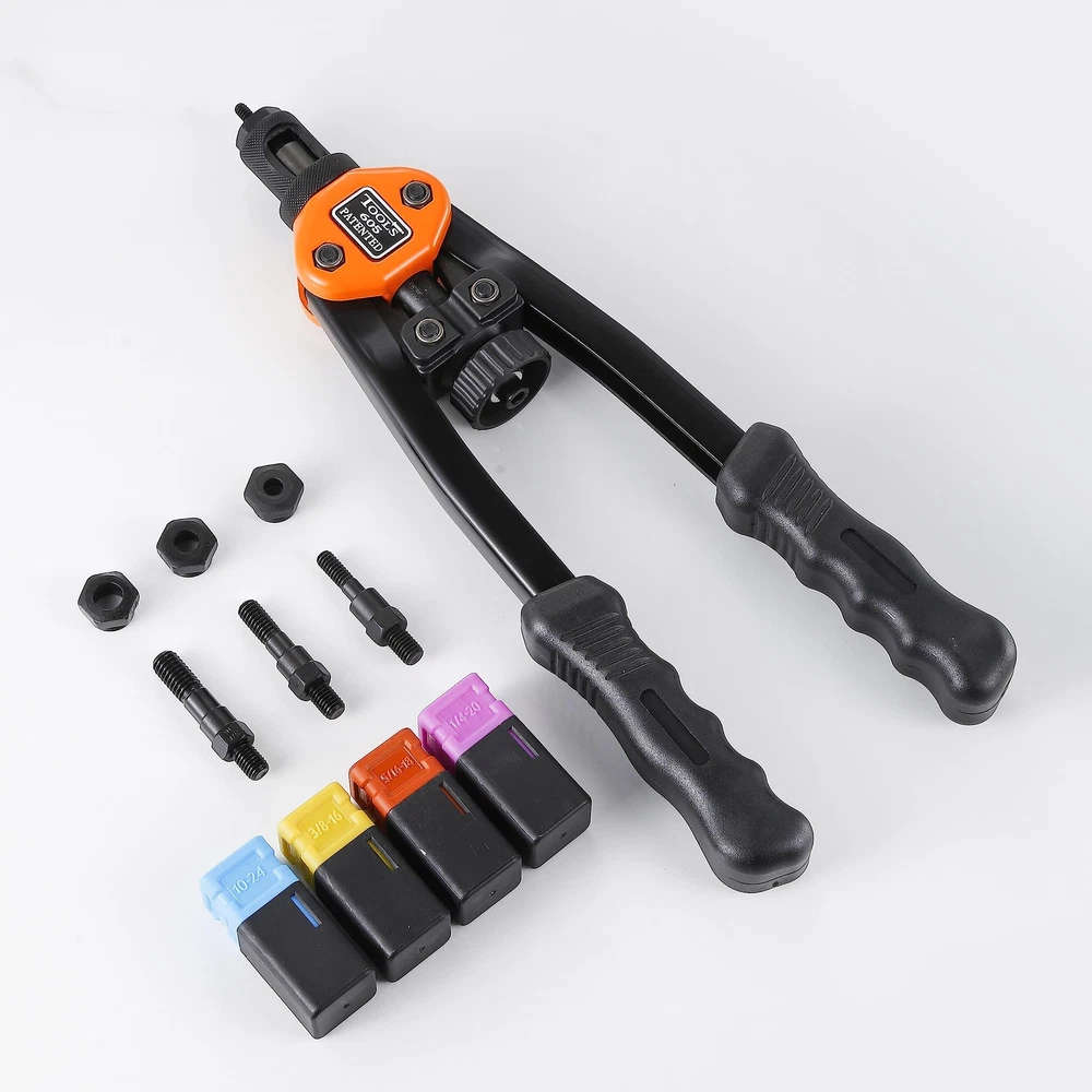 Our Rivet Nut Tool Comes With 4 Interchangeable Mandrels Sae 10-24 1/4-20 5/16-18 3/8-16) To Handle A Wide Range Of Applications.The mandrel of our rivet nut tool can be easily removed by hand.Our Hand Rivet Nut Tool Is Built To Last, With Mandrels Made From Heat-Treated Chrome Steel (40℃) And An Arm Made From 45 Carbon Steel. This Ensures Protection Against Corrosion And Resistance To Deformation.