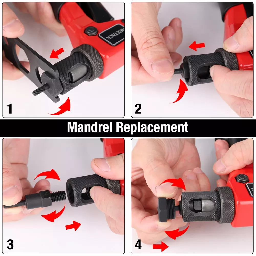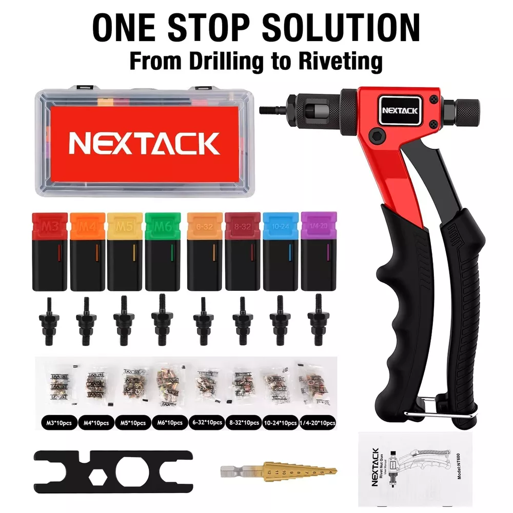 【Compact Design for Tight Space】The 8 inch right angle style make it easy for grab-and-go to solve out-of-reach riveting projects for confined narrow spots. it is ideal solution for small rivnut with single hand riveting, and for bigger rivnut attached like M6 & 1/4-20, it is better to use both hand operating. 【One-Stop-Solution】The nutsert tool kit is packed in a well-organized compartmented case for safe storage and convenient portability. It comes with a step drill bit, 8 universal interchangeable mandrels (4 SAE 6-32, 8-32, 10-24, 1/4-20 and 4 Metric M3, M4, M5, M6), 80 carbon steel threaded nuts (10 for each mandrel), & a professional user manual. 【Built to Last】The threaded insert hand riveter consists of quality steel arm with blacken and heating treatment, aluminum alloy body, and thick non-slip PVC grips. It prevents from corrosion and deformation and prolongs the lifecycle to ensure the strength, durablity and reliablity. 【Easy to Use】The nutsert rivet gun features single hand operation and modular detachable design for easy riveting, mandrels changing and maintenance, rotary knob structure for easy nut loading and releasing. 【Versatile Application】The threaded insert riveter tool kit can help you add attachedment with bolt on working piece like metal, fiberglass in different occasion like van wall, metalworking, railway, aviation, bicycle, off-road, RV and home modification. 【Warm Tips】Please note the mandrels are consumable and may be damaged with uneven pressure and improper use. We have addtional replacement mandrels M3 M4 M5 M6 6-32 8-32 10-24 10-32 1/4-20 here in our store. If any issue during using please message us.