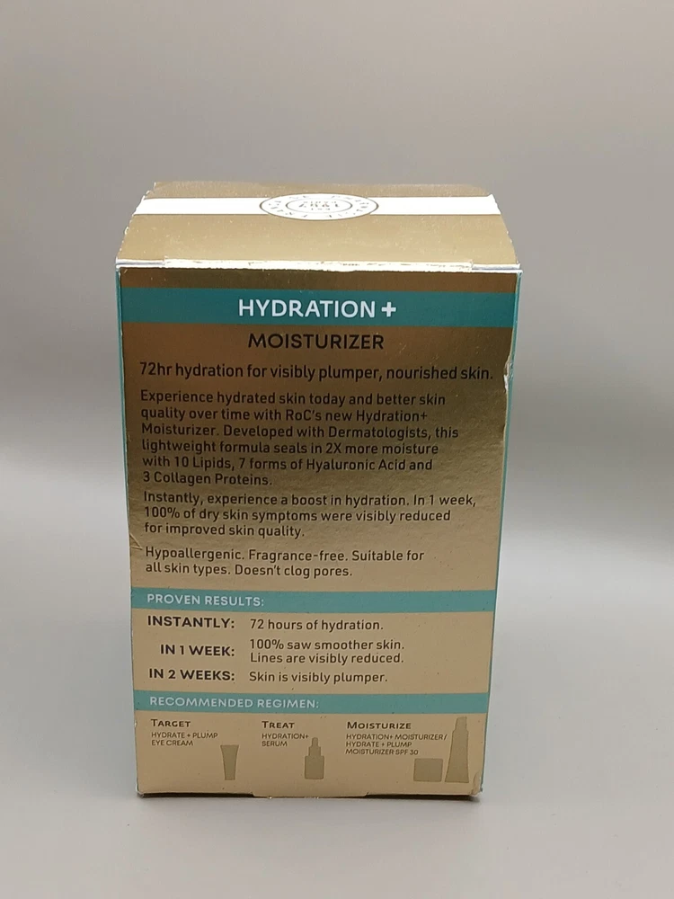 Product Description:- 🌿 RoC Hydration + Moisturizer – 1.7oz – Hyaluronic Acid & Collagen Proteins for Ultimate Hydration 🌿 Quench Your Skin’s Thirst with RoC Hydration + Moisturizer! Treat your skin to deep, lasting hydration with RoC Hydration + Moisturizer. This advanced formula combines the power of Hyaluronic Acid and Collagen Proteins to provide long-lasting moisture, leaving your skin feeling plump, smooth, and youthful. With consistent use, it helps enhance skin elasticity and firmness, giving your complexion a radiant, refreshed look. ✨ Why You’ll Love RoC Hydration + Moisturizer: 🌿 Lightweight, Yet Deeply Hydrating Say goodbye to heavy creams! RoC’s lightweight formula provides intense hydration without weighing your skin down, perfect for all skin types. 💧 24-Hour Hydration Feel hydrated all day long with just one application, as this moisturizer locks in moisture to keep your skin soft, smooth, and nourished. 🌱 Supports Skin Firmness & Elasticity Collagen Proteins help to smooth the skin and improve its natural firmness and elasticity, minimizing the appearance of fine lines and wrinkles. 🧴 Non-Greasy & Fast-Absorbing This non-greasy formula absorbs quickly into the skin, leaving no residue, so it’s ideal for everyday use, even for sensitive skin. 📅 Expiration Date: 03/26 Enjoy lasting hydration with this 1.7oz bottle, effective until its expiration in March 2026. Fresh, safe, and ready to use! 🚀 Why Choose RoC Hydration + Moisturizer? 🌿 Lightweight & Hydrating – Deeply nourishes without feeling heavy. 💧 24-Hour Hydration – Keeps your skin hydrated and smooth all day. 🌱 Improves Elasticity & Firmness – Collagen Proteins enhance skin texture. 🧴 Non-Greasy & Fast-Absorbing – Perfect for all skin types. Long Shelf Life – 1.7oz bottle lasting until March 2026. 💥 Fast Shipping – Order Now Before It’s Gone! Take advantage of fast, reliable shipping and start hydrating your skin today! Don’t miss out—limited stock available! 🔥 Give Your Skin the Hydration It Deserves Today! 🔥 Order RoC Hydration + Moisturizer now and give your skin the refreshing moisture boost it needs. Your skin will thank you! Thanks For Buying.