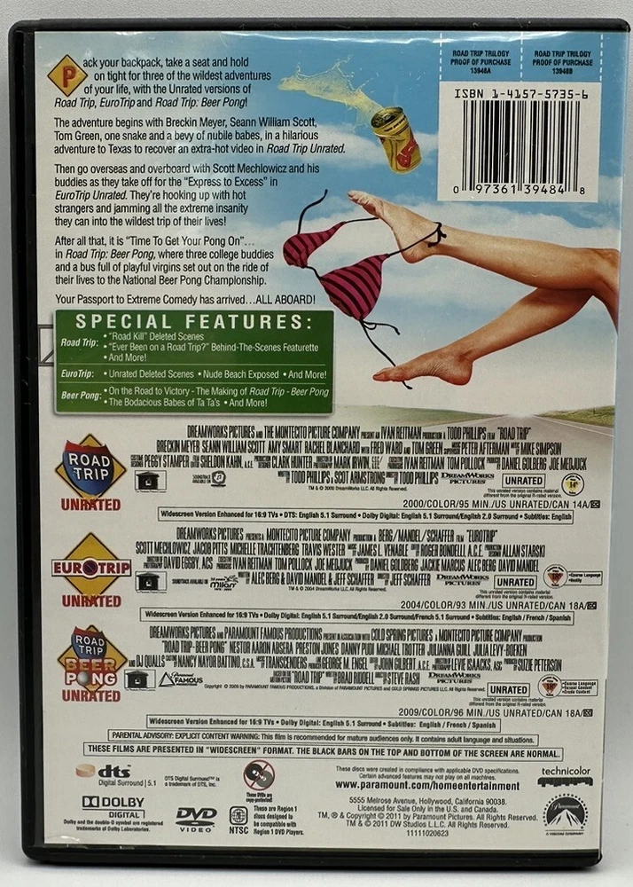 Get ready for a wild and hilarious ride with the Road Trip Trilogy: Unrated Collection on DVD. This dreamy travel comedy is a must-have for any movie lover, featuring various directors and a talented actor named Tom Green. The collection includes all three movies in the trilogy, showcasing the best of the best. Experience the abstract cinematic movement and laugh out loud at the hilarious antics of the characters. This DVD set is in NTSC format and features widescreen capabilities. Rated NR and released in 2011 by DreamWorks, this unrated collection is a great addition to any movie library. Region code DVD: 1 (US, Canada...).