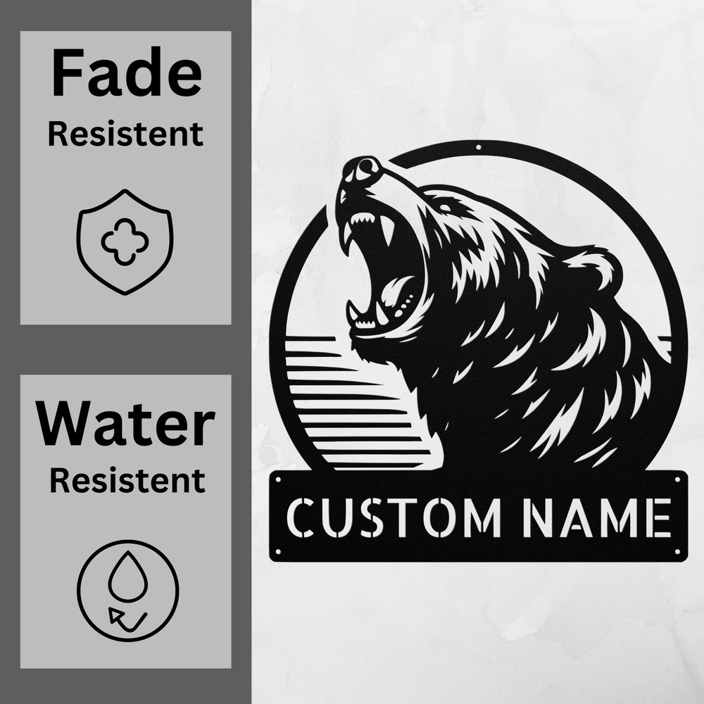 Product Description Custom Roaring Bear Metal Sign Animal Decor Wall Art Gift for Nature Lovers Add a touch of nature to your space with this Custom Roaring Bear Metal Sign ! Made from high-quality 16 gauge metal, this striking animal decor piece is perfect for nature lovers and wildlife enthusiasts. Its durable powder coating ensures it is resistant to dust, weather, and water, making it suitable for both indoor and outdoor use. This personalized sign makes a great gift for Christmas, birthdays, or any special occasion. Whether you want to celebrate your love for wildlife or enhance your own home or office decor, this sign is sure to impress. Key Features: Customizable Design : Personalize with names or initials for a unique touch. High-Quality Material : Crafted from sturdy 16 gauge metal for long-lasting durability. Weather Resistant : Powder-coated finish protects against dust and moisture. Versatile Decor : Perfect for both indoor and outdoor display. Great Gift Idea : Ideal for nature lovers or as a unique home decor piece. Celebrate the majestic beauty of bears with this eye-catching metal sign. It’s not just decor; it’s a tribute to your passion for the great outdoors. Order yours today! Service and Color Choice Our metal signs are designed to be personalized just for you, making them the perfect addition to any space! The default color for our signs is Black , but we also offer a variety of beautiful options including Copper, Gold, White, and Silver . After placing your order, simply contact us with your preferred color choice, and we'll ensure your sign is exactly how you envision it. Let’s create something special together!