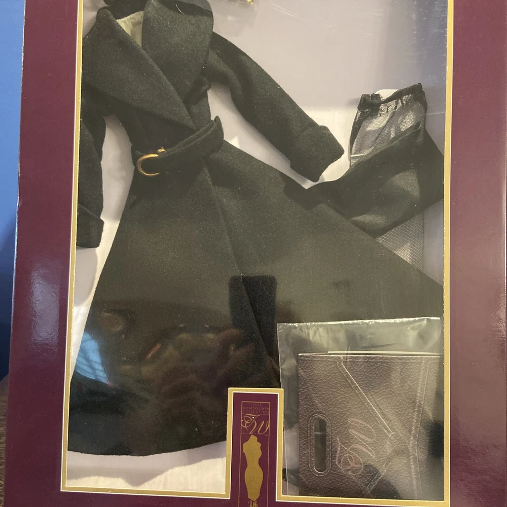 This Robert Tonner 16" Cashmere Noir Outfit is part of the Tyler Wentworth Collection from 1999. It includes a black coat/jacket, scarf, outfit, jewelry, shoes, sunglasses, and hosiery, all designed for a fashion doll. This limited edition outfit is vintage and features a stylish outerwear clothing style suitable for all occasions. Made of cloth material, it is compatible with 16" dolls and has a fashion & beauty theme.
